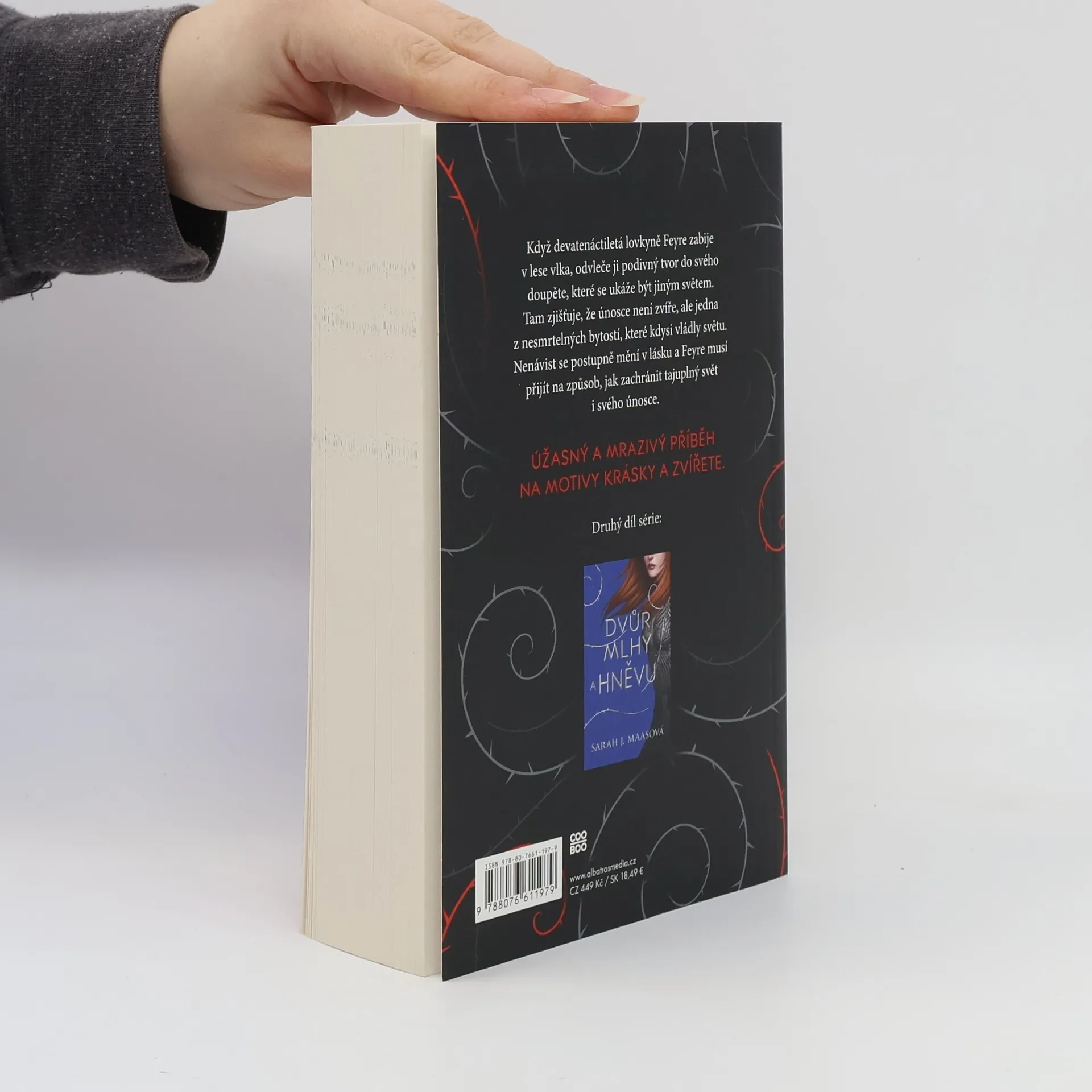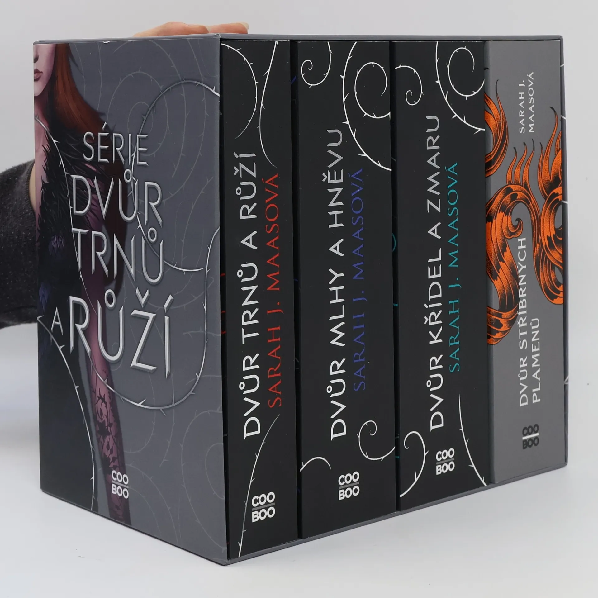 Série Dvůr trnů a růží v jednom boxu.Když devatenáctiletá lovkyně Feyre zabije v lese vlka, odvleče ji podivný tvor do svého doupěte, které se ukáže být jiným světem. Tam zjišťuje, že únosce není zvíře, ale jedna z nesmrtelných bytostí, které kdysi vládly světu. Nenávist se postupně mění v lásku a Feyre musí přijít na způsob, jak zachránit tajuplný svět i svého únosce. Úžasný a mrazivý příběh na motivy Krásky a Zvířete.