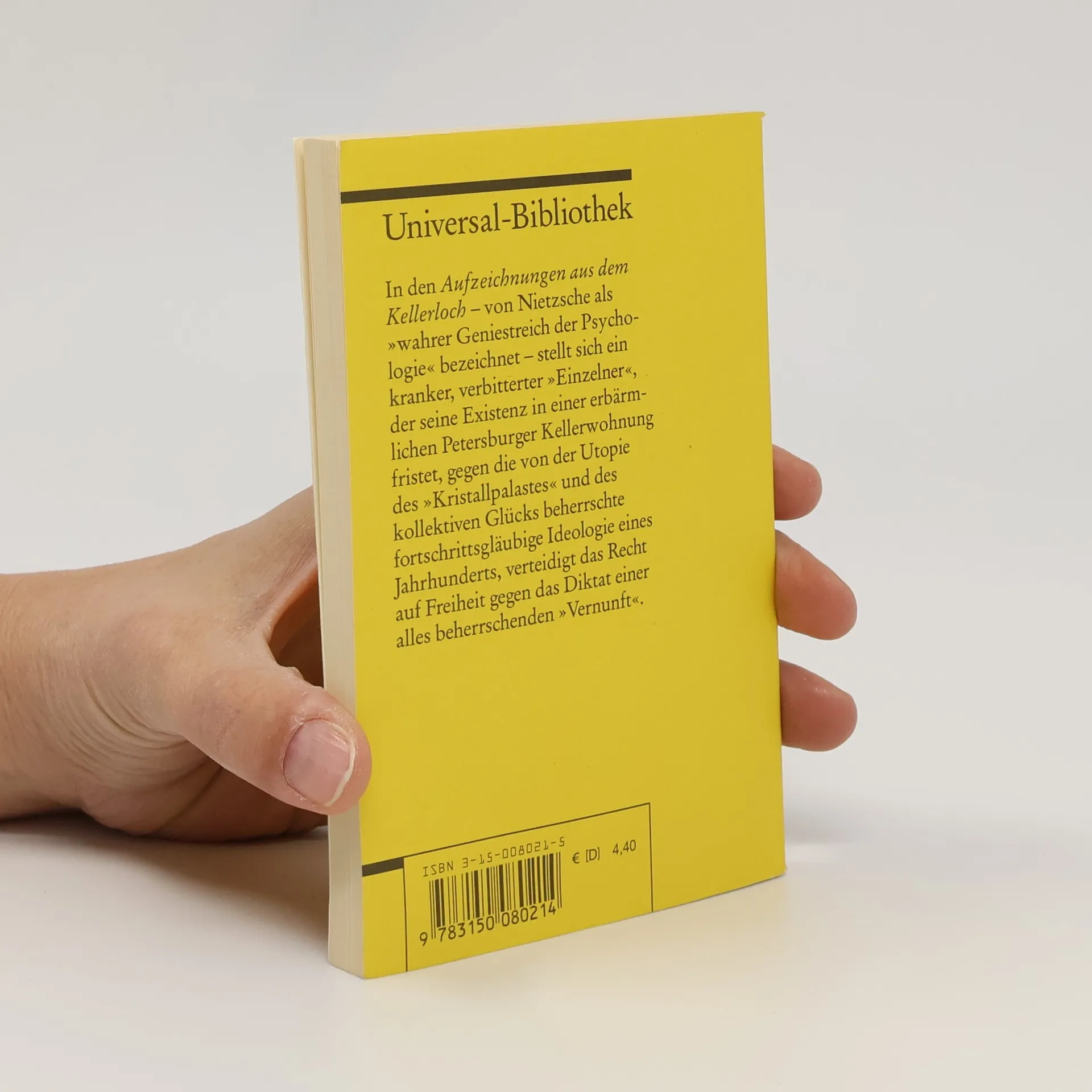 In den »Aufzeichnungen aus dem Kellerloch« von Nietzsche als »wahrer Geniestreich der Psychologie« bezeichnet - stellt sich ein kranker, verbitterter »Einzelner«, der seine Existenz in einer erbärmlichen Petersburger Kellerwohnung fristet, gegen die von der Utopie des »Kristallpalastes« und des kollektiven Glücks beherrschte fortschrittsgläubige Ideologie eines Jahrhunderts, verteidigt das Recht auf Freiheit gegen das Diktat einer alles beherrschenden »Vernunft«.
