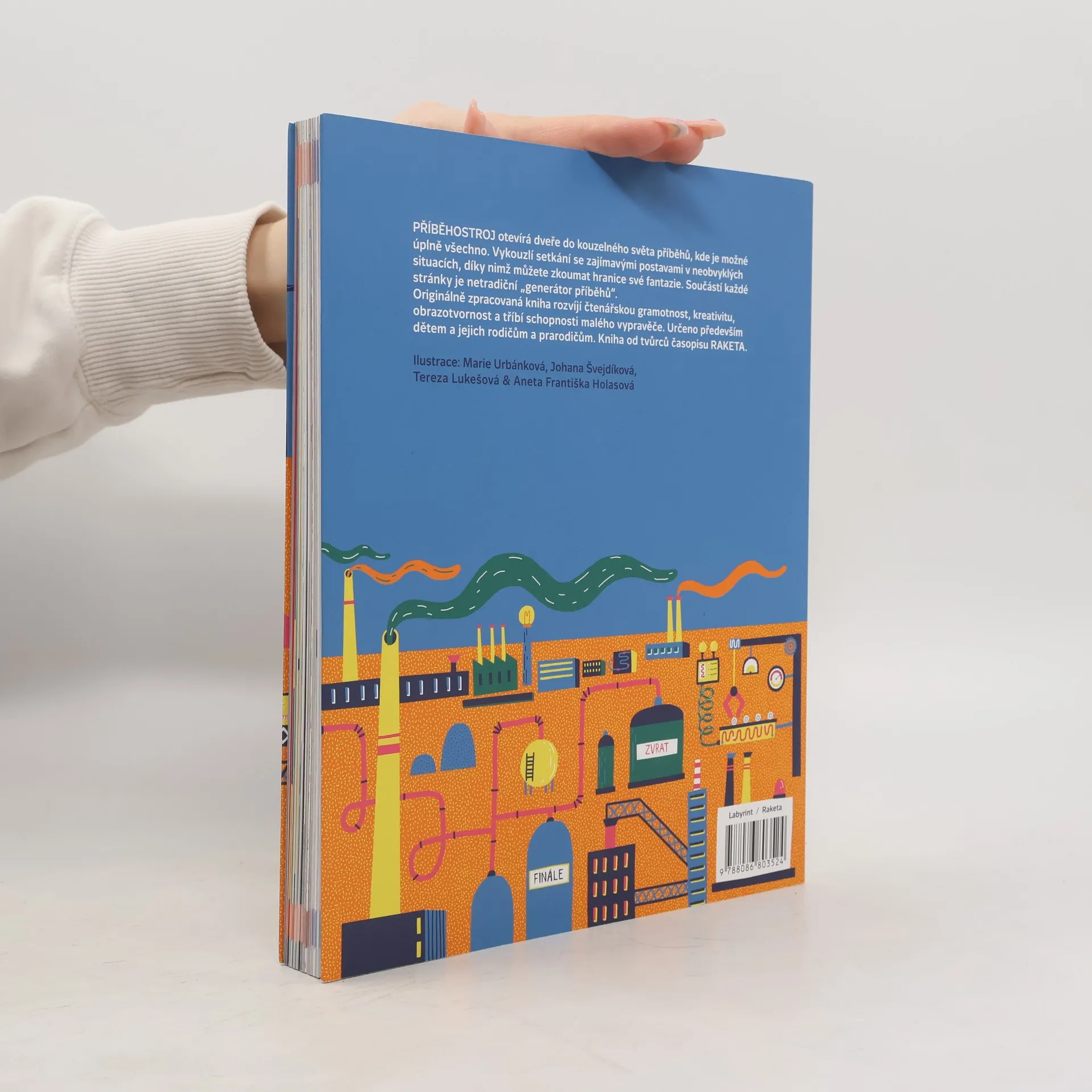 Příběhostroj dětem otevírá dveře do kouzelného světa příběhů, kde je možné úplně všechno. Vykouzlí setkání se zajímavými postavami v neobvyklých situacích, díky nimž mohou děti zkoumat hranice své fantazie. Součástí knihy je netradiční „generátor příběhů“ — během vyprávění se losují náhodné postavy, předměty či situace umístěné v rozích každé stránky. Originálně zpracovaná kniha rozvíjí čtenářskou gramotnost, kreativitu, obrazotvornost a tříbí schopnosti vypravěče. Bohatě ilustrované zábavné úkoly a hry jsou rozděleny do čtyř úrovní od začátečníka až po mistra Příběhostroje. Psát, lepit i kreslit do knihy je dovoleno. Určeno především malým čtenářům od 6 let do 12 let a jejich rodičům a prarodičům. Nová kniha od tvůrců časopisu RAKETA.