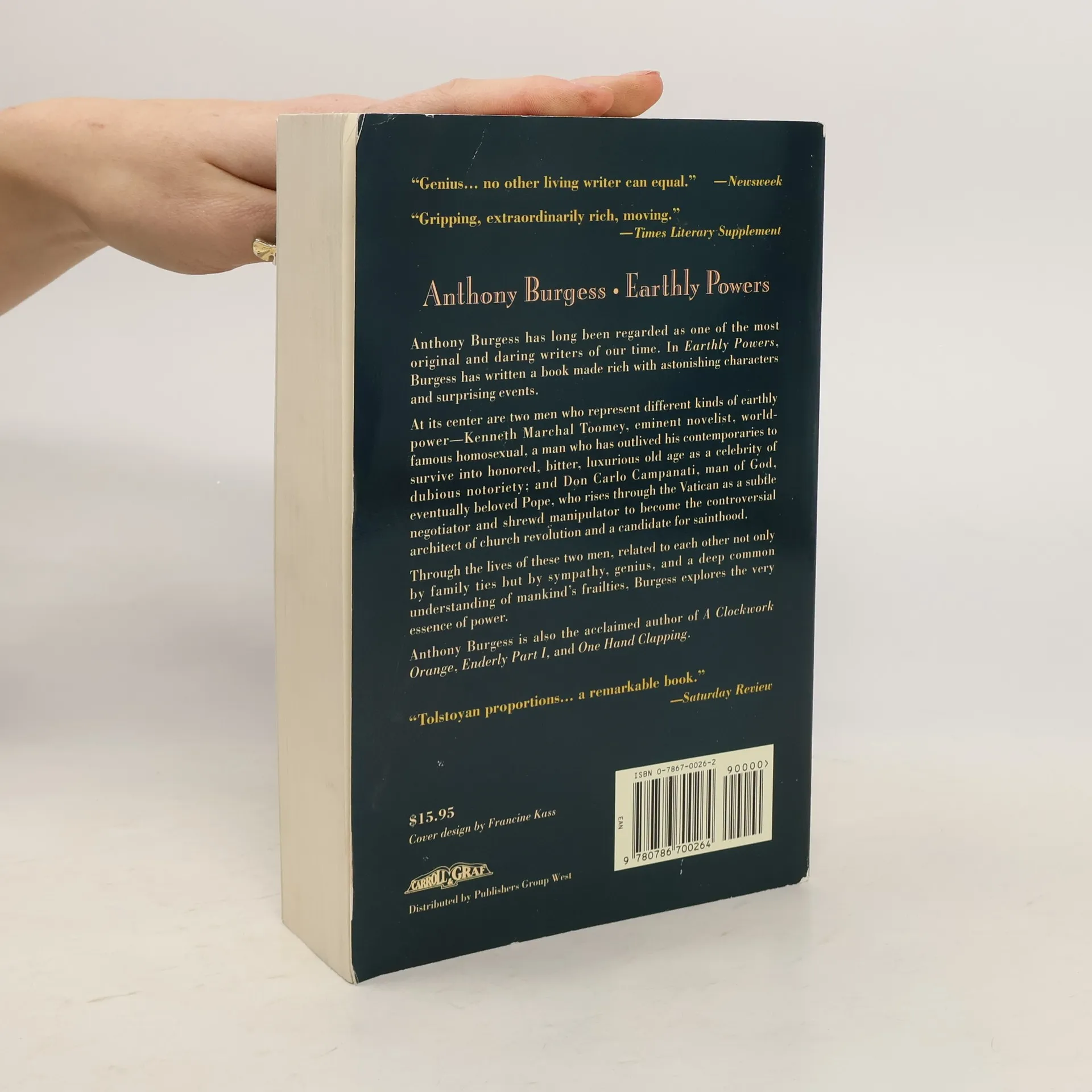 Book jacket/from back: Anthony Burgess has long been regarded as one of the most original and daring writers of our time. In Earthly Powers, Burgess has writtena book rich with astonishing powers and surprising events.