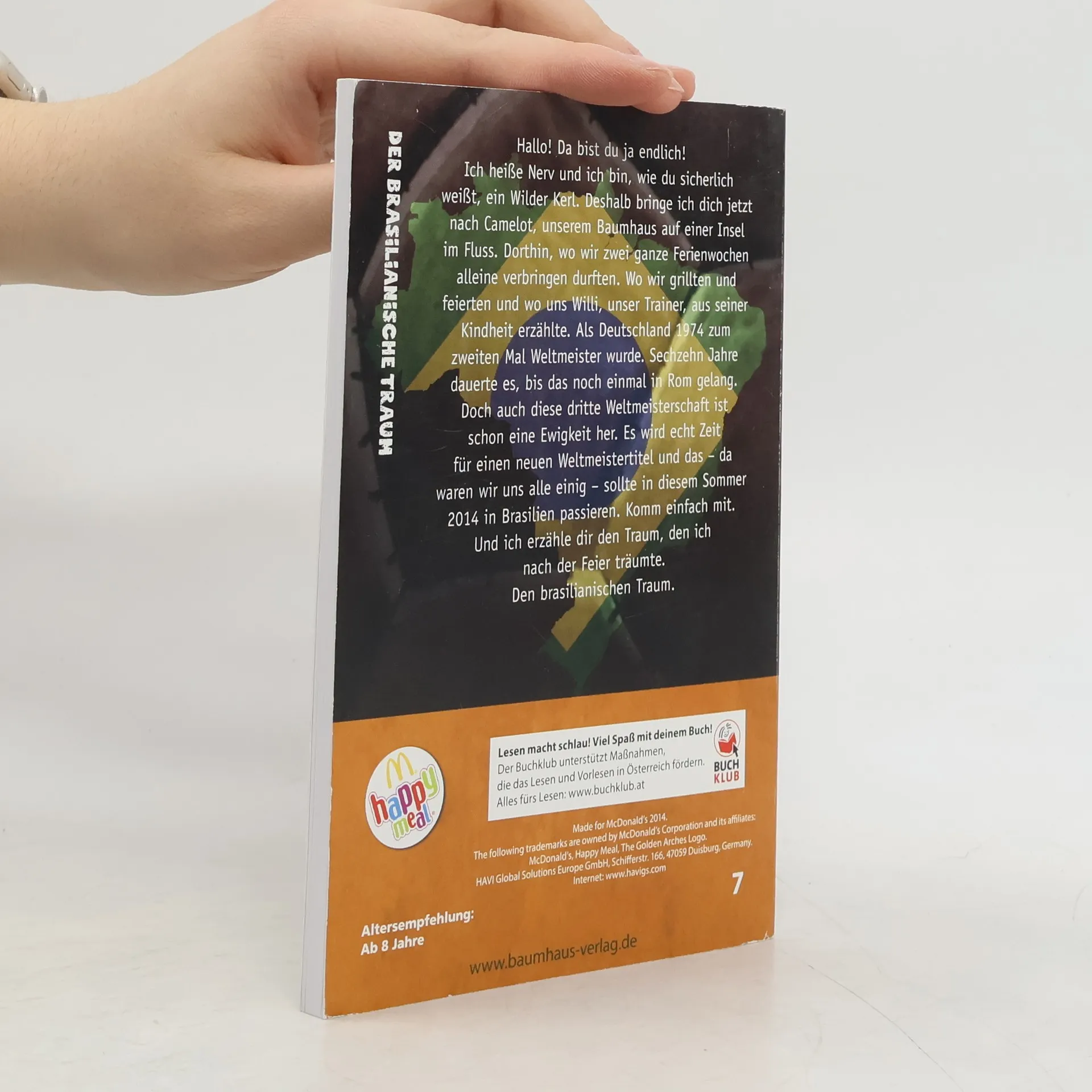 Hallo! Da bist du ja endlich!Ich heiße Nerv und ich bin, wie du sicherlich weißt, ein Wilder Kerl. Deshalb bringe ich dich jetzt nach Camelot, unserem Baumhaus auf einer Insel im Fluss. Dorthin, wo wir zwei ganze Ferienwochen alleine verbringen durften. Wo wir grillten und feierten und wo uns Willi, unser Trainer, aus seiner Kindheit erzählte. Als Deutschland 1974 zum zweiten Mal Weltmeister wurde. Sechzehn Jahre dauerte es, bis das noch einmal in Rom gelang. Doch auch diese dritte Weltmeisterschaft ist schon eine Ewigkeit her. Es wird echt Zeit für einen neuen Weltmeistertitel und das - da sind wir uns alle einig - sollte in diesem Sommer 2014 in Brasilien passieren. Komm einfach mit. Und ich erzähle dir den Traum, den ich nach der Feier träumte. Den brasilianischen Traum.