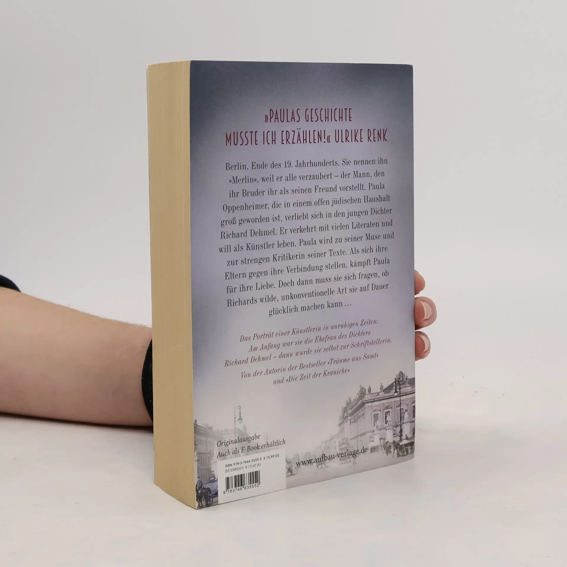 „Paulas Geschichte musste ich erzählen!“ Ulrike Renk. Berlin, Ende des 19. Jahrhunderts. Paula Oppenheimer spielt begeistert Klavier aber ihre große Leidenschaft sind die Worte. In ihrer Familie ist sie bekannt für ihre Reime und Sprachspiele. Da ihre Eltern sich jedoch eine weiterführende Ausbildung nicht leisten kann, zieht sie schweren Herzens zu ihrer vermögenden Tante. Von ihr wird sie in die Berliner Kunst- und Literaturwelt eingeführt, besucht Museen, Theater und die Oper. Gemeinsam veranstalten die beiden Frauen einen Salon, in dem sich die Berliner Bohème trifft. Dann lernt Paula den Dichter Richard Dehmel kennen. Die beiden verlieben sich unsterblich, Paula wird zu seiner Muse und strengen Kritikerin. Als sich ihre Eltern gegen die Verbindung stellen, kämpft Paula für ihre Liebe. Doch dann wird ihr mehr und mehr bewusst, dass Richards wilde und unkonventionelle Art sie auf Dauer nicht glücklich machen kann. Angetrieben von einem starken Willen und ihrer eigenen Kreativität zieht sie ihre Konsequenzen … Von der Autorin der Bestseller „Träume aus Samt“ und „Die Zeit der Kraniche“. Die neue Saga der Bestsellerautorin Ulrike Renk.