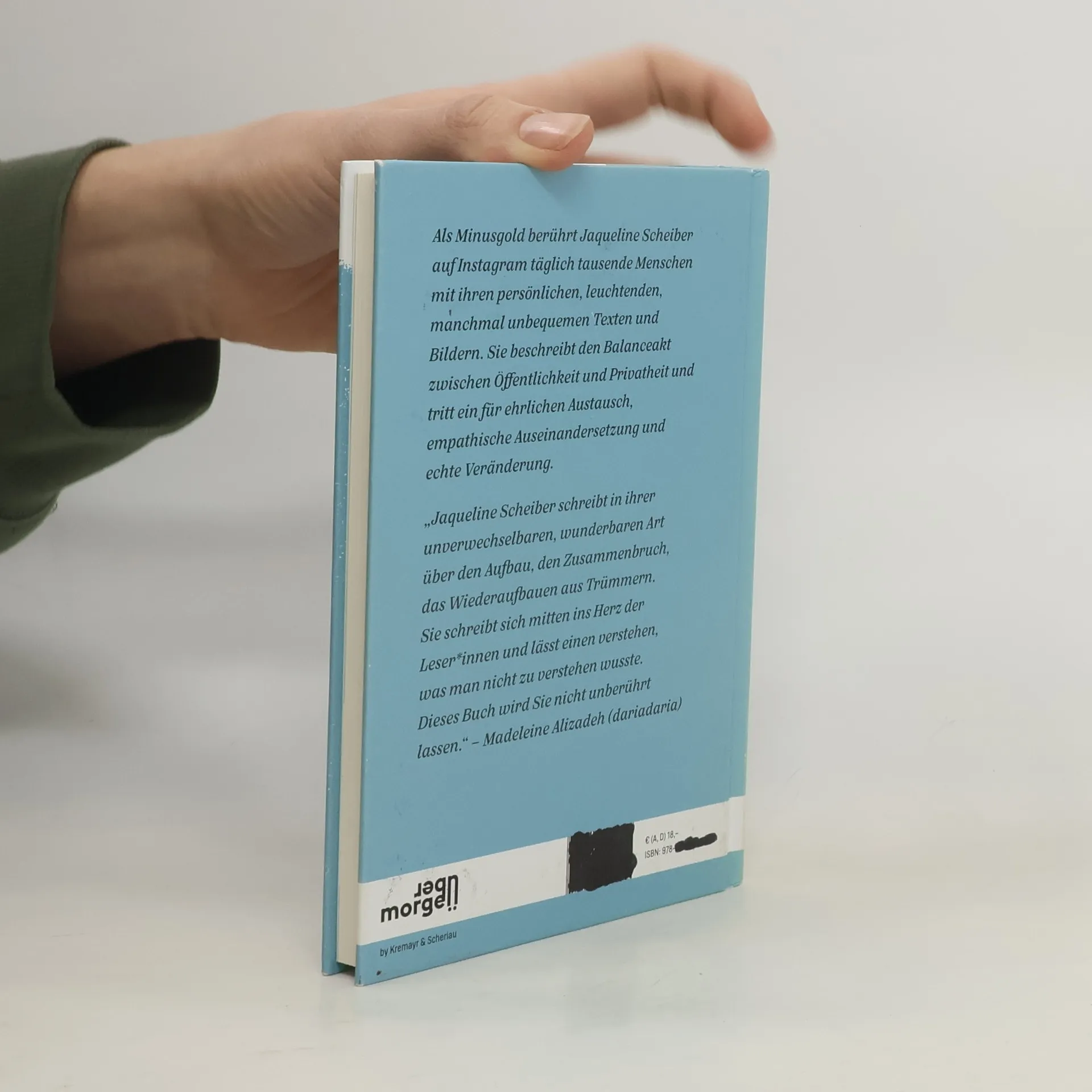Eine junge Frau verfasst einen Tag, nachdem ihr Partner plötzlich verstirbt, einen Instagram-Post darüber. Sie präsentiert ihren von Dehnungsstreifen übersäten Bauch dreißigtausend Menschen. Sie macht ihre psychische Erkrankung öffentlich, auch auf die Gefahr hin, stigmatisiert zu werden. Jaqueline Scheiber öffnet jeden Tag ein virtuelles Fenster zu ihrer Welt. Als minusgold berührt sie auf Instagram mit sehr persönlichen, leuchtenden, manchmal unbequemen Posts. So entsteht ein Raum für Erfahrungen anderer, die sich mit ihren eigenen zu einem dichten Netz an Anteilnahme und Unterstützung verweben. Doch was für die einen mutig ist, stößt bei anderen auf Ablehnung. Jaqueline Scheiber reflektiert präzise, warum sie es für unerlässlich hält, die eigene Stimme zu erheben und gehört zu werden. Sie beschreibt den Balanceakt zwischen Öffentlichkeit und Privatheit und tritt den Beweis an, dass „radical softness as a weapon“ (Lora Mathis) die Basis ist für ehrlichen Austausch, empathische Auseinandersetzung und echte Veränderung.