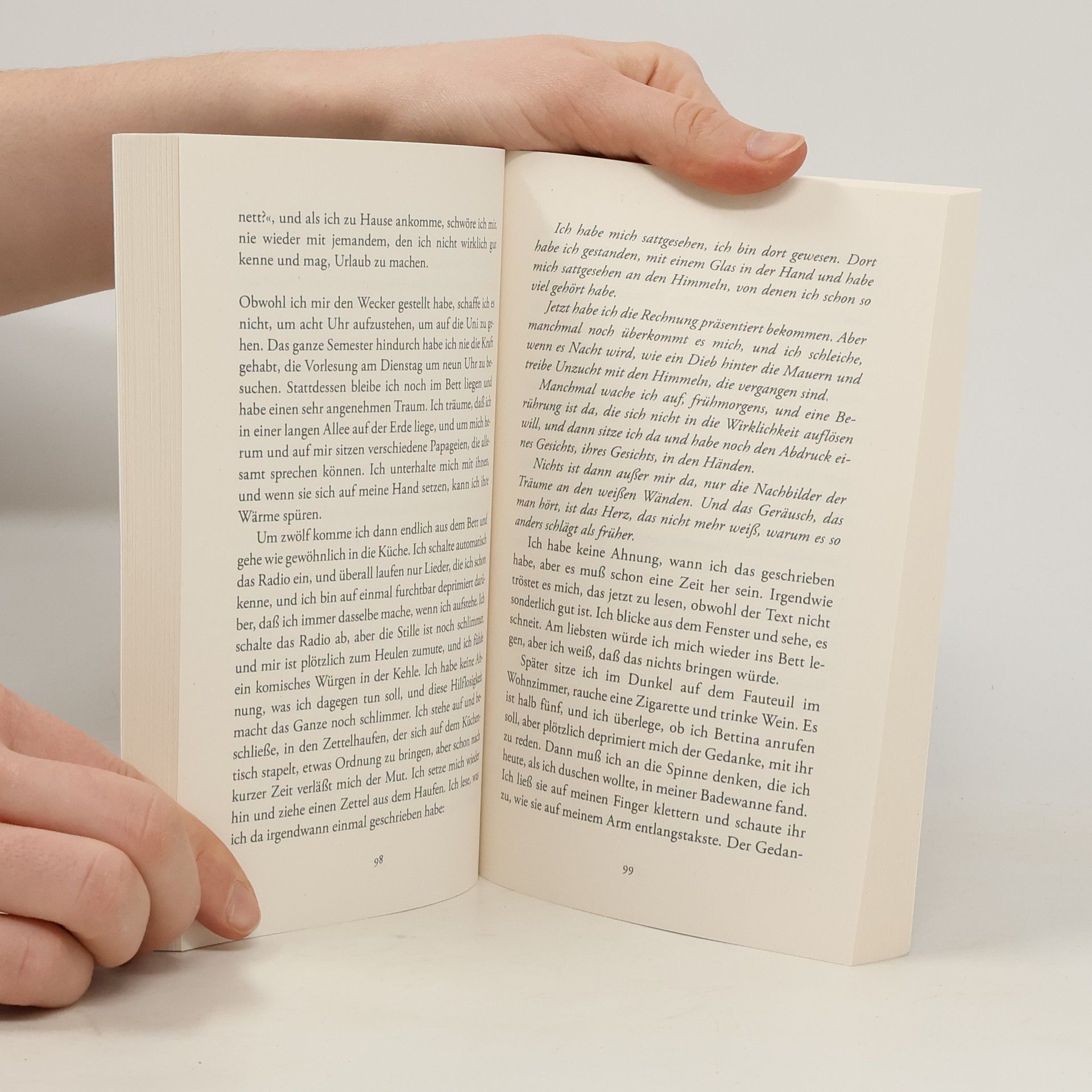 Er ist Anfang zwanzig. Niemand soll sagen, daß das die schönste Zeit im Leben ist. Die Tage verlaufen in zäher Gleichförmigkeit. Aber warum fällt ihm auch nichts anderes ein, als in Lokale zu gehen, die gerade angesagt sind, sich durch die Stadt treiben zu lassen und auf die Einladung zur nächsten Vernissage zu warten? Einzig die Musik öffnet Freiräume, manchmal zumindest. Sonst sind die Tage von gleichsam rituellen Abläufen geprägt. Er stellt sich eine Zählmaschine vor, die bei jeder Handlung, bei jedem Musikstück, bei jedem Weg anzeigt, das wievielte Mal es gerade ist - und nach 9999 springt sie wieder auf Null. Er nimmt Posen ein: Stilisierung ist eine Möglichkeit, unbestimmte Trauer eine andere. Doch sie überdecken den Riß in diesem Leben, dem jedes Zeichen äußerer Tragik fehlt, nicht lange. "Heute könnte ein glücklicher Tag sein" bleibt als letzte, durch Zynismus getarnte Hoffnung des Protagonisten einer Generation, für die, wie es einmal hieß, Krieg leichter zu ertragen ist als ein Montagmorgen.