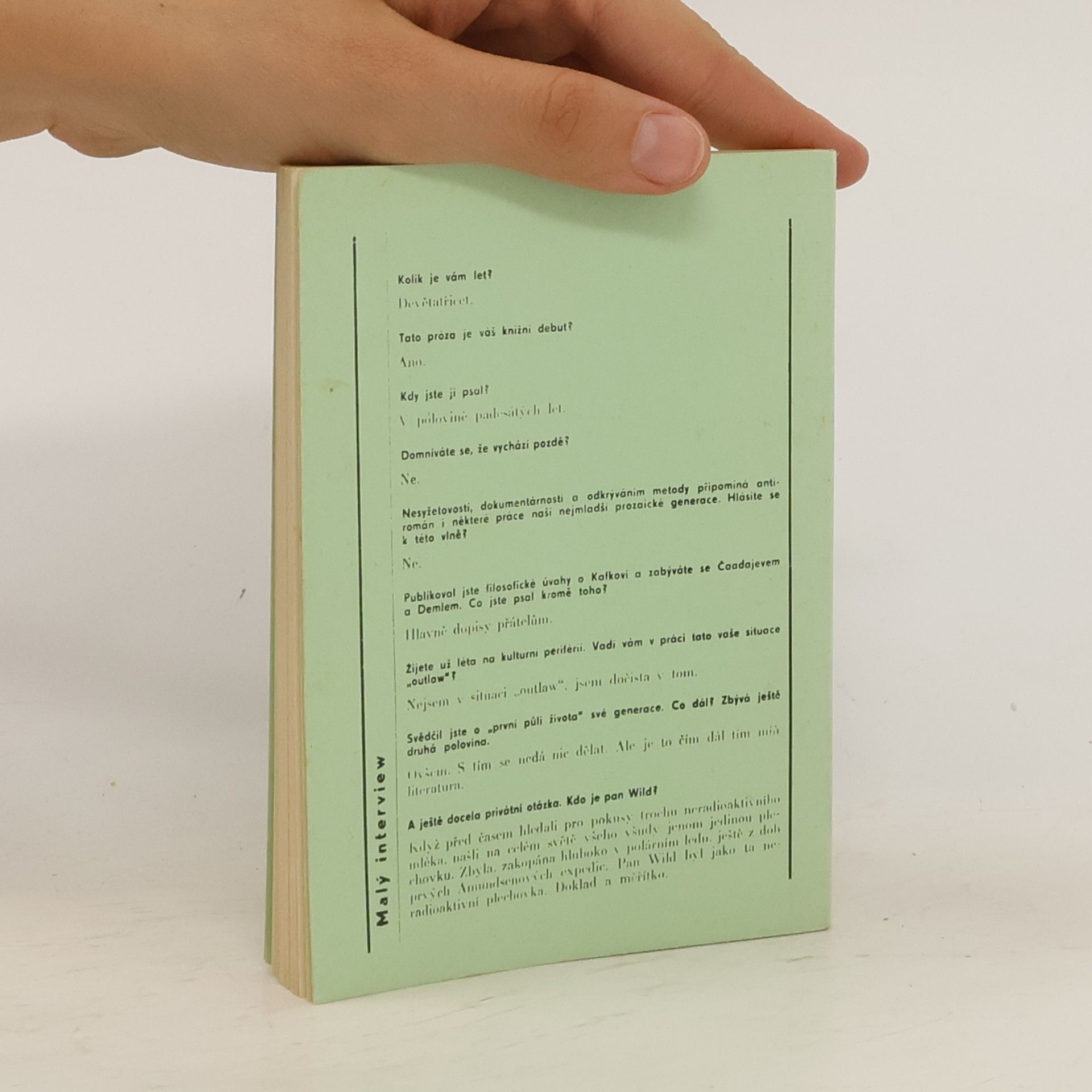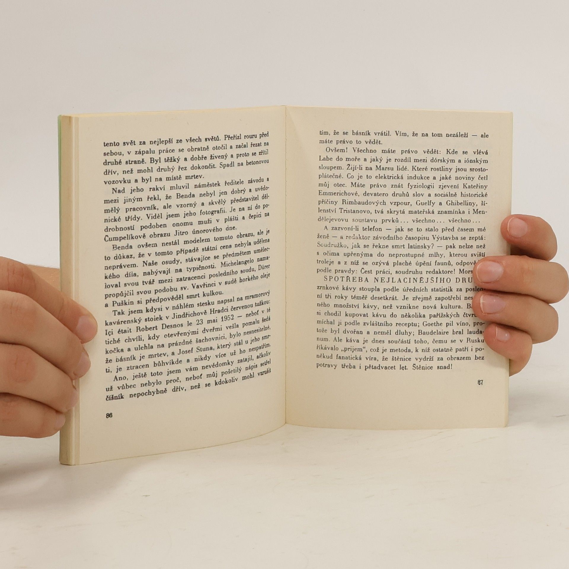 Tento román vyšel poprvé v roce 1966 v cenzurovaném vydání, v plném znění vyšla kniha v roce 1994. Ve volném toku myšlenek, příběhů a poznámek se zde kriticky nahlíží na realitu padesátých let. Autor přibližuje počáteční nadšení a odhodlání budovat socialismus. Příběhy se odehrávají v Praze a v Litvínově. Na atmosféru doby se zde nahlíží velice kriticky. V krátkých příbězích jsou zde nastíněny osudy lidí z různých odvětví, od soukromníka- zhotovitele rakví, kterého režim připravil o živnost. Vdovy po lékaři, která je ve své samotě vděčná za lidské slovo. Až po dělníky dojíždějící po ránu do továren a po večerech chodících do veřerních škol. Veškerá atmosféra je díky neobvyklé literární formě líčena velice sugestivně.