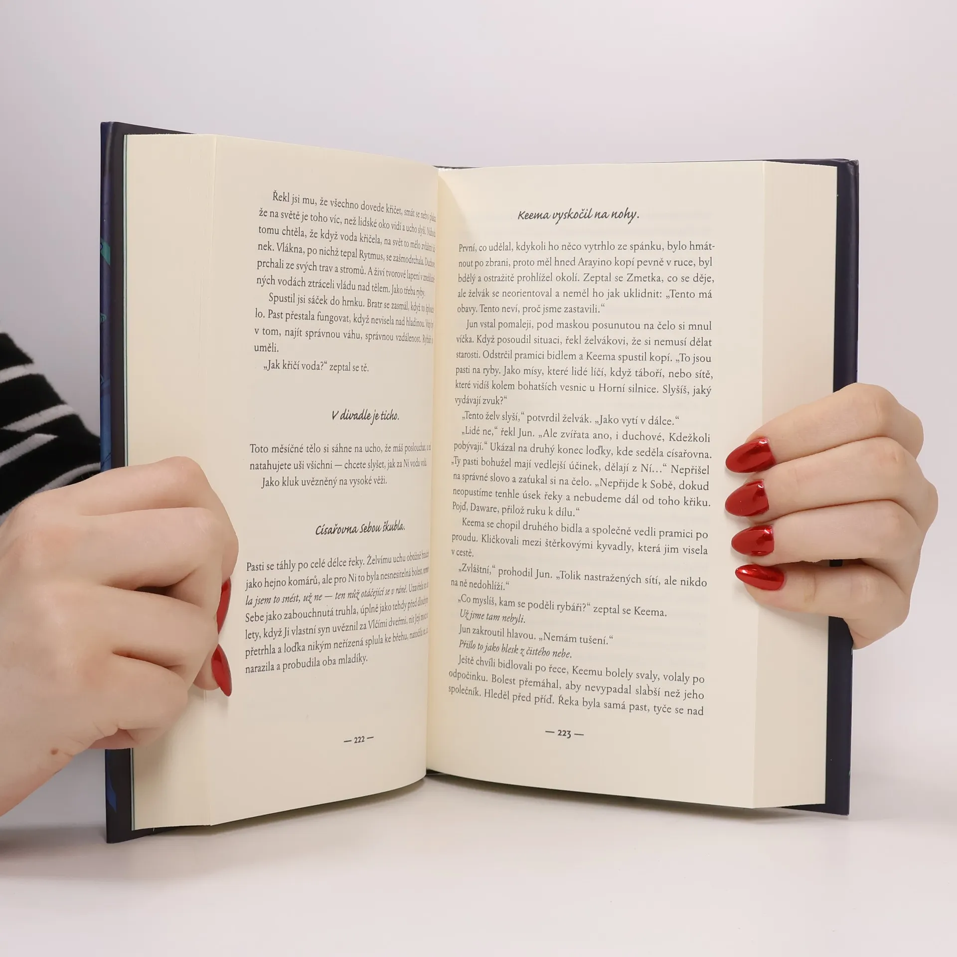 V nové epické fantasy od autora Ztracených ptáků provázejí dva bojovníci prastarou bohyni rozvrácenou zemí, aby ukončili tyranskou vládu královského rodu. Lidé trpí pod staletou vládou Měsíčního trůnu. Despotický císař a jeho zrůdní synové, Tři postrachové, drží zemi v dusivém sevření. Vykořisťují krajinu a utlačují lid děsivou mocí, kterou získali od bohyně vězněné pod jejich palácem. Nejjasnější Měsíc, Požehnanou Lunu však nelze držet navždy. S pomocí Juna, strážce pronásledovaného svou minulostí, a Keemy, vyděděnce bojujícího o svou budoucnost, se bohyni podaří uprchnout. Se svými mladými společníky se vydává na pouť za svobodou - v naději, že se jí podaří navždy s Měsíčním trůnem skoncovat. Avšak cesta, která je čeká, bude nebezpečnější, než si kdokoli z nich dokázal představit. Kopí protne vodu je ambiciózní dobrodružný příběh a zároveň niterné zkoumání identity, dědictví a sounáležitosti, které vás strhne a promění, protože se nepodobá ničemu, co jste kdy četli.