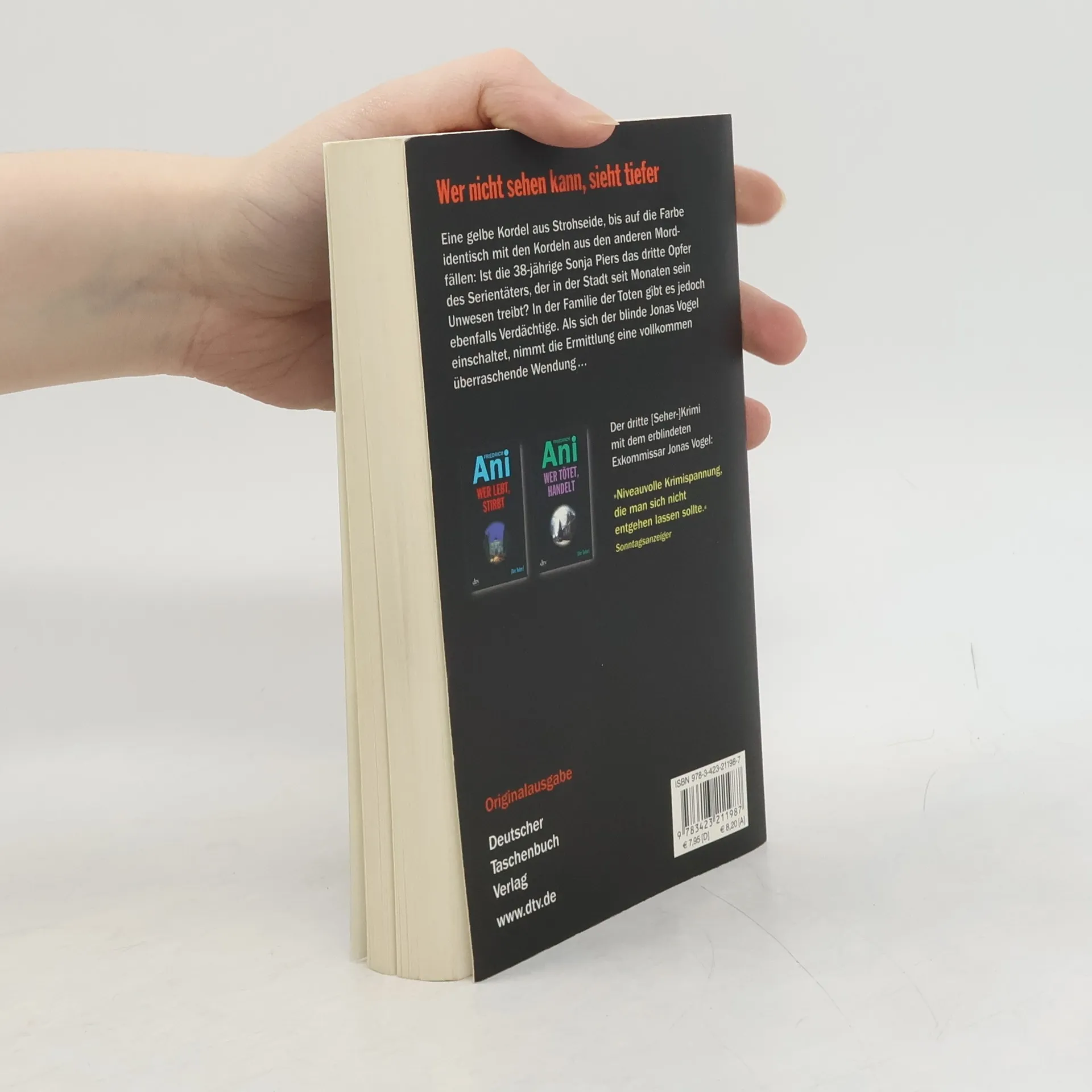 Wer nicht sehen kann, sieht tiefer Eine einfache gelbe Kordel aus Strohseide, bis auf die Farbe identisch mit den Kordeln aus den anderen Mordfällen: Ist die 38-jährige Sonja Piers das dritte Opfer eines Serienmörders, der in der Stadt seit Monaten sein Unwesen treibt? Jedoch gibt es in der Familie des Opfers ebenfalls Verdächtige, findet Hauptkommissar Max Vogel: Sowohl der 17-jährige Sohn Benjamin als auch dessen Vater Hannes Piers verstricken sich in Widersprüche. Als ein Zeuge aussagt, Sonja Piers unmittelbar vor ihrem Tod mit einem Mann gesehen zu haben, schaltet sich der blinde Jonas Vogel ein. Die Ermittlung nimmt eine vollkommen überraschende Wendung ...