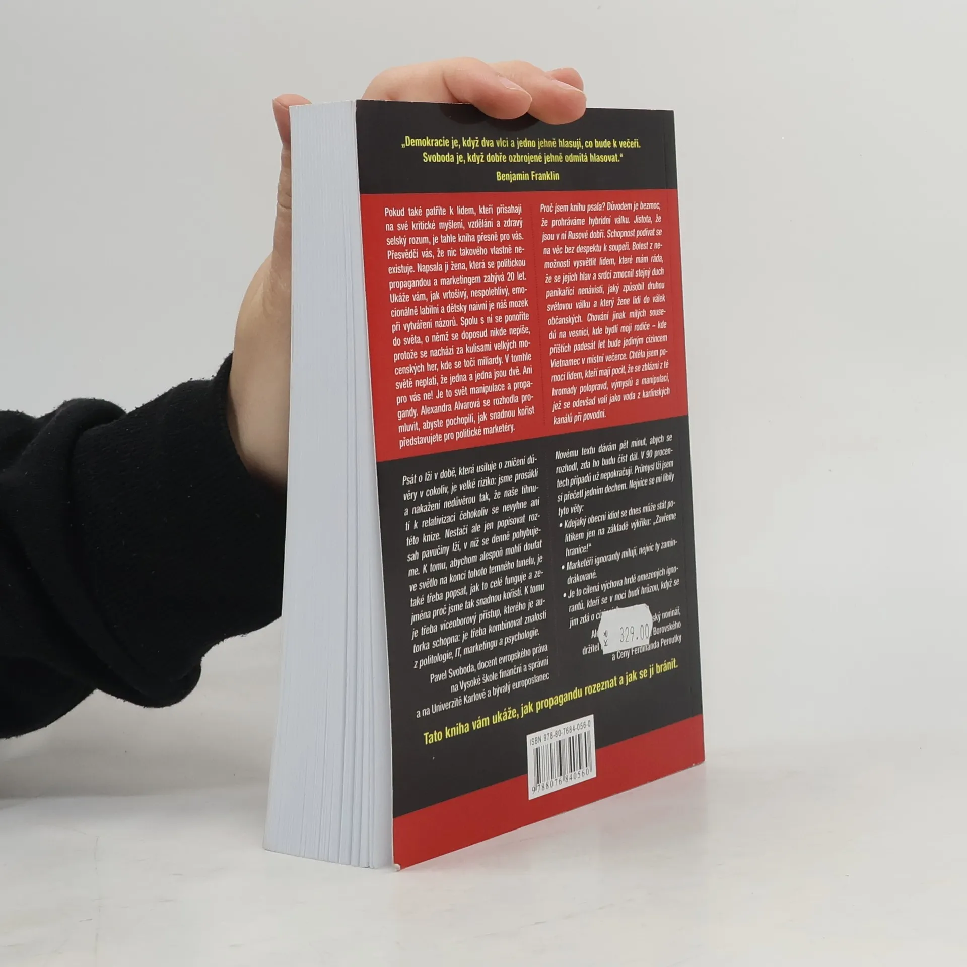Publikace věnovaná politické propagandě současnosti. Autorka v textu ukazuje, jak propagandu rozeznat a jak se jí můžeme efektivně bránit.Publicistka Alexandra Alvarová odhaluje zákulisí dezinformační války, kterou s pomocí moderních komunikačních technologií vedou vybrané velmoci proti Západu a hodnotám, které vyznává euroatlantická civilizace. Jejich cílem je rozdělit společnost, rozšířit mezi lidmi nenávist, zpochybnit dosavadní jistoty. Text detailně popisuje metody a prostředky, které dnešní političtí marketéři používají k ovlivňování veřejného mínění. Autorka k analýze současné situace používá poznatky z oblasti politologie, IT, marketingu a psychologie.