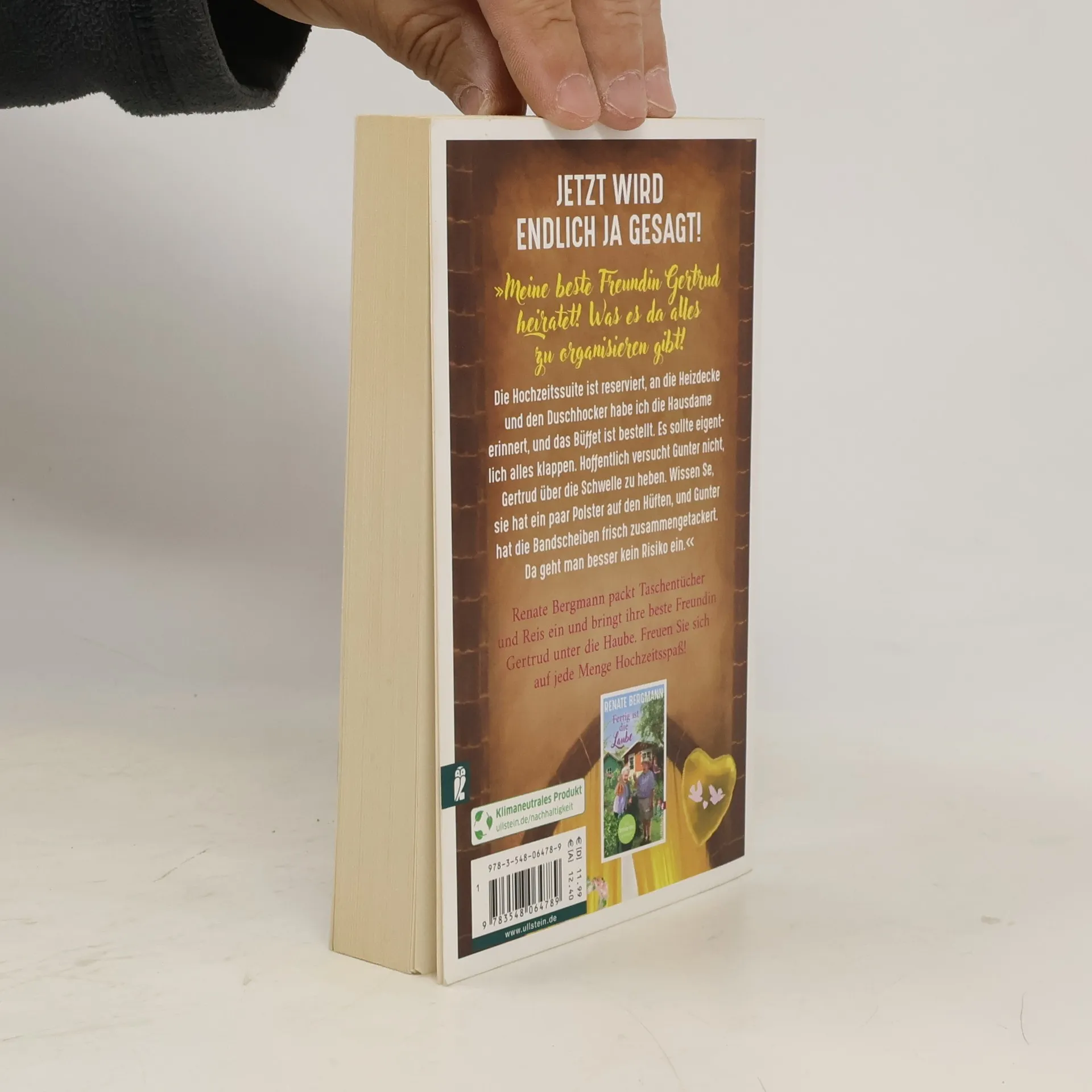 Jetzt wird endlich ja gesagt! »Ich dachte ja immer, das nächste Mal, dass ich mit meiner besten Freundin Gertrud in der Kirche sein würde, wäre auf einer unserer Beerdigungen. Aber jetzt gibt es einen viel schöneren Anlass: Sie heiratet nämlich! Was da alles zu organisieren ist! Wissen Se, Gertrud ist 82 wie ich. Da bin ich Brautjungfer und Ersatzbrautmutter in einem. Ich führe sie auch morgen zum Altar. Ja, auf Renate Bergmann ist Verlass! Der Frau Schlode, die mit ihrem Kinderchor jeden Zeitplan bei Festen durcheinanderbringt, habe ich eine falsche Kirche und ein falsches Datum gesagt, hihi! Die Hochzeitssuite ist reserviert, an die Heizdecke habe ich die Hausdame erinnert und das Büffet ist bestellt. Es sollte eigentlich alles klappen … aber wann klappt schon alles? Hoffentlich versucht Gunter nicht, Gertrud über die Schwelle zu heben. Wissen Se, sie hat ein paar Polster auf den Hüften, und Gunter hat die Bandscheiben frisch zusammengetackert. Da geht man besser kein Risiko ein.« Renate packt die Taschentücher und den Reis ein und bringt ihre beste Freundin Gertrud unter die Haube. Freuen Sie sich auf jede Menge Hochzeitsspaß!