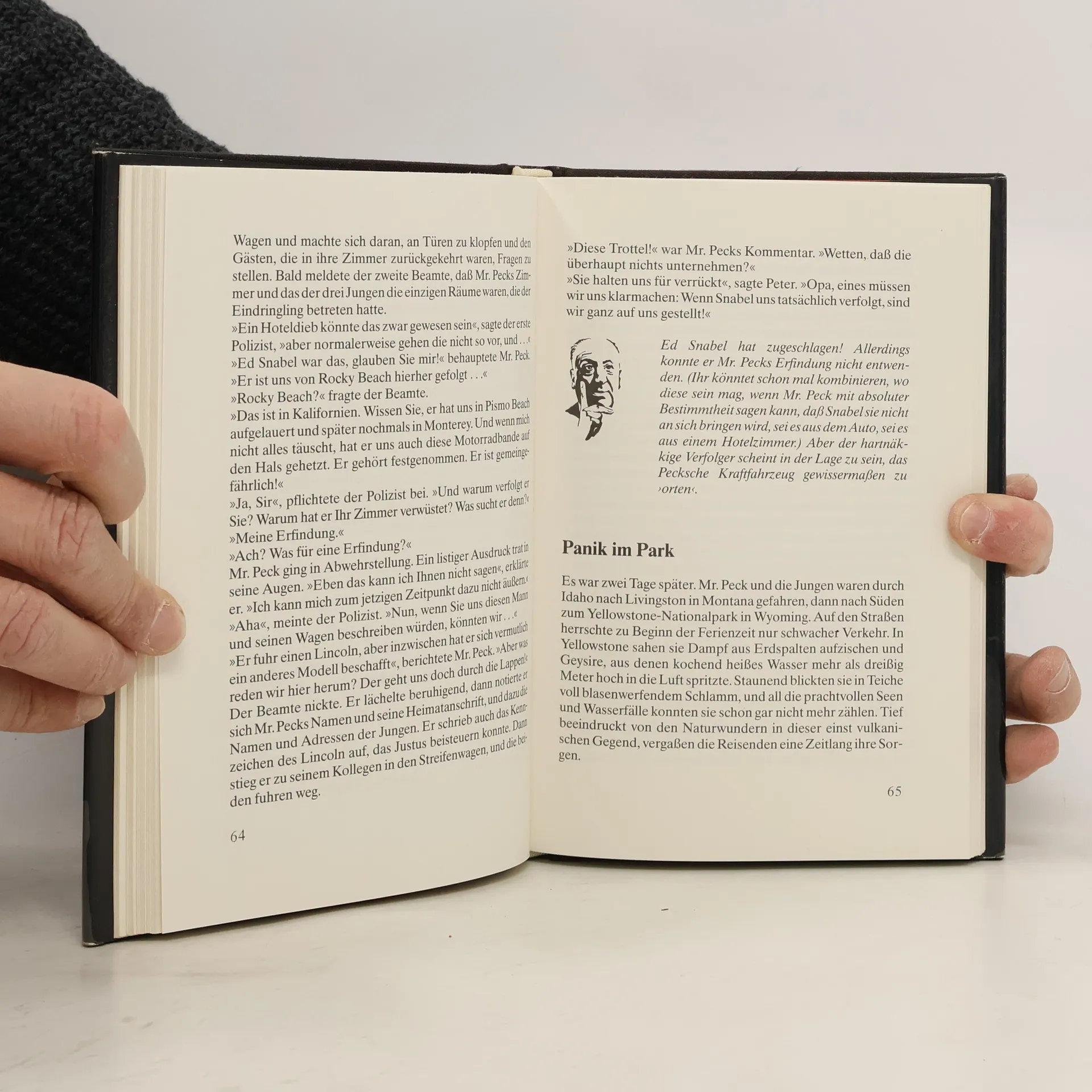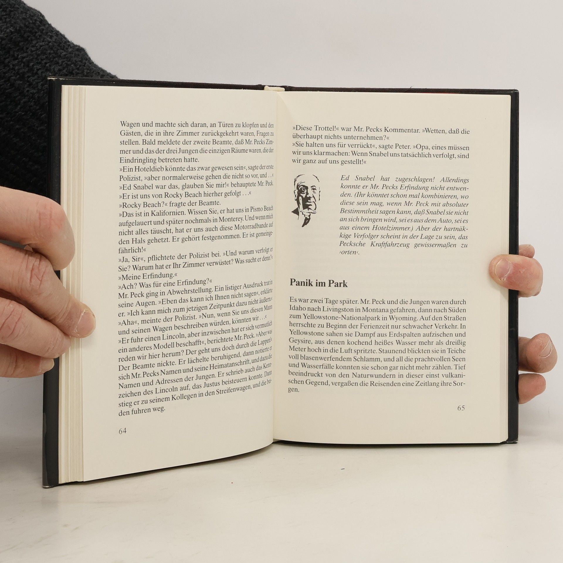 Ben Peck, Peters Großvater, hat eine Reihe von Erfindungen gemacht und jetzt will er eine davon in New York verkaufen. Aber er hat ständig Angst, daß man ihm sein geistiges Eigentum stiehlt. Da ist vor allem Ed Snabel. Was hat dieser Mann vor? Warum verfolgt er Ben Peck? Die drei Detektive erleben eine atemberaubende Jagd quer durch Amerika...