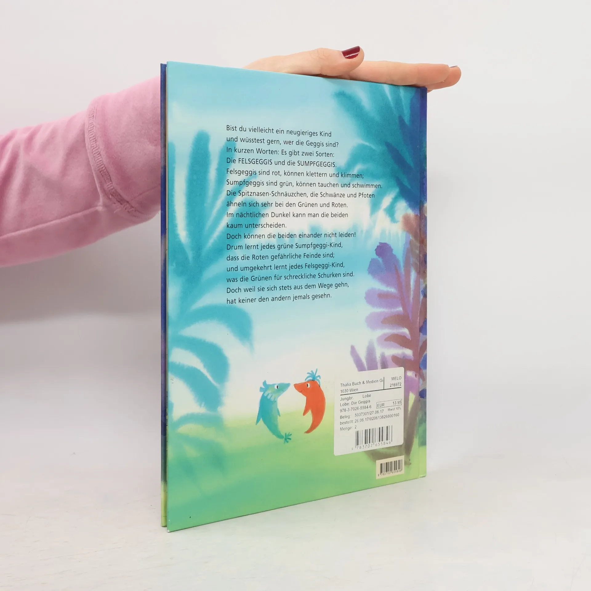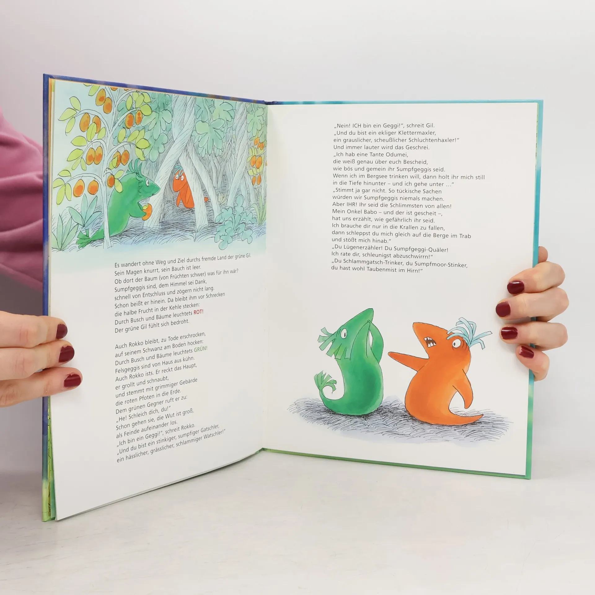 Sumpfgeggis sind grün und können schwimmen, Felsgeggis sind rot und können klettern. Noch nie hat ein Sumpfgeggi einen Felsgeggi gesehen – und umgekehrt. Trotzdem leben die Geggis in Feindschaft. Da begegnen einander eines Tages die Geggikinder Gil und Rokko und beschließen, Freunde zu werden.