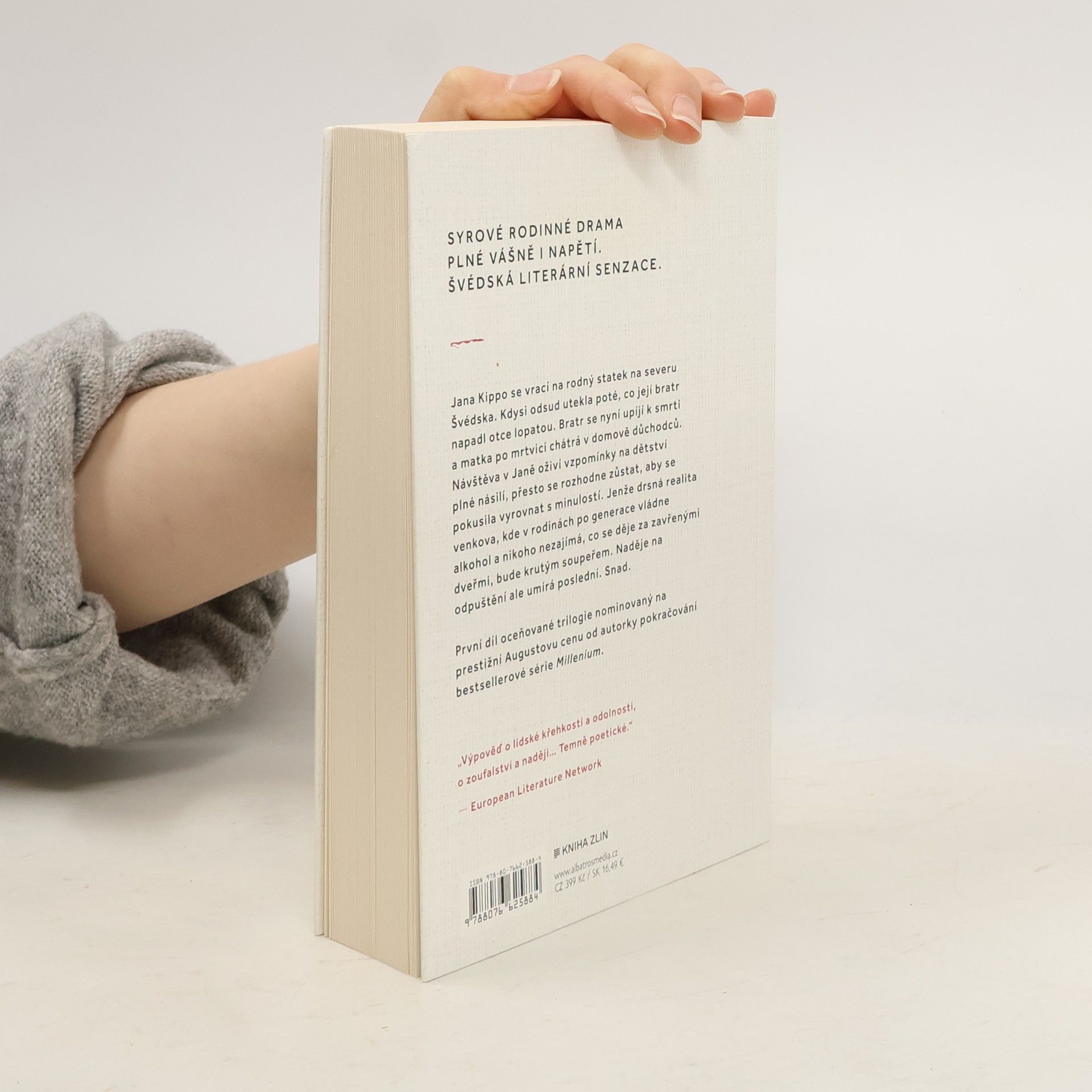 Syrové rodinné drama plné vášně i napětí. Švédská literární senzace. Jana Kippo se vrací na rodný statek na severu Švédska. Kdysi odsud utekla poté, co její bratr napadl otce lopatou. Bratr se nyní upíjí k smrti a matka po mrtvici chátrá v domově důchodců. Návštěva v Janě oživí vzpomínky na dětství plné násilí, přesto se rozhodne zůstat, aby se pokusila vyrovnat s minulostí. Jenže drsná realita venkova, kde v rodinách po generace vládne alkohol a nikoho nezajímá, co se děje za zavřenými dveřmi, bude krutým soupeřem. Naděje na odpuštění ale umírá poslední. Snad. Karin Smirnoff je švédská spisovatelka, původně pracovala jako novinářka, ale pak se rozhodla změnit obor a koupila dřevařskou firmu v severním Švédsku. Později vystudovala literární akademii při univerzitě v Lundu a právě v té době začala psát trilogii s hlavní hrdinkou Janou Kippovou, jejíž děj se odehrává ve vesnici nedaleko autorčina rodiště v Umea. Hned první díl se stal ve Švédsku senzací a byl nominován na prestižní Augustovu cenu. Celá trilogie je ceněna jak čtenáři, tak kritiky za svou literární kvalitu. Rodinné drama vypráví o skrytých traumatech, boji se závislostmi a touze někam patřit. Na osudech Kippových líčených se syrovou něhou a jedinečným jazykem autorka odhaluje kruté lidské pohnutky v celé jejich bolestné obnaženosti. Boří při tom nejen pravidla gramatiky.