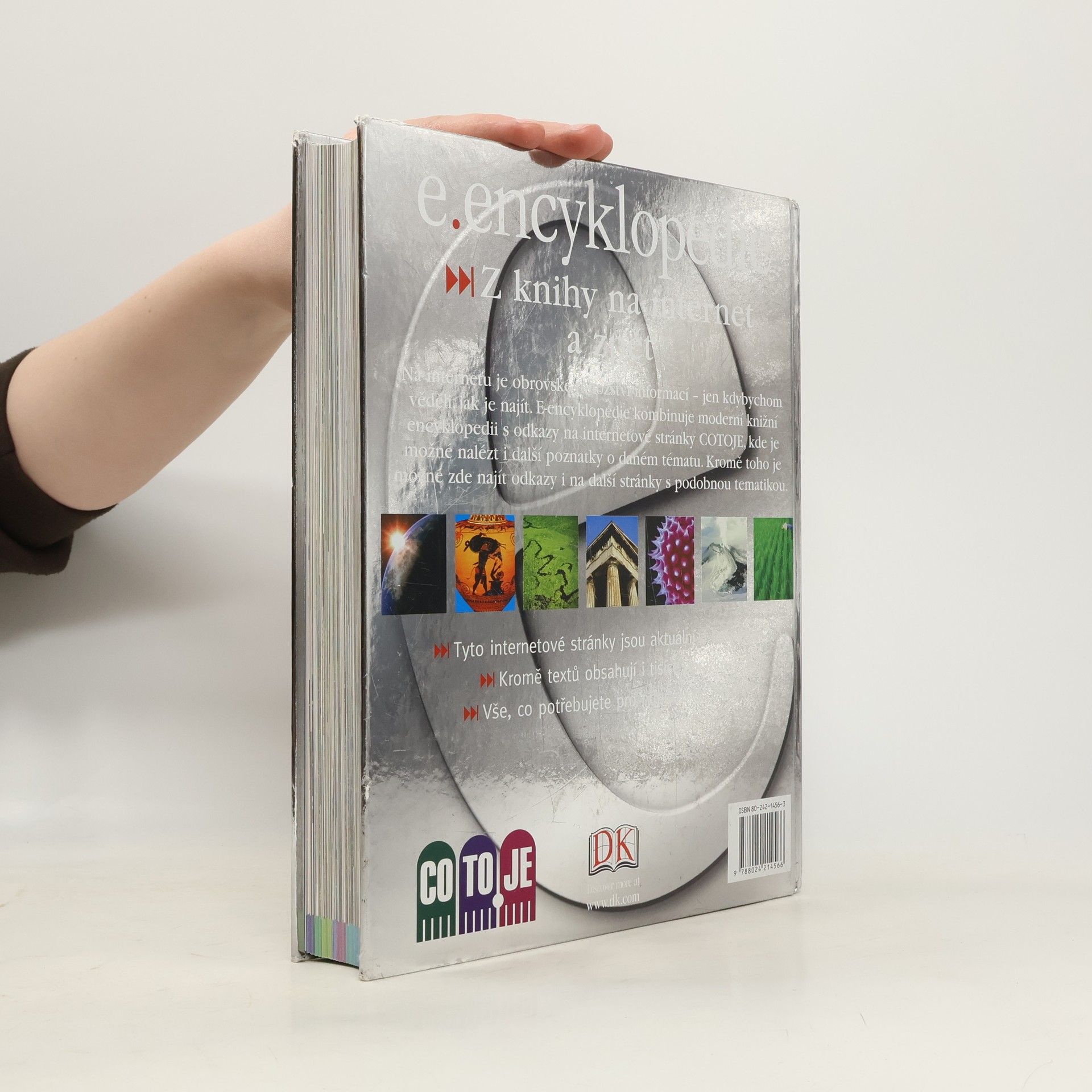 Kniha s napojením na internetové stránky a on-line verze jiných encyklopedií Na internetu je obrovské množství informací - jen kdybychom věděli, jak je najít. E-encyklopedie kombinuje moderní knižní encyklopedii s odkazy na internetové stránky COTOJE, kde je možné nalézt i další poznatky o daném tématu. Kromě toho je možné zde najít odkazy i na další stránky s podobnou tematikou. Tyto internetové stránky jsou aktuální a bezpečné. Kromě textů obsahují i tisíce obrázků. Vše, co potřebujete pro přípravu do školy. Jak pracovat s www odkazy Z KNIHY NA INTERNET A ZPĚT Vlastníci e-encyklopedie, poté, co si o tématu přečtou v knize základní fakta, mají možnost si zdarma prohlédnout na internetové stránce www.COTOJE.cz i hesla, na něž se v knize odkazuje.