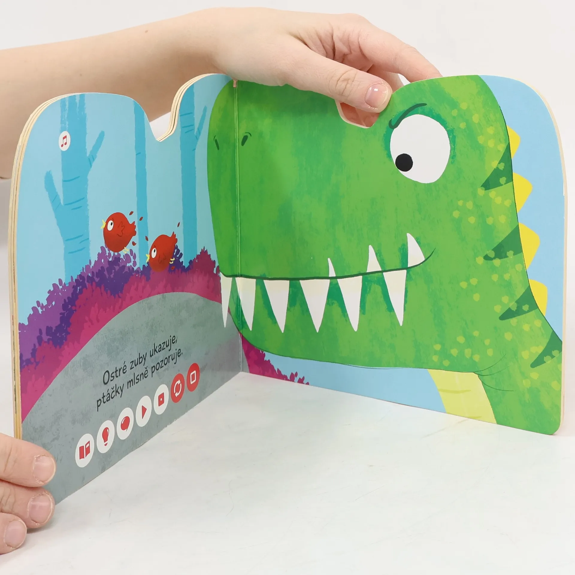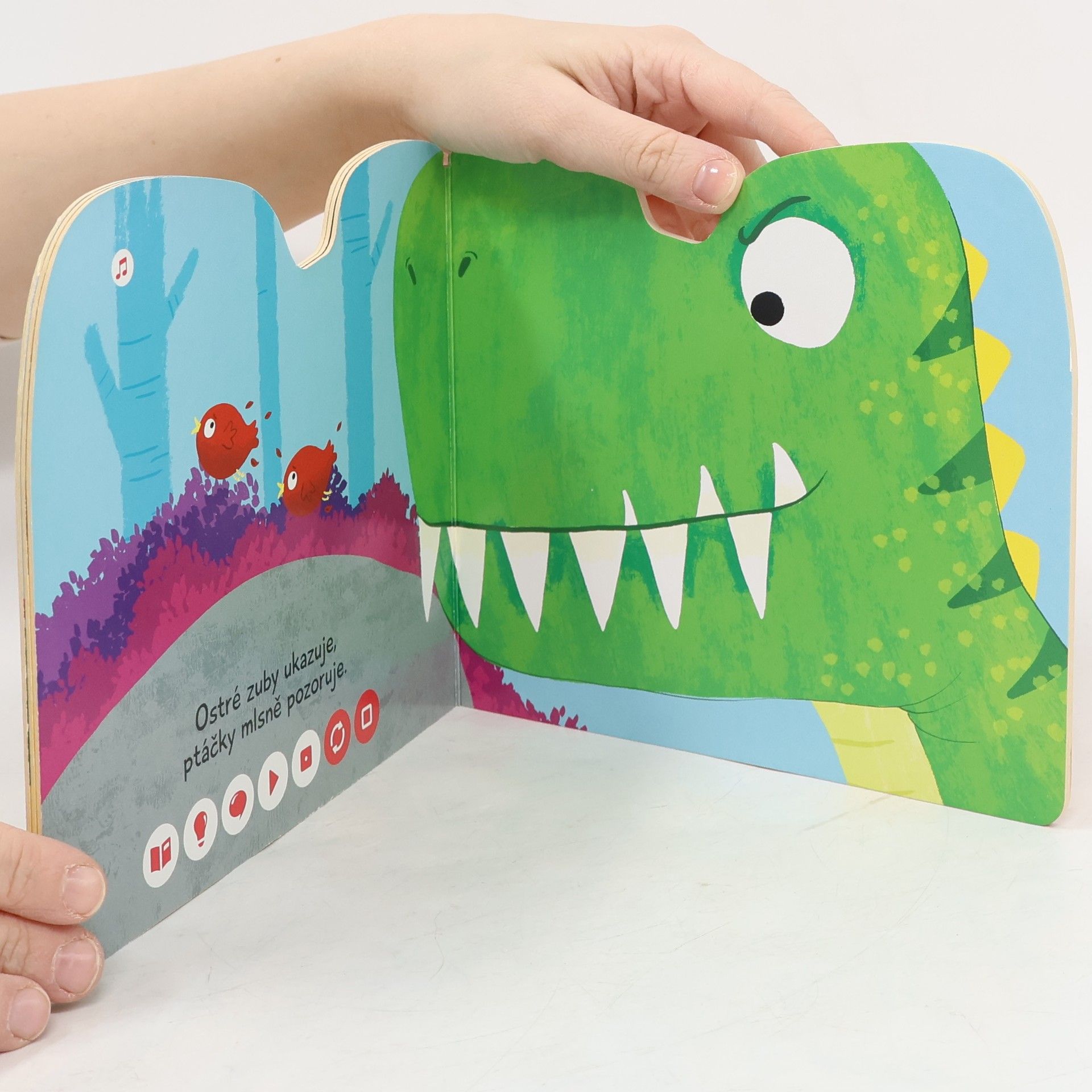 Interaktivní obrázková kniha s tuhými listy a říkadly o dinosaurech, určena pro čtení s elektronickou tužkou.