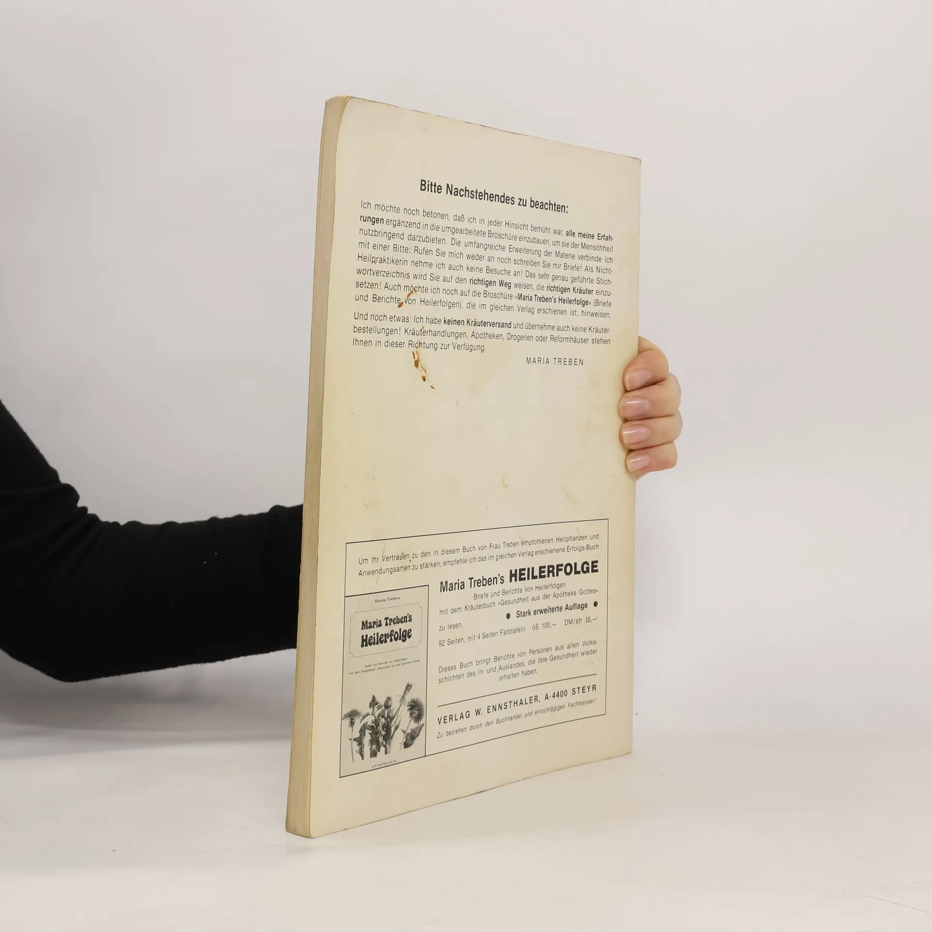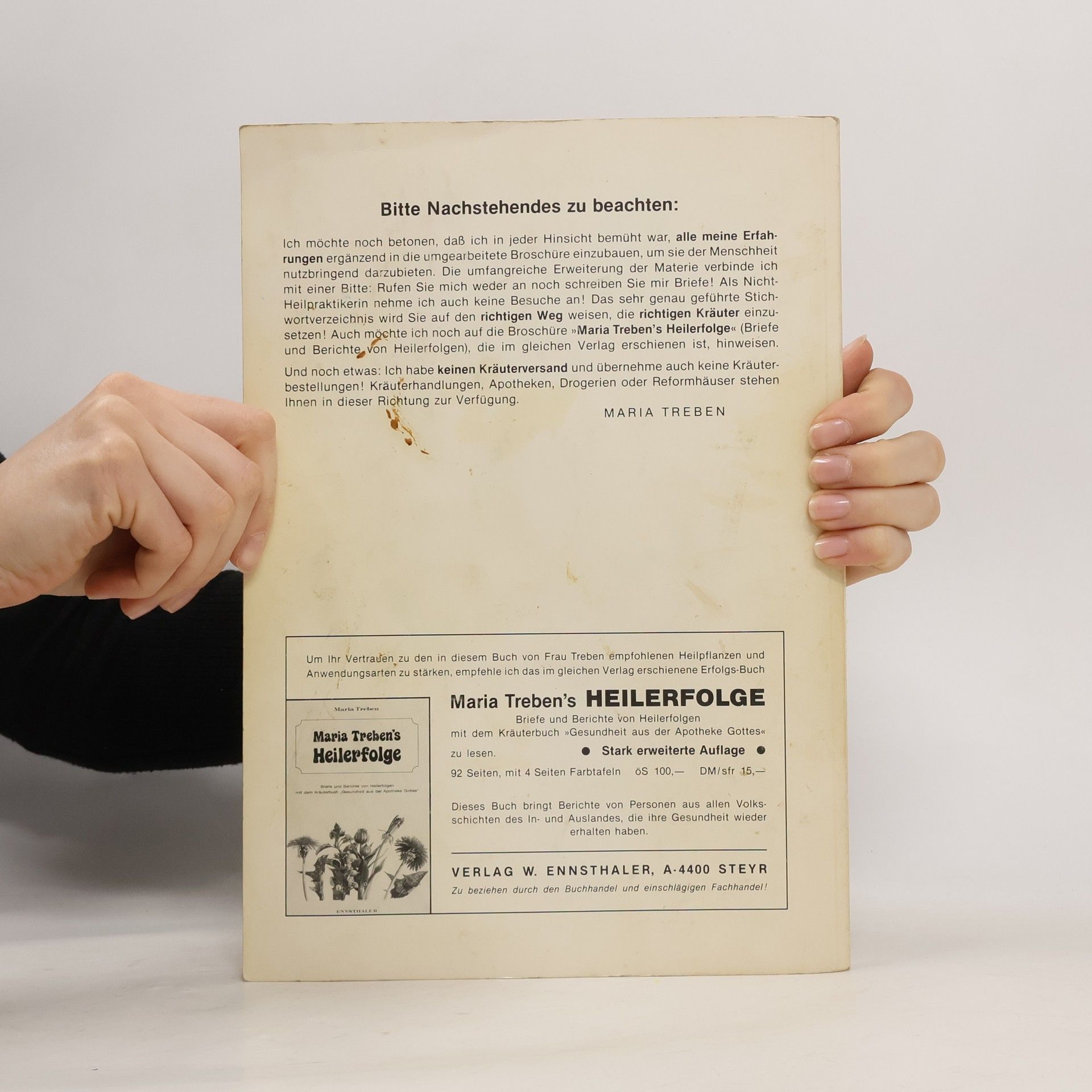 Das Hauptwerk Maria Trebens, die „Gesundheit aus der Apotheke Gottes“, ist 1980 im Ennsthaler Verlag erschienen und wurde bisher in 27 Sprachen übersetzt. Es werden 31 Heilkräuter, deren Heilkraft und Anwendungsmöglichkeiten als Tee, aufzulegender Brei, Bad oder Frischsaft ausführlich beschrieben. Maria Treben hat sich als eine der wichtigsten Pioniere der Kräuterheilkunde ihren Platz in der Geschichte erobert. Viele verehrten sie wie eine Heilige, tatsächlich war sie ein Frau, die sich ein Leben lang mit Heilkräutern beschäftigte und ihre Erfahrungen möglichst vielen Menschen nahebringen wollte. In all den Jahren hat ihre Popularität und die ihrer Werke nie nachgelassen. Ihre Bücher erleben heute durch die fortschreitende Anwendung der Alternativmedizin eine neue und ungebrochene Aktualität.