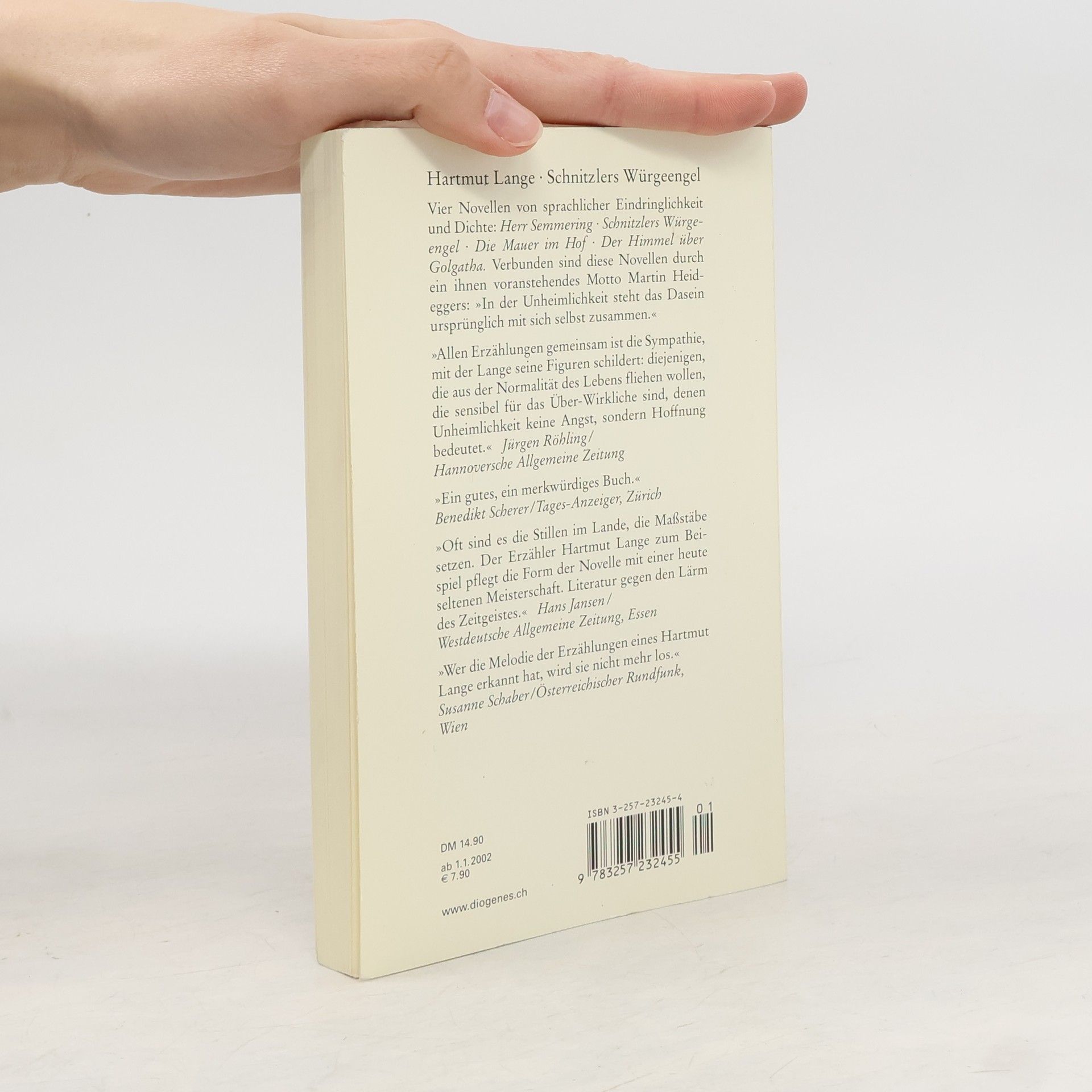 In der Titelnovelle ist der Icherzähler zu Gast bei Arthur Schnitzler, man schreibt den Herbst 1931, es sind Schnitzlers letzte Tage ... Als Schnitzler die Villa in der Sternwartestraße betrat, meinte er, im Hintergrund des Korridors, dort, wo es beinahe dunkel war, einen Schatten zu sehen. Eigentlich etwas Helles, Hochaufragendes, als stünde dort jemand, aber es war eine Anwandlung, die sofort wieder verschwand. Ein Reisender kommt mit dem Flugzeug nach Tel Aviv, ist einige Stunden später in Jerusalem, kurz danach steht er auf der Anhöhe von Golgatha und schaut durch die offene Kuppel der dortigen Kirche, er sieht nur einen diesigen Lichtschein. Kurz danach findet sich Hans-Peter Ludwig, wie er es wünschte, im Freien wieder. Er hing am Kreuz, und das erste, was er hörte, war jene Stimme der Mimi aus der Oper des Puccini, die er so liebte... und nun sah er über sich jenes flirrende, nahezu unbegrenzte Blau. Vier neue Novellen von Hartmut Lange: Herr Semmering µ Schnitzlers Würgeengel µ Die Mauer im Hof µ Der Himmel über Golgatha. Verbunden sind diese Novellen durch das ihnen voranstehende Motto: »In der Unheimlichkeit steht das Dasein ursprünglich mit sich selbst zusammen.« Heidegger "