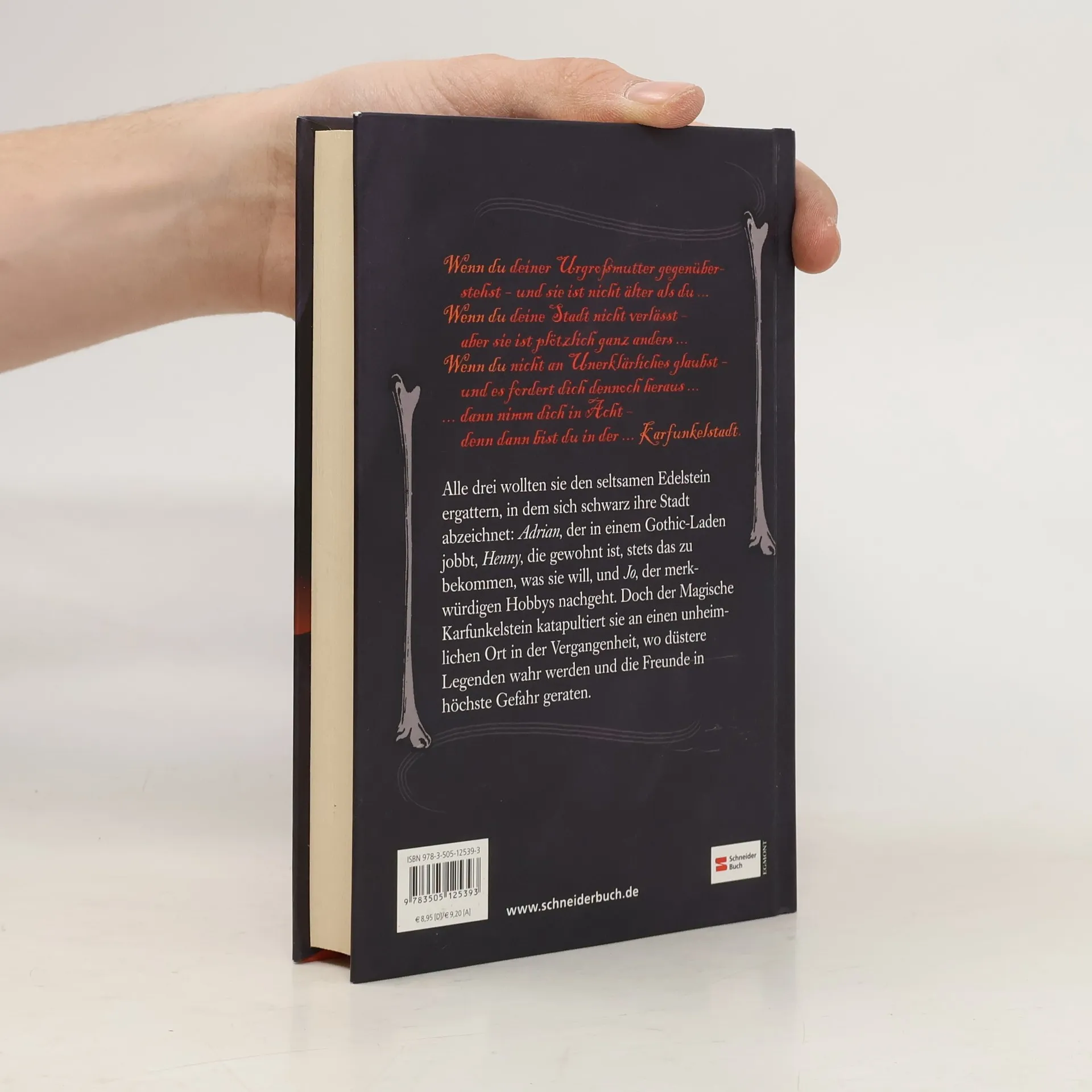 Alle drei wollten sie den seltsamen Edelstein ergattern, in dem sich schwarz ihre Stadt abzeichnet: Adrian, der in einem Gothic-Laden jobbt, Henny, die gewohnt ist, stets das zu bekommen, was sie will, und Jo, der merkwürdigen Hobbys nachgeht. Doch der Magische Karfunkelstein katapultiert sie an einen unheimlichen Ort in der Vergangenheit, wo düstere Legenden wahr werden und die Freunde in höchste Gefahr geraten.