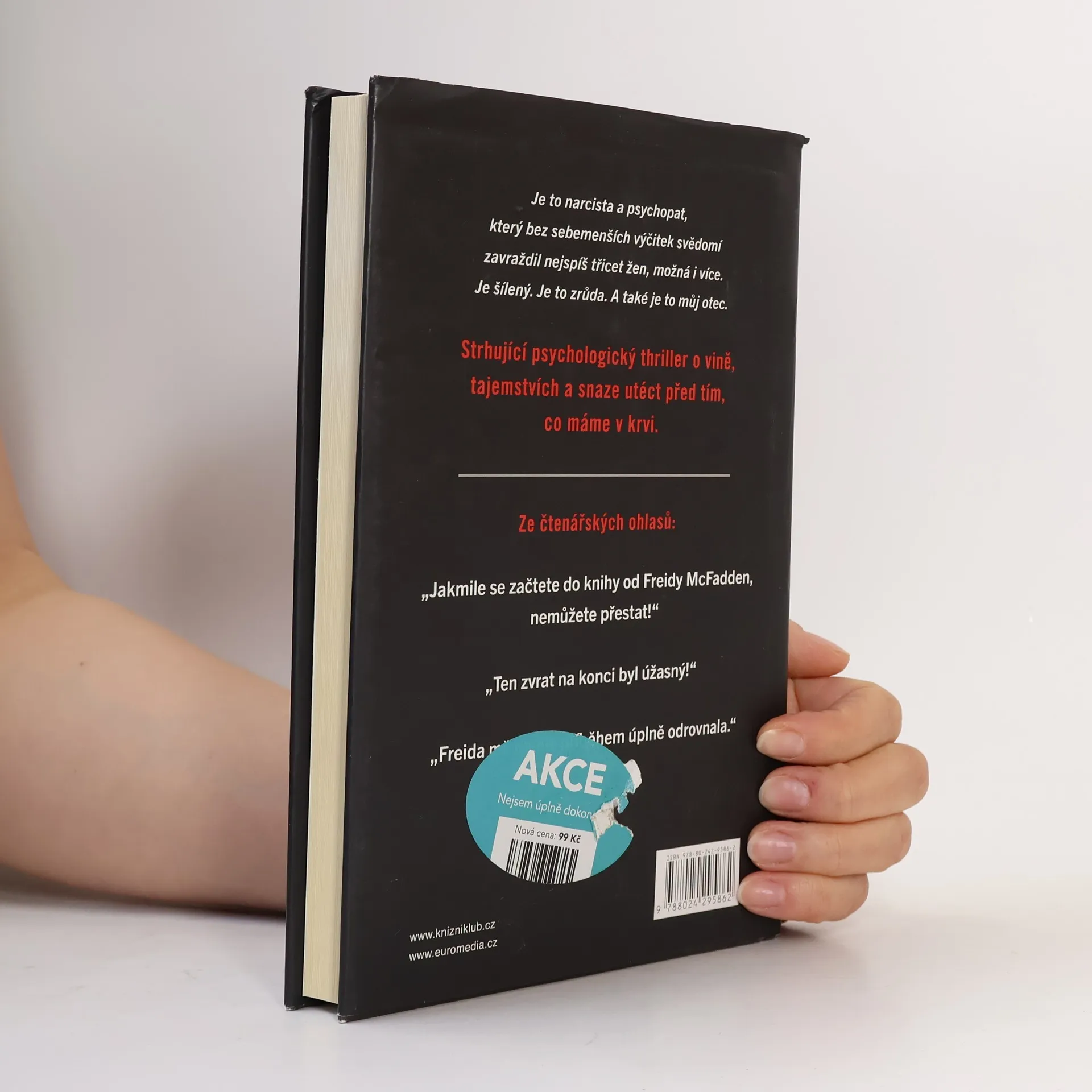 Když si Nora Davisová dělala jako malá v pokojíčku úkoly, netušila, že její otec zatím ve sklepě vraždí ženy. Až do dne, kdy se jim u dveří objevila policie. O desítky let později je Nořin otec stále za mřížemi a ona je úspěšná chirurgyně s poklidným a osamělým životem. Nikdo netuší, že její otec byl sériový vrah. Pak však Nora zjistí, že jedna z jejích pacientek byla zavražděna – a to stejně děsivým a jedinečným způsobem, jakým vraždil i její otec. Někdo ví, kdo Nora je, a chce, aby za ten hrůzný zločin nesla zodpovědnost. Jenže ona není vrah. Policie jí nemůže nic přišít. Pokud se jí tedy někdo nepodívá do sklepa…