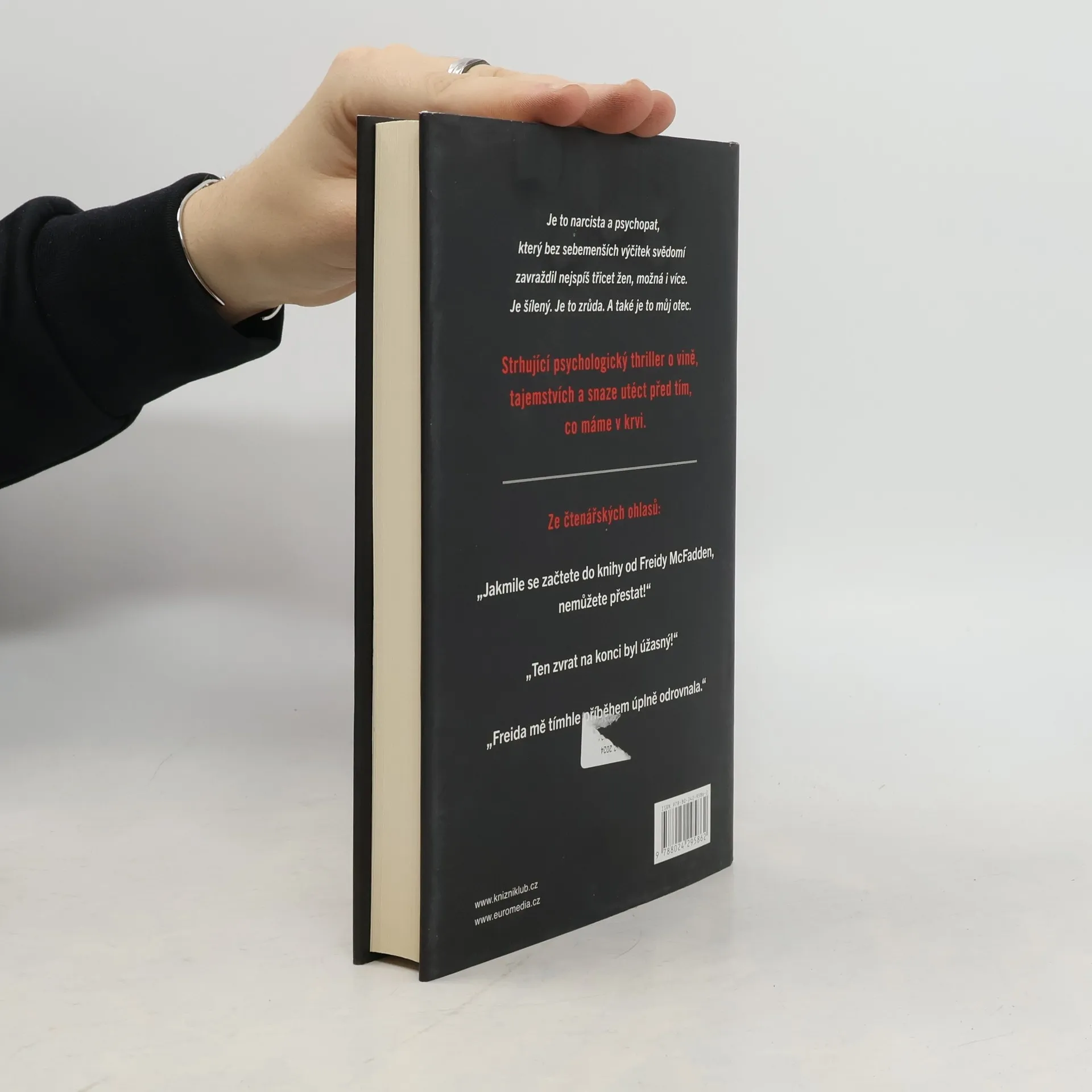 Když si Nora Davisová dělala jako malá v pokojíčku úkoly, netušila, že její otec zatím ve sklepě vraždí ženy. Až do dne, kdy se jim u dveří objevila policie. O desítky let později je Nořin otec stále za mřížemi a ona je úspěšná chirurgyně s poklidným a osamělým životem. Nikdo netuší, že její otec byl sériový vrah. Pak však Nora zjistí, že jedna z jejích pacientek byla zavražděna – a to stejně děsivým a jedinečným způsobem, jakým vraždil i její otec. Někdo ví, kdo Nora je, a chce, aby za ten hrůzný zločin nesla zodpovědnost. Jenže ona není vrah. Policie jí nemůže nic přišít. Pokud se jí tedy někdo nepodívá do sklepa…