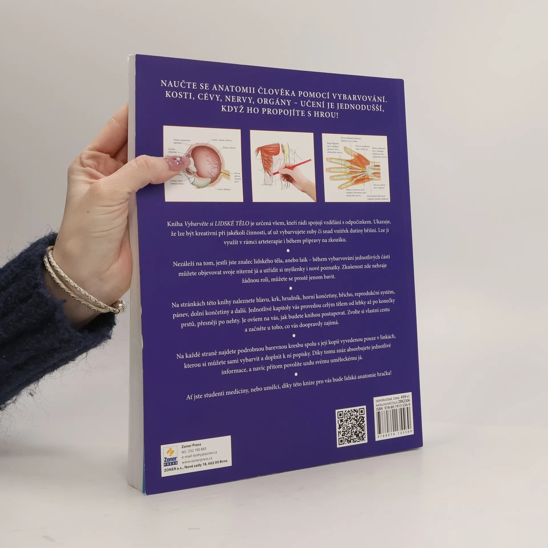 Naučte se anatomii člověka pomocí vybarvování. Kosti, cévy, nervy, orgány – učení je jednodušší, když ho propojíte s hrou. Naostřete pastelky a pojďte na to! Kniha Vybarvěte si LIDSKÉ TĚLO (Human Body Coloring Book) je určená všem, kteří rádi spojují vzdělání s odpočinkem. Ukazuje, že lze být kreativní při jakékoli činnosti, ať už vybarvujete zuby či snad vnitřek dutiny břišní. Lze ji využít v rámci arteterapie i během přípravy na zkoušku. Nezáleží na tom, jestli jste znalec lidského těla, anebo laik – během vybarvování jednotlivých částí můžete objevovat svoje niterné já a utřídit si myšlenky i nové poznatky. Zkušenost zde nehraje žádnou roli, můžete se prostě jenom bavit! Na stránkách této knihy naleznete různé části těla, hlavu, krk, hrudník, horní končetiny, břicho, reprodukční systém, pánev, dolní končetiny a další. Jednotlivé kapitoly vás provedou celým tělem od lebky až po konečky prstů, přesněji po nehty. Je ovšem na vás, jak budete knihou postupovat. Zvolte si vlastní cestu a začněte u toho, co vás doopravdy zajímá! Na každé straně najdete podrobnou barevnou kresbu spolu s její kopií vyvedenou pouze v linkách, kterou si můžete sami vybarvit a doplnit k ní popisky. Díky tomu snáz absorbujete jednotlivé informace, a navíc přitom povolíte uzdu svému uměleckému já. Ať jste studenti medicíny, umělci, nebo máte prostě jenom rádi návštěvy pitevny v kriminálkách, v téhle knize si přijdete na své!