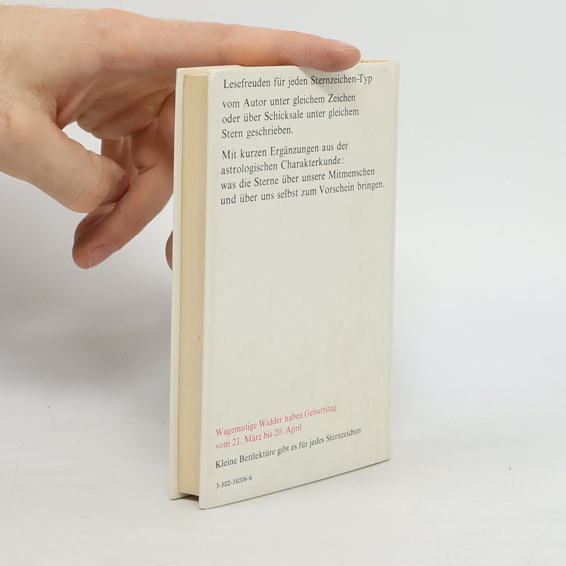 Small book written in German. This is on the back Lesefreuden fur jeden SternzeichenTyp vom Autor unter gleichem Zeichen oder uber Schicksale uter gleichem Stern geschrieben. Mit kurzen Erganzungen aus der astrologischen was die Sterne uber unsere Mitmenschen und uber uns selbst zum Borschein bringen.