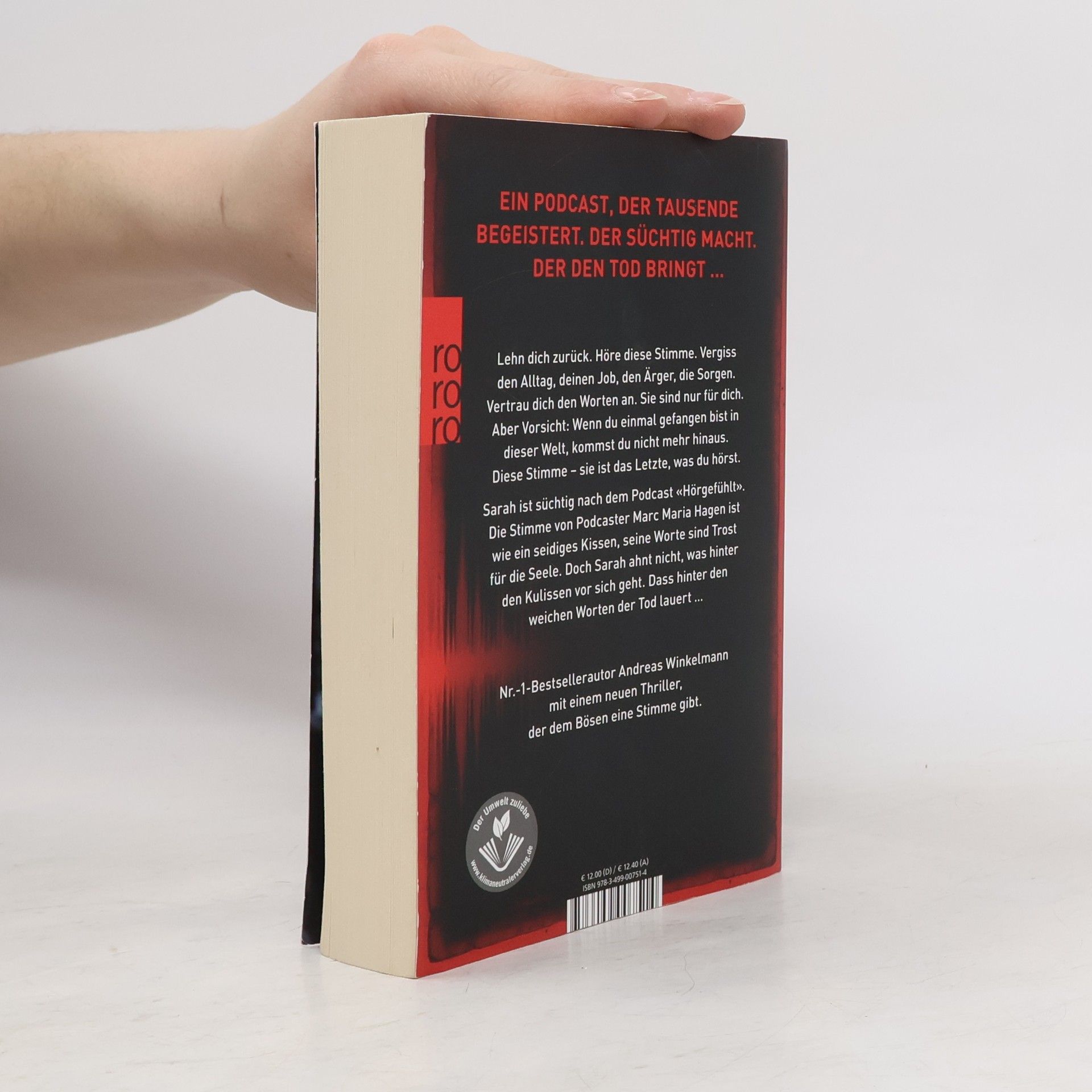 Ein Podcast, der Tausende begeistert. Der süchtig macht. Der den Tod bringt … Lehn dich zurück. Höre diese Stimme. Vergiss deinen Alltag, den Job, den Ärger, die Sorgen. Vertrau dich den Worten an. Sie sind nur für dich. Aber Vorsicht: Wenn du einmal gefangen bist in dieser Welt, kommst du nicht mehr hinaus. Diese Stimme – sie ist das Letzte, was du hörst. Sarah ist süchtig nach dem Podcast «Hörgefühlt». Die Stimme von Podcaster Marc Maria Hagen ist wie ein seidiges Kissen, seine Worte sind Trost für die Seele. Doch Sarah ahnt nicht, was hinter den Kulissen vor sich geht. Dass hinter den weichen Worten der Tod lauert. Nr.-1-Bestsellerautor Andreas Winkelmann mit einem neuen Thriller, der dem Bösen eine Stimme gibt.