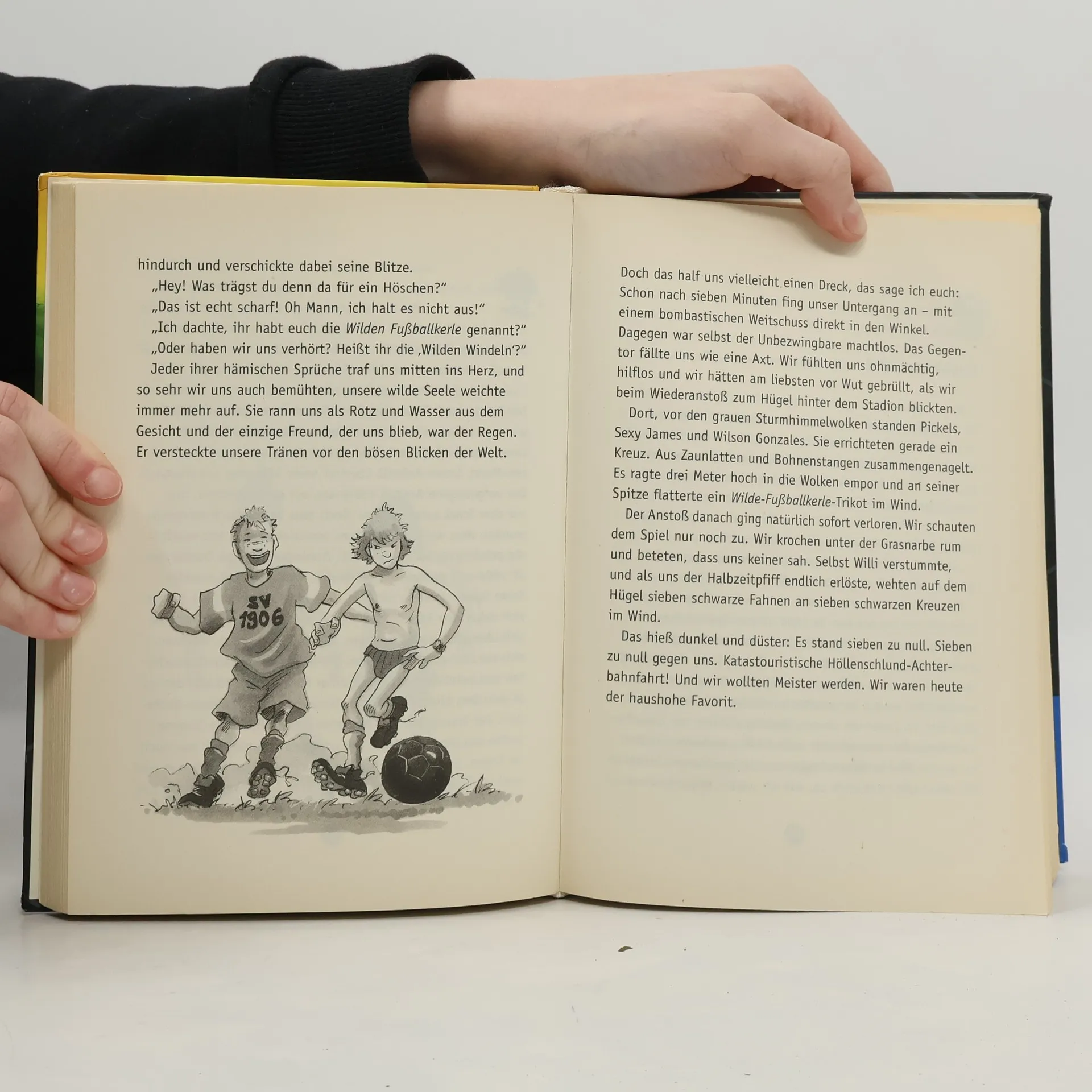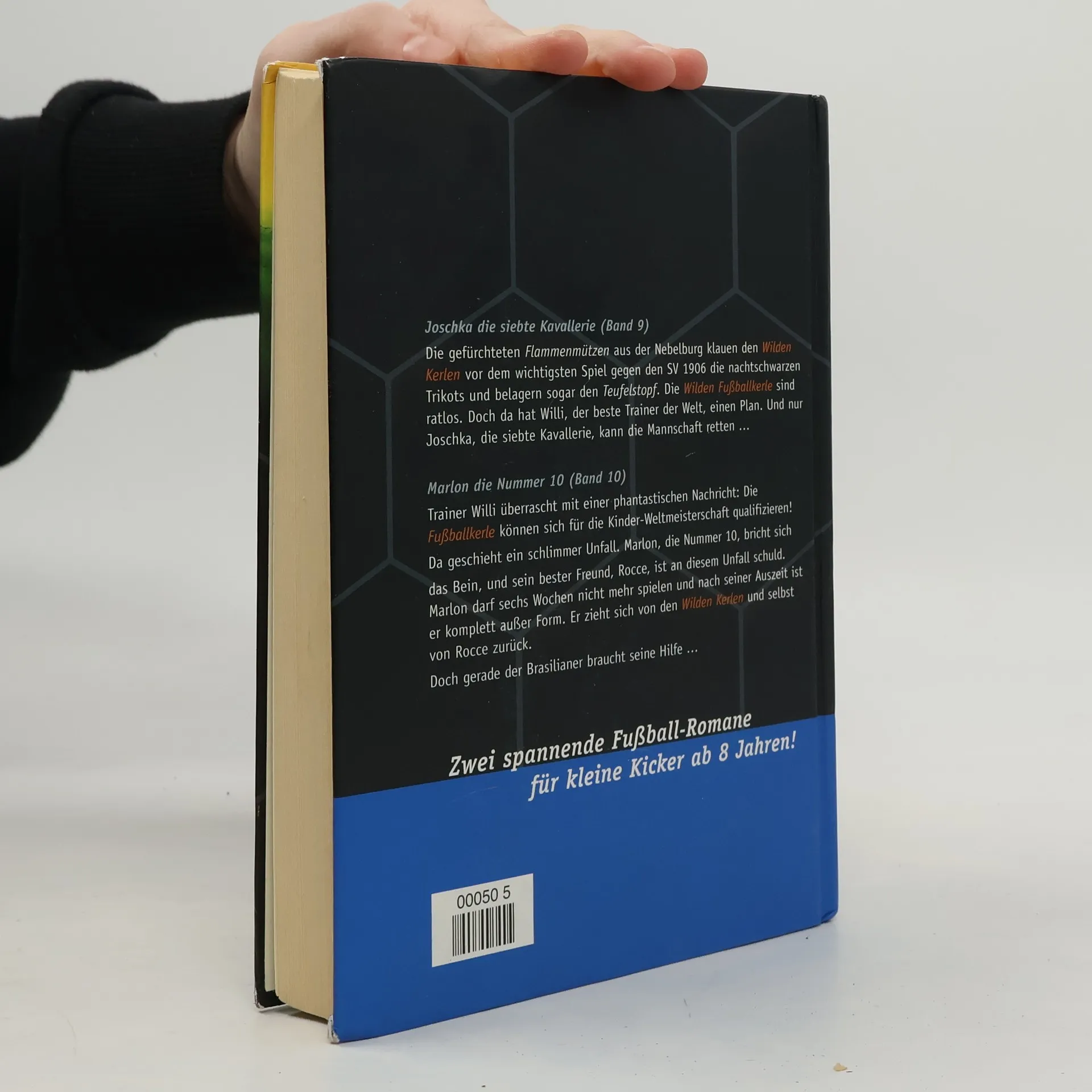 Doppelband der Wilden Fußballkerle mit den Bänden 9: Joschka, die siebte Kavallerie und 10: Marlon, die Nr. 10 Band 9: Ausgerechnet Joschka, der kleinste der Wilden Fußballkerle, legt sich mit den gefürchteten Flammenmützen aus der Nebelburg an. Angeführt von Gonzo, dem blassen Vampir, verlangt die Skatergang nun die alleinige Herrschaft über die Stadt. Sie stehlen den Wilden Kerlen den Schwarzen Ball, klauen die nachtschwarzen Trikots und belagern den Teufelstopf. Die Wilden Fußballkerle sind ratlos. Sie sollen vernichtet werden. Doch da hat ihr Trainer Willi einen Plan. Und nur Joschka, die siebte Kavallerie, kann die Wilden Kerle noch retten. Band 10: Sie könnten es schaffen: Die Wilden Fußballkerle bewähren sich in der Hallen-Stadtmeisterschaft und können sich zusätzlich für die Kinder-Weltmeisterschaft qualifizieren! Da geschieht ein schlimmer Unfall: Marlon verunglückt beim Kartfahren und sein bester Freund, Rocce, ist an diesem Unfall schuld. Marlon darf sechs Wochen nicht mehr spielen und nach seiner Auszeit ist er komplett außer Form. Er zieht sich von allen zurück und spricht nicht mehr mit Rocce. Aber gerade der braucht ihn: Sein Vater, der brasilianische Fußballprofi Giacomo Ribaldo, soll vom FC Bayern verkauft werden. Dann müsste Rocce mitgehen. Wird Marlon zu den Wilden Kerlen zurückfinden und wie können sie Ribaldo neu motivieren?