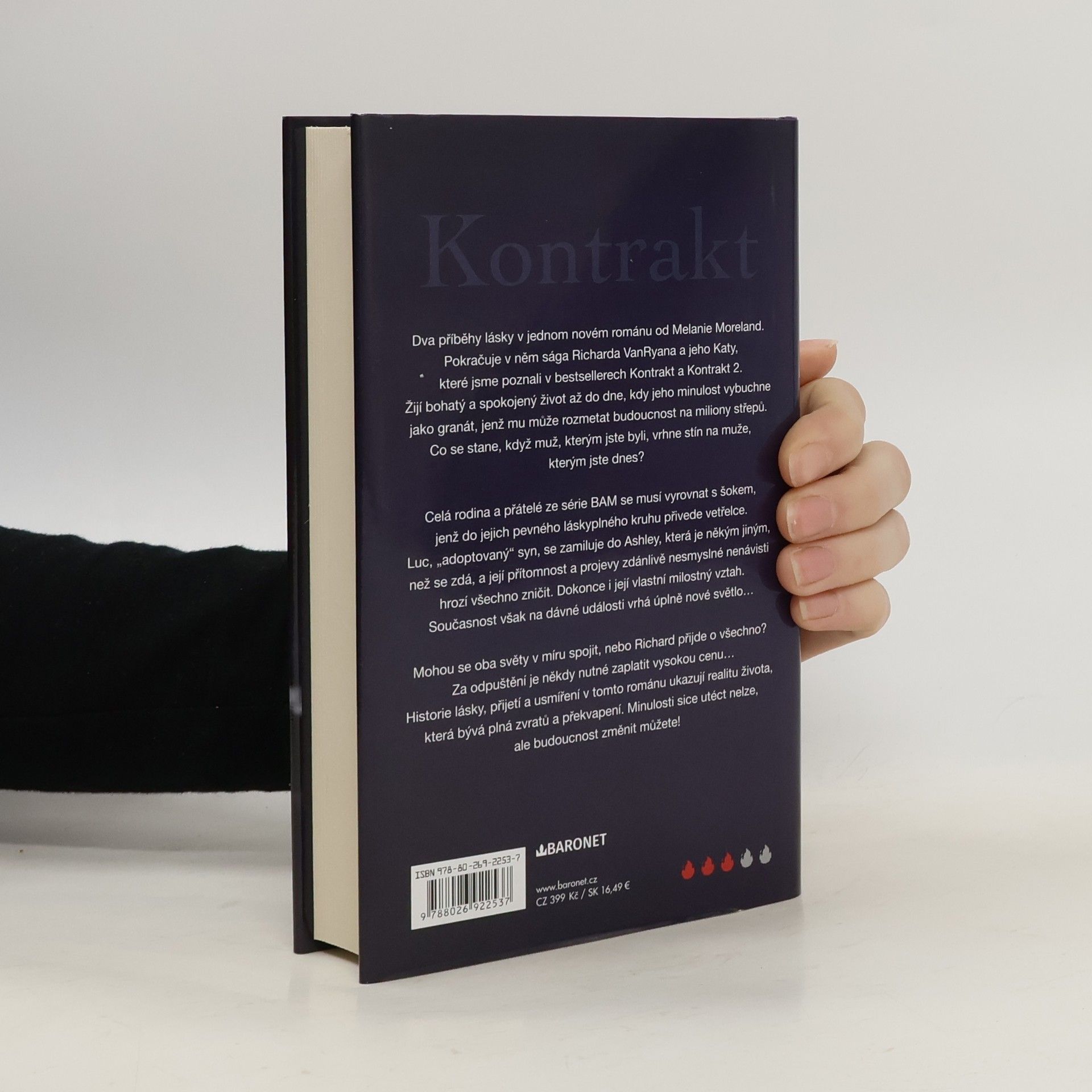 Minulosti sice utéct nelze, ale budoucnost změnit můžete! Dva příběhy lásky v jednom novém románu od Melanie Moreland. Pokračuje v něm sága Richarda VanRyana a jeho Katy, které jsme poznali v bestsellerech Kontrakt a Kontrakt 2. Žijí bohatý a spokojený život až do dne, kdy jeho minulost vybuchne jako granát, jenž mu může rozmetat budoucnost na miliony střepů. Co se stane, když muž, kterým jste byli, vrhne stín na muže, kterým jste dnes? Celá rodina a přátelé ze série BAM se musí vyrovnat s šokem, jenž do jejich pevného láskyplného kruhu přivede vetřelce. Luc, „adoptovaný“ syn, se zamiluje do Ashley, která je někým jiným, než se zdá, a její přítomnost a projevy zdánlivě nesmyslné nenávisti hrozí všechno zničit. Dokonce i její vlastní milostný vztah. Současnost však na dávné události vrhá úplně nové světlo… Mohou se oba světy v míru spojit, nebo Richard přijde o všechno? Za odpuštění je někdy nutné zaplatit vysokou cenu… Historie lásky, přijetí a usmíření v tomto románu ukazují realitu života, která bývá plná zvratů a překvapení. Minulosti sice utéct nelze, ale budoucnost změnit můžete!