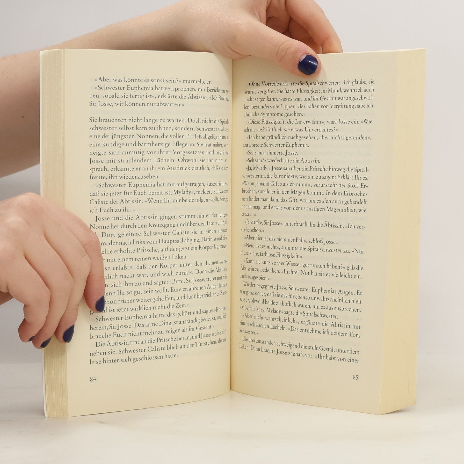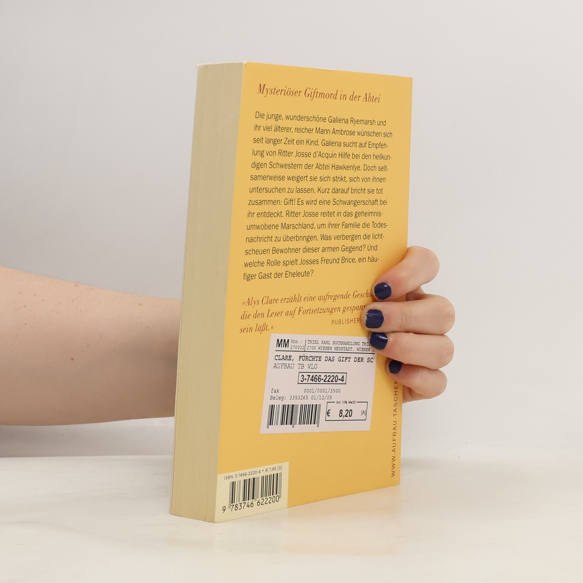 Mysteriöser Giftmord in der Abtei Die junge, wunderschöne Galiena Ryemarsh und ihr viel älterer, reicher Mann Ambrose wünschen sich seit langer Zeit ein Kind. Galiena sucht auf Empfehlung von Ritter Josse d'Acquin Hilfe bei den heilkundigen Schwestern der Abtei Hawkenlye. Doch seltsamerweise weigert sie sich strikt, sich von ihnen untersuchen zu lassen. Kurz darauf bricht sie tot zusammen: Gift! Es wird eine Schwangerschaft bei ihr entdeckt. Ritter Josse reitet in das geheimnisumwobene Marschland, um ihrer Familie die Todesnachricht zu überbringen. Was verbergen die lichtscheuen Bewohner dieser armen Gegend? Und welche Rolle spielt Josses Freund Brice, ein häufiger Gast der Eheleute? „Alys Clare erzählt eine aufregende Geschichte, die den Leser auf Fortsetzungen gespannt sein läßt.“ Publishers Weekly