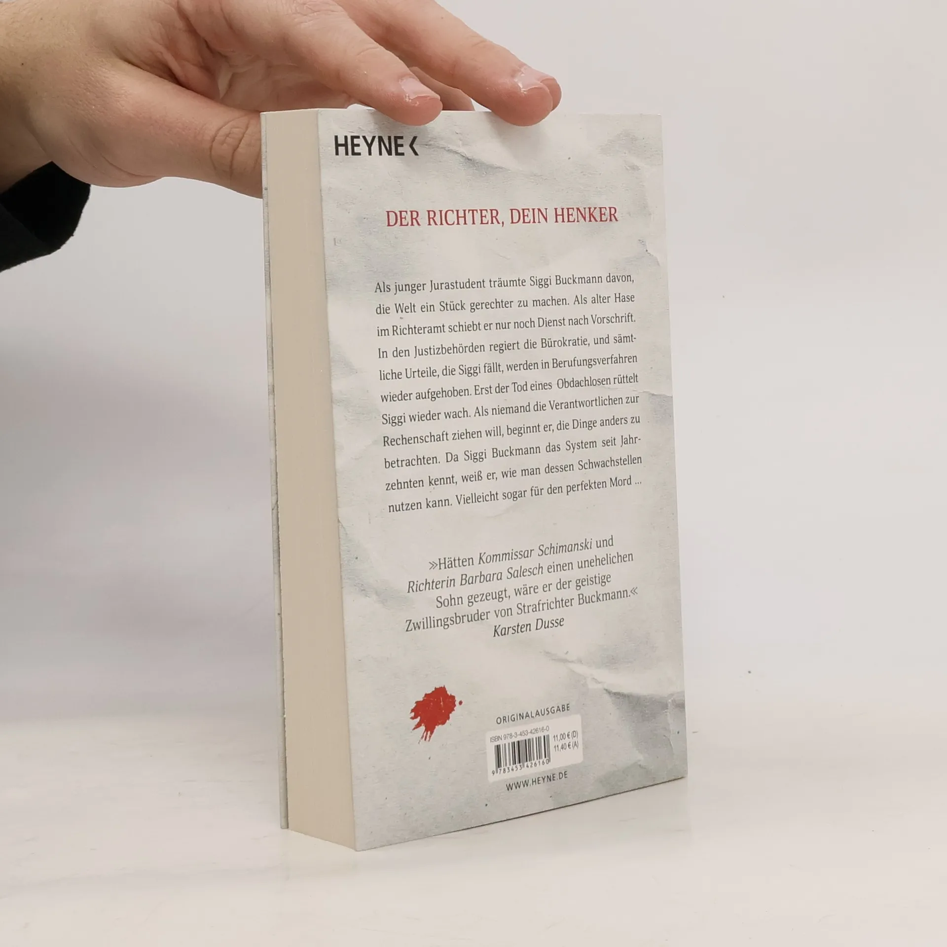 Der Richter, dein Henker Als junger Jurastudent träumte Siggi Buckmann davon, die Welt ein Stück gerechter zu machen. Als alter Hase im Richteramt schiebt er nur noch Dienst nach Vorschrift. In den Justizbehörden regiert die Bürokratie und sämtliche Urteile, die Siggi fällt, werden in Berufungsverfahren wieder aufgehoben. Erst der Tod eines obdachlosen Junkies rüttelt Siggi wieder wach. Als niemand die Verantwortlichen zur Rechenschaft ziehen will, beginnt Siggi, die Dinge anders zu betrachten. Da er das System seit Jahrzehnten kennt, weiß er, wie man dessen Schwachstellen nutzen kann. Vielleicht kommt ja auch er selbst mit einem Verbrechen davon? »Hätten Kommissar Schimanski und Richterin Barbara Salesch einen unehelichen Sohn gezeugt, wäre er der geistige Zwillingsbruder von Strafrichter Buckmann.« Karsten Dusse, Autor von »Achtsam morden«