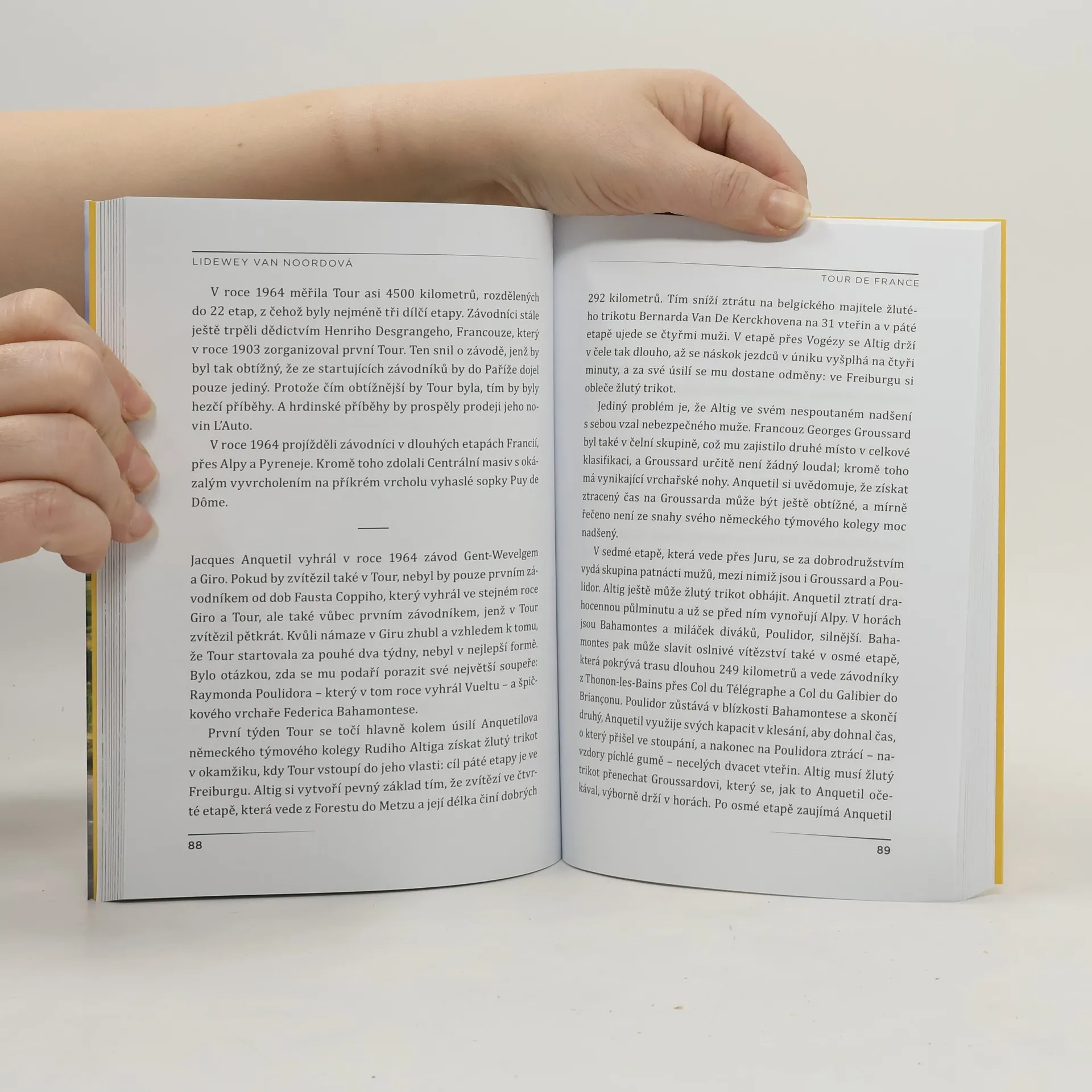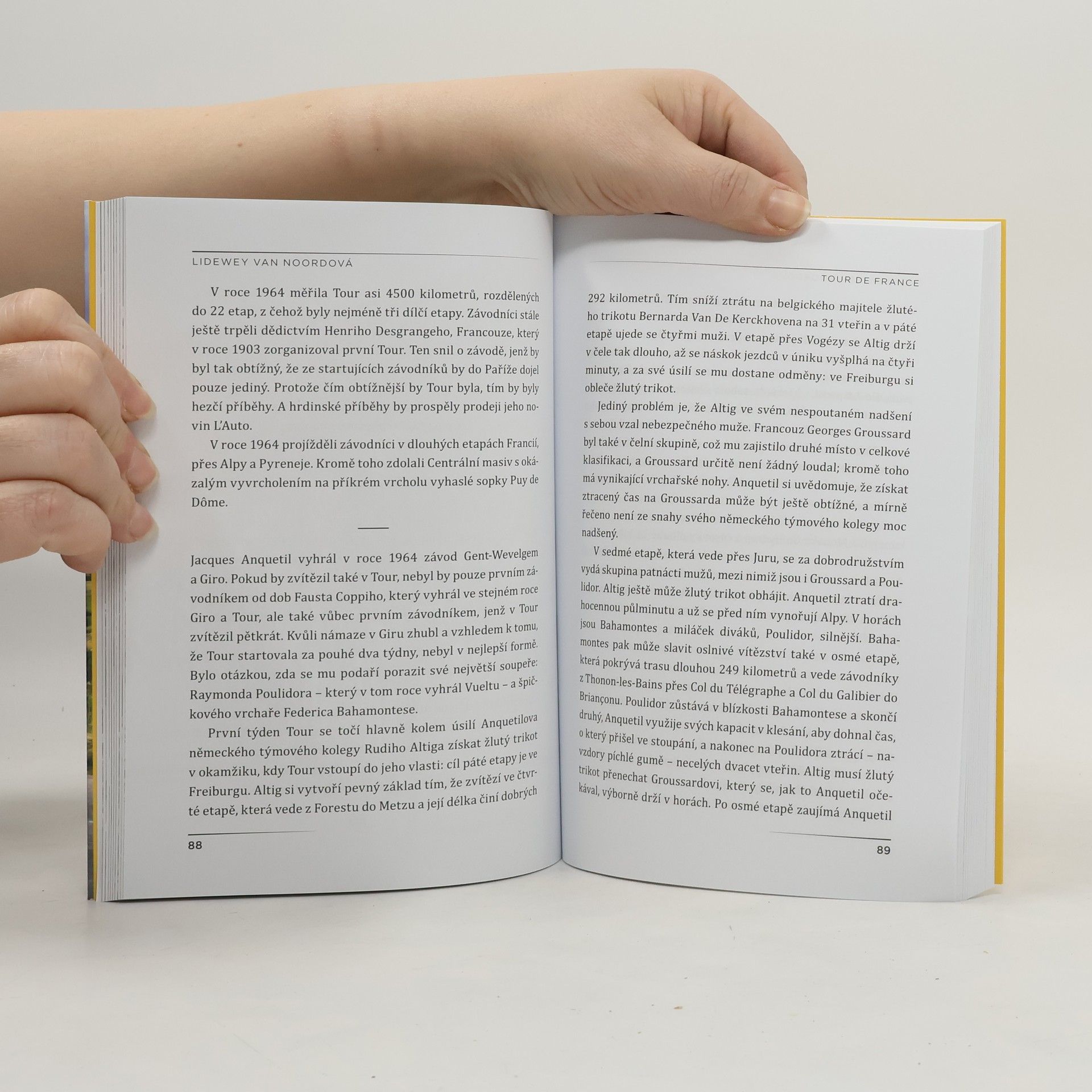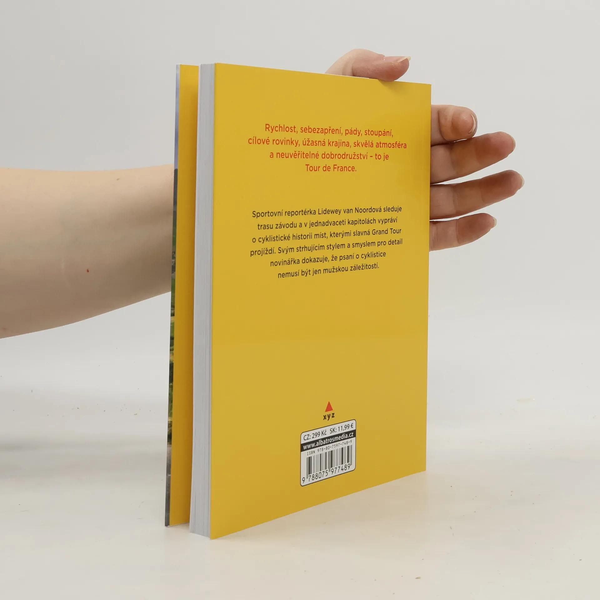 Hrdinství, pády, rychlost, sebezapření, doping, kopce, cílové rovinky, úžasná krajina, skvělá atmosféra a jedno neuvěřitelné dobrodružství – to je Tour de France. Sportovní redaktorka Lidewey van Noord sleduje trasu závodu a v jednadvaceti kapitolách vypráví o cyklistické historii míst, kterými slavná Grand Tour projíždí. Svým strhujícím stylem a smyslem pro důležitý detail nizozemská novinářka dokazuje, že psaní o cyklistice nemusí být jen mužskou záležitostí.