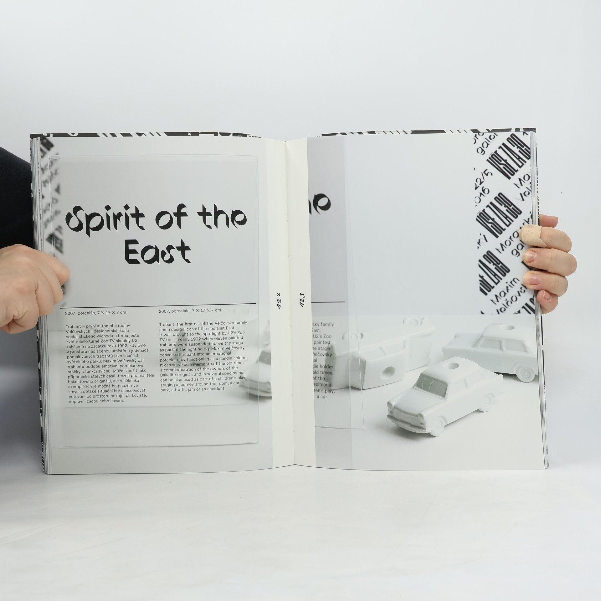 Katalog je v případě stejnojmenné výstavy Maxima Velčovského v Moravské galerii nedílnou součástí celého projektu víc než obvykle. Nejen, že je podobně jako expozice, absolutně nejrozsáhlejší prezentací tohoto ikonického designéra, ale unikátní je i jeho koncept těsně svázaný s výstavním prostorem. Ani jeden z textů v něm se nesází, ale jsou - stejně jako vystavené práce - přefocovány coby popisky ve formě glos ke každému objektu přímo v expozici. Texty se navíc nacházejí na plexisklových stojanech, takže někdy snímky v jediném originálním obraze zachycují současně písemnou informaci i designový produkt za ním.
