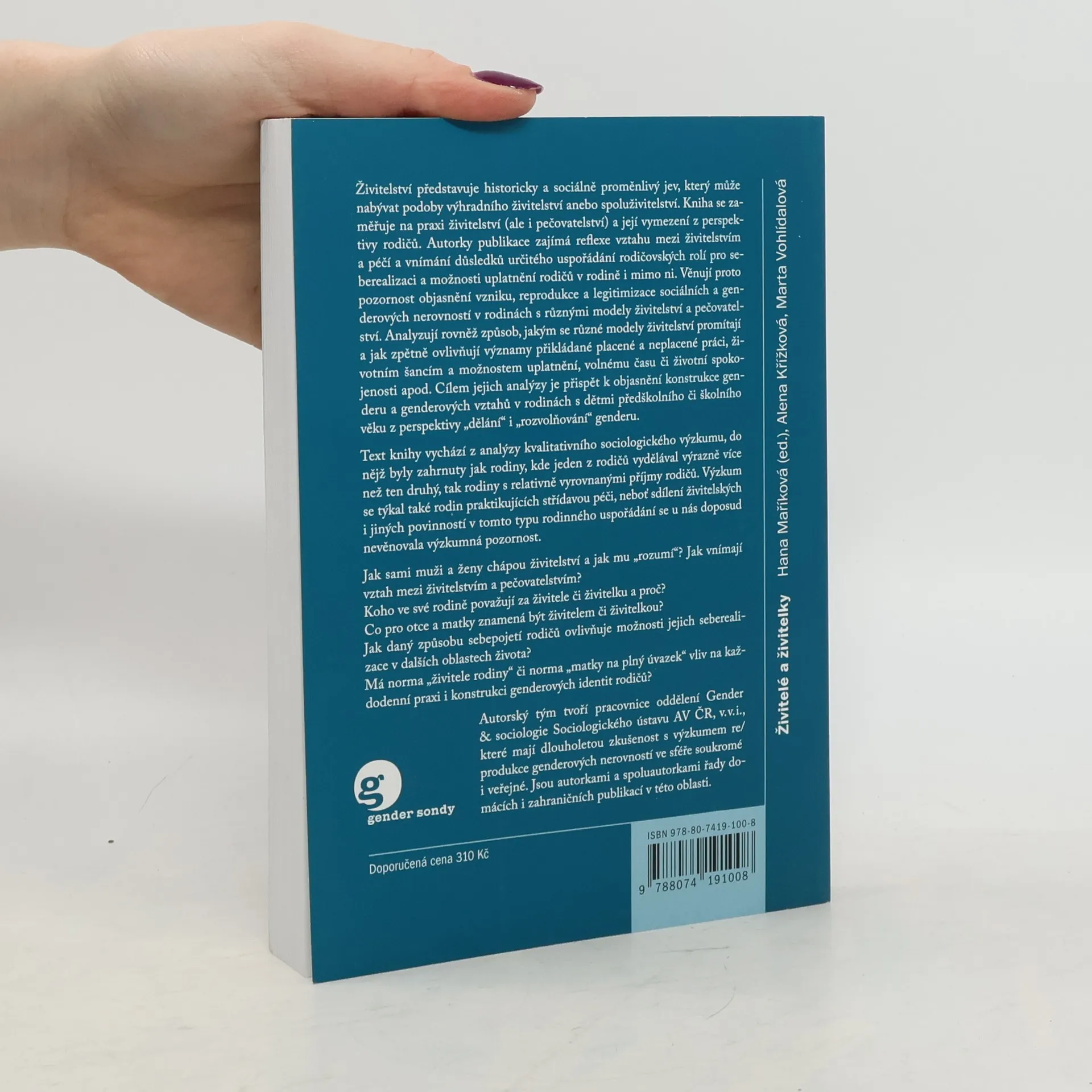 Živitelství představuje historicky a sociálně proměnlivý jev, který může nabývat podoby výhradního či převážně mužského anebo ženského živitelství či spoluživitelství. Kniha se zaměřuje na praxi živitelství (ale i pečovatelství) a její vymezení z perspektivy rodičů. Autorky publikace zajímá reflexe vztahu mezi živitelstvím a péčí a vnímání důsledků určitého uspořádání rodičovských rolí pro seberealizaci a možnosti uplatnění rodičů v rodině i mimo ni. Věnují proto pozornost objasnění vzniku, reprodukce a legitimizace sociálních a genderových nerovností v rodinách s různými modely živitelství a pečovatelství. Analyzují rovněž způsob, jakým se různé modely živitelství promítají a jak zpětně ovlivňují významy přikládané placené a neplacené práci, životním šancím a možnostem uplatnění, volnému času či životní spokojenosti apod. Cílem jejich analýzy je přispět k objasnění konstrukce genderu a genderových vztahů v rodinách s dětmi předškolního či školního věku z perspektivy „dělání“ i „rozvolňování“ genderu. Text knihy vychází z analýzy kvalitativního sociologického výzkumu, do nějž byly zahrnuty jak rodiny, kde jeden z rodičů vydělával výrazně více než ten druhý, tak rodiny s relativně vyrovnanými příjmy rodičů. Výzkum se týkal také rodin praktikujících střídavou péči, neboť sdílení živitelských i jiných povinností v tomto typu rodinného uspořádání se u nás doposud nevěnovala výzkumná pozornost.