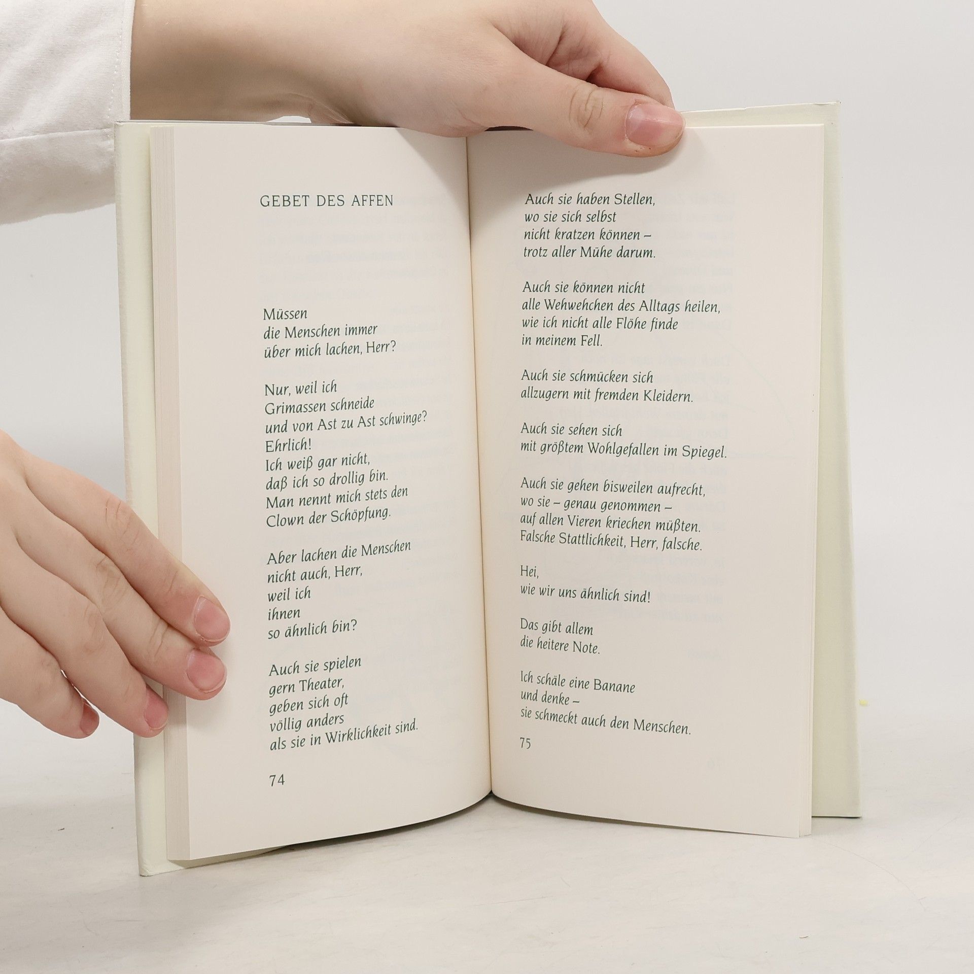 Tiere preisen Gott den Herrn für Ihre einzigartigen Fähigkeiten. Der Benediktiner Drutmar Cremer hört ihnen zu. Die Schnecke, ganz bescheiden, mahnt alle Gehezten dieser Welt, sie sollten sich ein Beispiel an ihr nehmen. „Ich komme immer an. Auch ohne Herzinfarkt“. Das Chamäleon dagegen meint: „Du hast mir die Zaubergabe der Verwandlung verliehen. Ich liebe das Inkognito, Herr. Nur so kann ich meine Leckerbissen vom Strauch nebenan mühelos fangen“. Oder der Floh, der im Monolog mit Gott nicht mit seinem schlechten Image hadert: „Gewiß, mein Auftreten ist ungefragt aber pure Caritas. Ich verhelfe zur Erfahrung der Wirklichkeit, zur Einsicht in die harten Seiten des irdischen Daseins“.