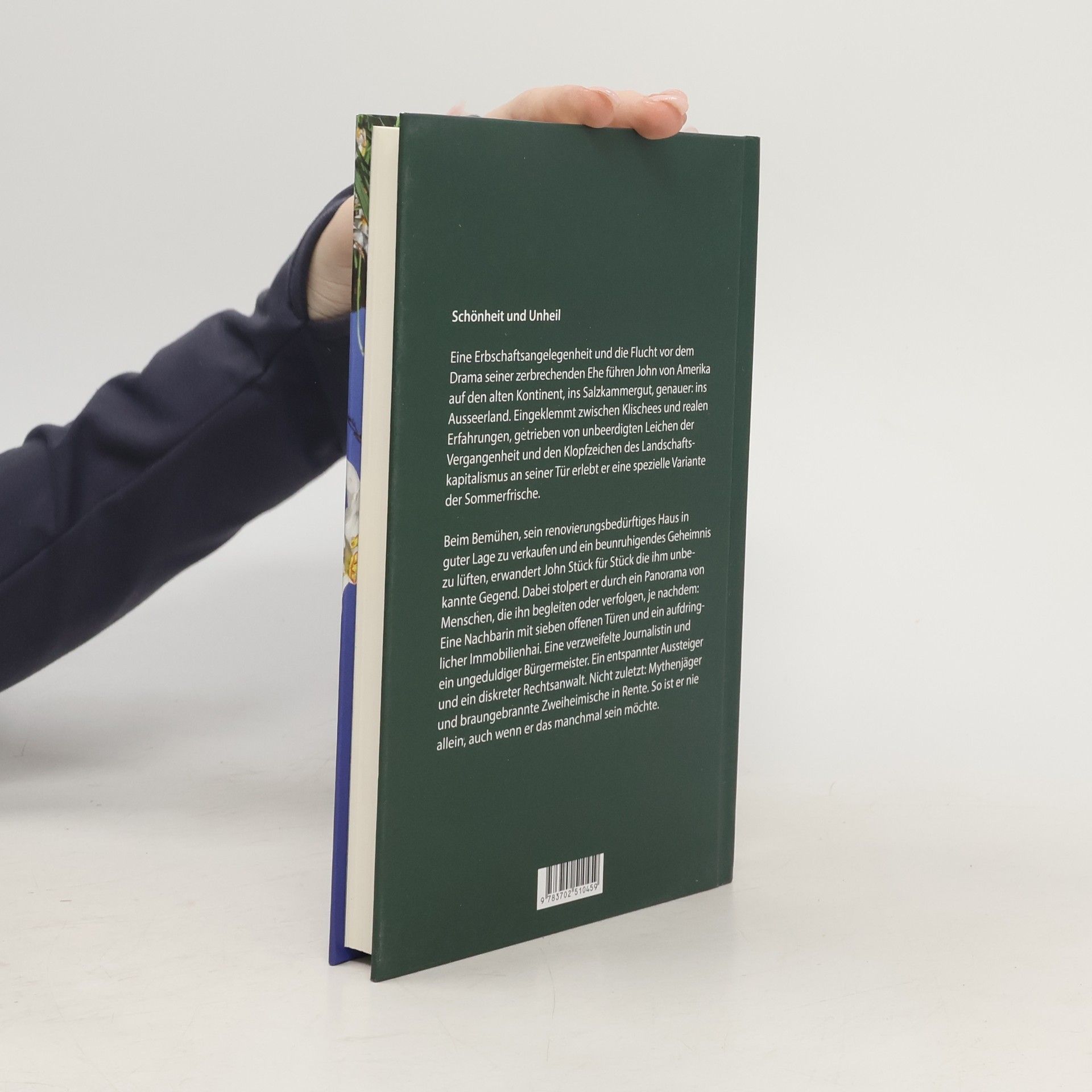 Schönheit und Unheil Eine Erbschaftsangelegenheit und die Flucht vor dem Drama seiner zerbrechenden Ehe führen John von Amerika auf den alten Kontinent, ins Salzkammergut. Genauer: ins Ausseerland. Auf einer Wiese über seinem geerbten kleinen Anwesen sitzend, vereinigt sich für ihn der Anblick aus Wäldern, Bergen und See zu einem Gesamtkunstwerk. Ein erster Friede überkommt ihn. Gleichzeitig verspürt er eine leichte Unruhe. Liegen Schönheit und Unheil so nah beisammen? Eingeklemmt zwischen Klischees und realen Erfahrungen, getrieben von unbeerdigten Leichen der Vergangenheit und den Klopfzeichen des Landschaftskapitalismus an seiner Haustür erlebt John eine spezielle Variante der Sommerfrische. Beim Bemühen, sein renovierungsbedürftiges Haus in guter Lage zu verkaufen und ein beunruhigendes Geheimnis zu lüften, erwandert er Stück für Stück die ihm unbekannte Gegend. Dabei stolpert er durch ein Panorama von Menschen, die ihn begleiten oder verfolgen, je nachdem: eine Nachbarin mit sieben offenen Türen und ein aufdringlicher Immobilienhai. Eine verzweifelte Journalistin und ein ungeduldiger Bürgermeister. Ein entspannter Aussteiger und ein diskreter Rechtsanwalt. Nicht zuletzt: Mythenjäger und braungebrannte Zweiheimische in Rente. So ist er nie allein, auch wenn er das manchmal sein möchte.
