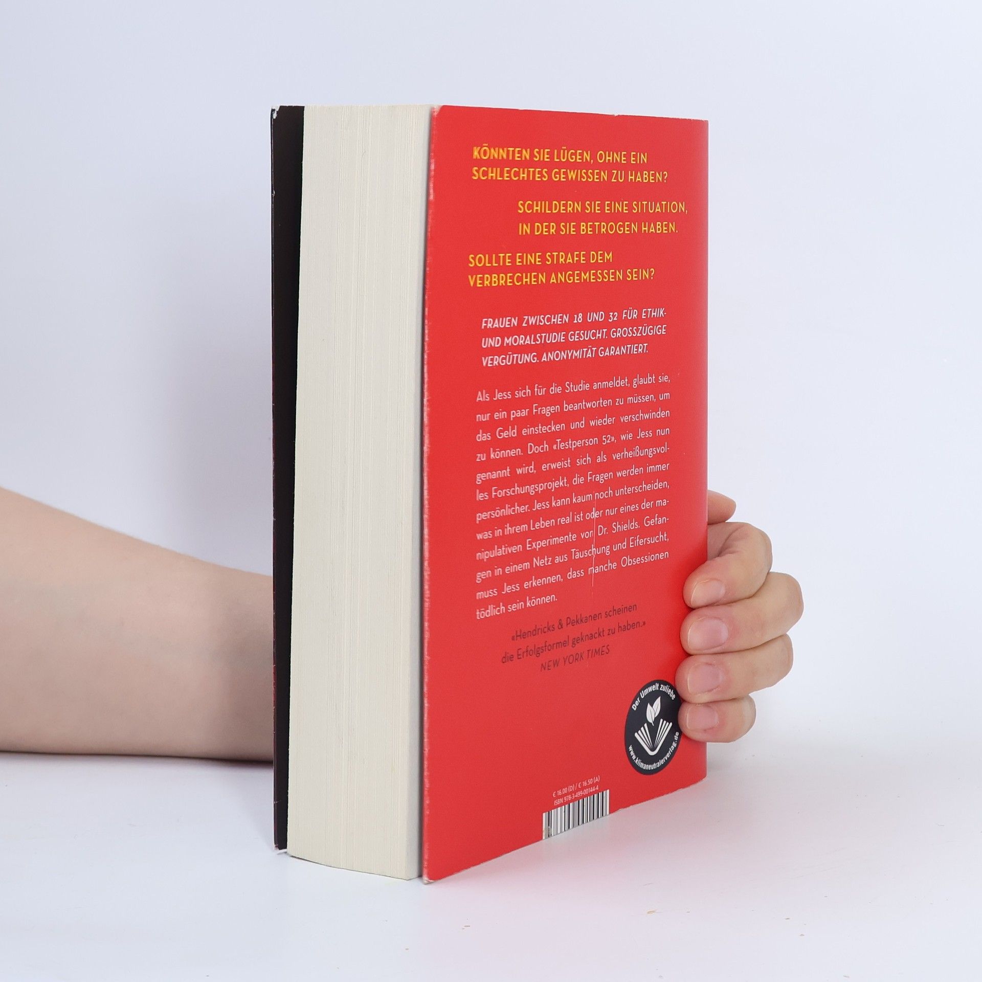 Die Nr. 1 der New York Times-Bestsellerliste Frauen zwischen 18 und 32 für Ethik- und Moralstudie gesucht. Großzügige Vergütung. Anonymität garantiert. Als Jess sich für die Studie anmeldet, glaubt sie, nur ein paar Fragen beantworten zu müssen, um das Geld einstecken und wieder verschwinden zu können. Doch „Testperson 52“, wie Jess nun genannt wird, erweist sich als verheißungsvolles Forschungsprojekt, die Fragen werden immer persönlicher. Jess kann kaum noch unterscheiden, was in ihrem Leben real ist oder nur eines der manipulativen Experimente von Dr. Shields. Gefangen in einem Netz aus Täuschung und Eifersucht muss Jess erkennen, dass manche Obsessionen tödlich sein können. Hendricks & Pekkanen «... scheinen die Erfolgsformel geknackt zu haben.» New York Times «… auf dem Höhepunkt ihres Könnens. Niemals erraten Sie das Ende.» People Magazin «Gekonnt wendungsreich mit atemberaubenden Twists ... Spannung der Extra-Klasse.» Publishers Weekly «Meisterhaft steigende Spannung, die den Leser bis zuletzt im Dunkeln lässt.» Booklist