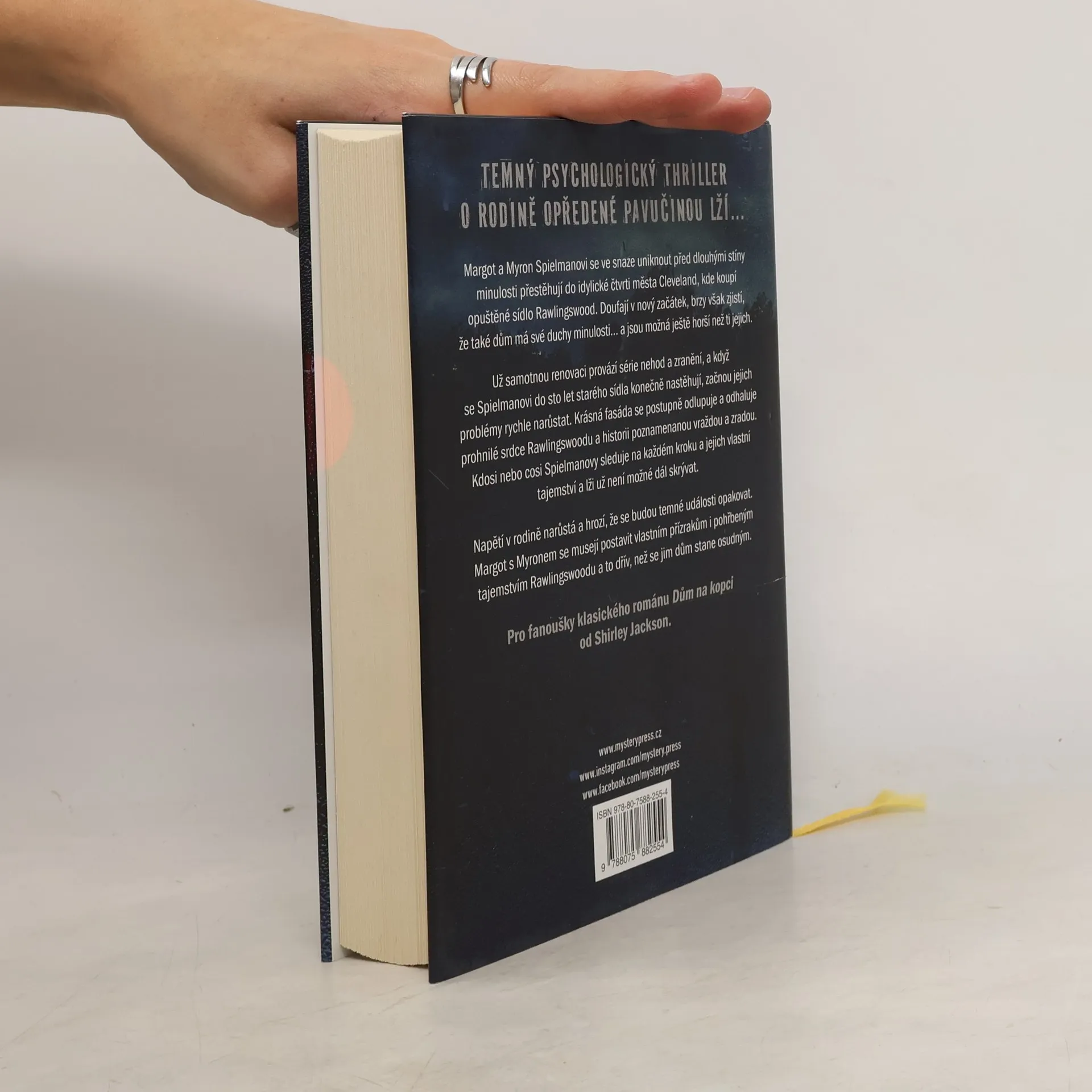 TEMNÝ PSYCHOLOGICKÝ THRILLER O RODINĚ OPŘEDENÉ PAVUČINOU LŽÍ… Margot a Myron Spielmanovi se ve snaze uniknout před dlouhými stíny minulosti přestěhují do idylické čtvrti města Cleveland, kde koupí opuštěné sídlo Rawlingswood. Doufají v nový začátek, brzy však zjistí, že také dům má své duchy minulosti… a jsou možná ještě horší než ti jejich. Už samotnou renovaci provází série nehod a zranění, a když se Spielmanovi do sto let starého sídla konečně nastěhují, začnou jejich problémy rychle narůstat. Krásná fasáda se postupně odlupuje a odhaluje prohnilé srdce Rawlingswoodu a historii poznamenanou vraždou a zradou. Kdosi nebo cosi Spielmanovy sleduje na každém kroku a jejich vlastní tajemství a lži už není možné dál skrývat. Napětí v rodině narůstá a hrozí, že se budou temné události opakovat. Margot s Myronem se musejí postavit vlastním přízrakům i pohřbeným tajemstvím Rawlingswoodu a to dřív, než se jim dům stane osudným. ______ Pro fanoušky klasického románu Dům na kopci od Shirley Jackson.