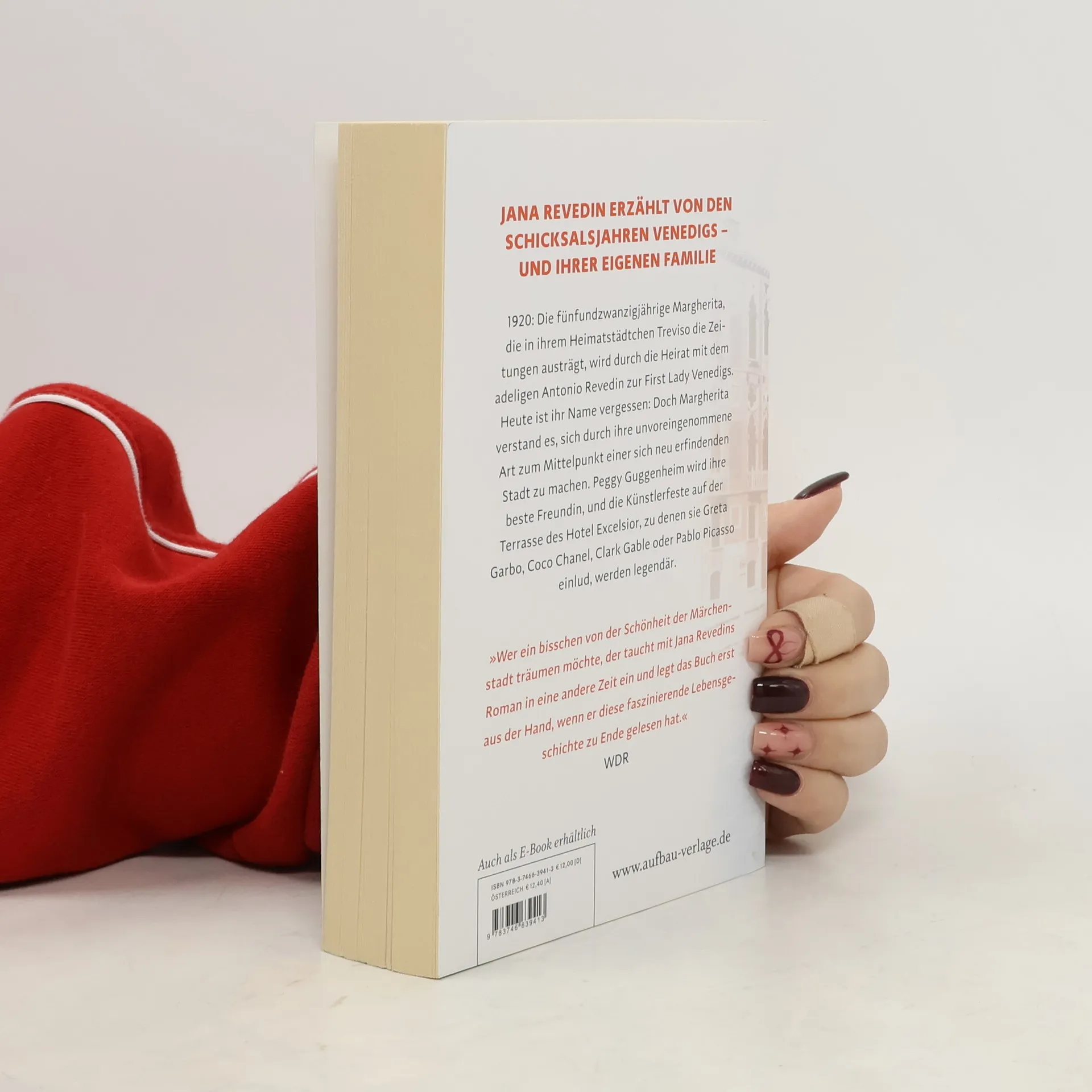 Jana Revedin erzählt von den Schicksalsjahren Venedigs – und ihrer eigenen Familie Für Peggy Guggenheim war sie die First Lady Venedigs. 1920: Die fünfundzwanzigjährige Margherita, die in ihrem Heimatstädtchen Treviso die Zeitungen austrägt, wird durch die Heirat mit dem adeligen Antonio Revedin zur First Lady Venedigs. Heute ist ihr Name vergessen: Doch Margherita verstand es, sich durch ihre unvoreingenommene Art zum Mittelpunkt einer sich neu erfindenden Stadt zu machen. Peggy Guggenheim wird ihre beste Freundin, und die Künstlerfeste auf der Terrasse des Hotel Excelsior, zu denen sie Greta Garbo, Coco Chanel, Clark Gable oder Pablo Picasso einlud, werden legendär. „Wer ein bisschen von der Schönheit der Märchenstadt träumen möchte, der taucht mit Jana Revedins Roman in eine andere Zeit ein und legt das Buch erst aus der Hand wenn er diese faszinierende Lebensgeschichte zu Ende gelesen hat.“ WDR