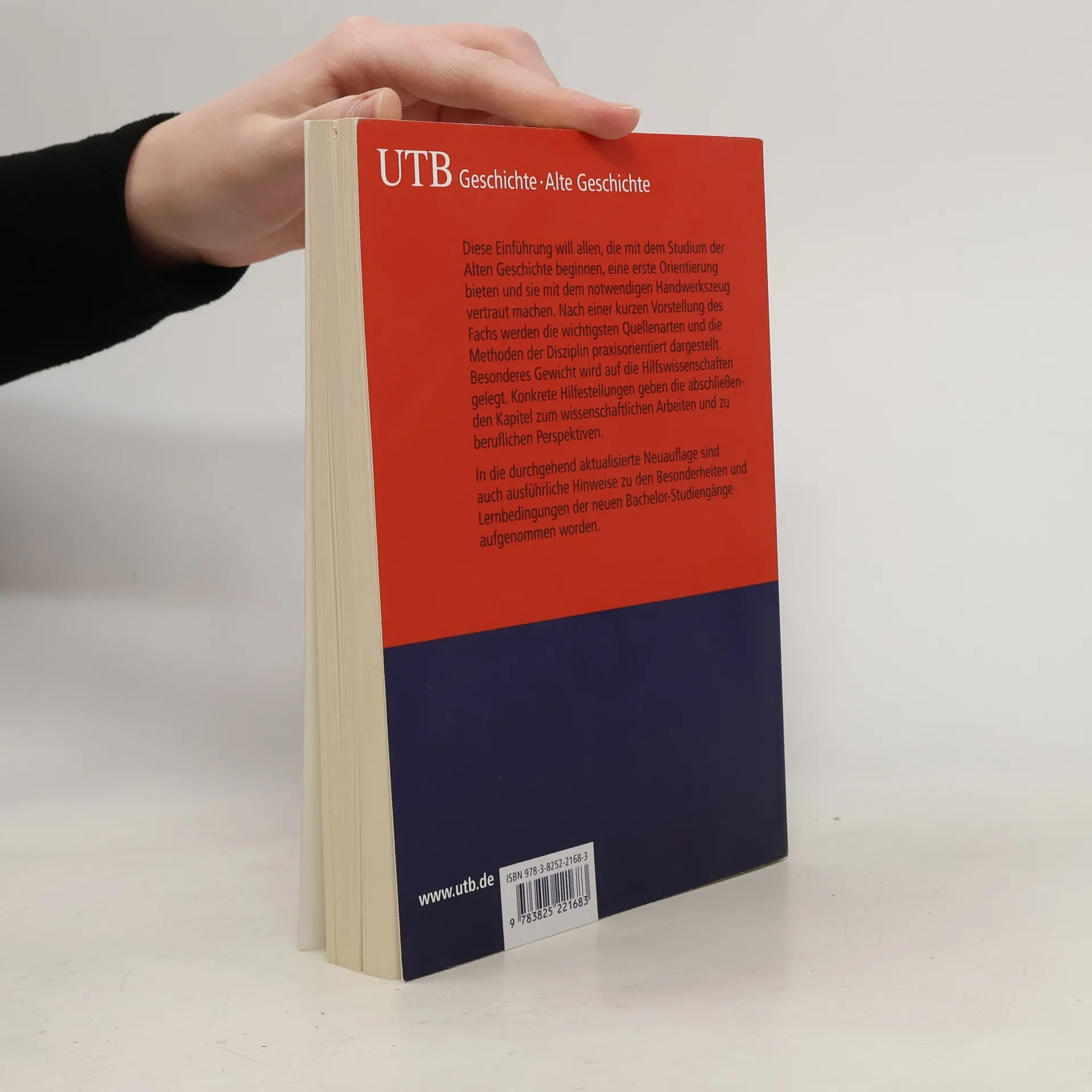 Diese Einführung will allen, die mit dem Studium der Alten Geschichte beginnen, eine erste Orientierung bieten und sie mit dem notwendigen Handwerkszeug vertraut machen. Nach einer kurzen Vorstellung des Fachs werden die wichtigsten Quellenarten und die Methoden der Disziplin praxisorientiert dargestellt. Besonderes Gewicht wird auf die Hilfswissenschaften gelegt. Konkrete Hilfestellungen geben die abschließenden Kapitel zum wissenschaftlichen Arbeiten und zu beruflichen Perspektiven. In die durchgehend aktualisierte Neuauflage sind auch ausführliche Hinweise zu den Besonderheiten und Lernbedingungen der neuen Bachelor-Studiengänge aufgenommen worden.