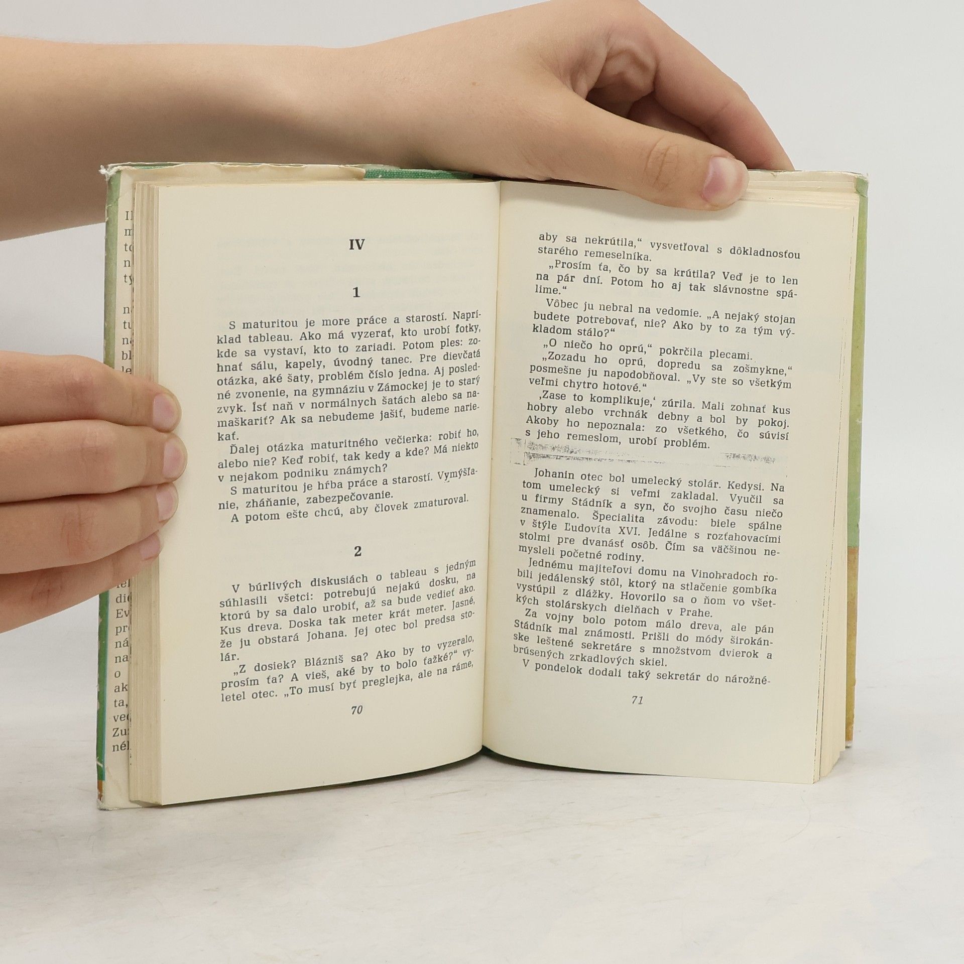 Román je o študentoch jedného pražského gymnázia, o ich živote niekoľko týždňov pred maturitou. Ocitneme sa na lyžiarskom zájazde, na maturitnom plese, zúčastníme sa na príprave maturitného tableau, prežívame posledné chvíle v školských laviciach i strasti a radosti maturantov mimo školy,kým nadíde slávna chvíľa, keď budú študenti IV.B zo Zámockej ulice stáť pred skúšobnou komisiou, kým sa stanú dospelými.