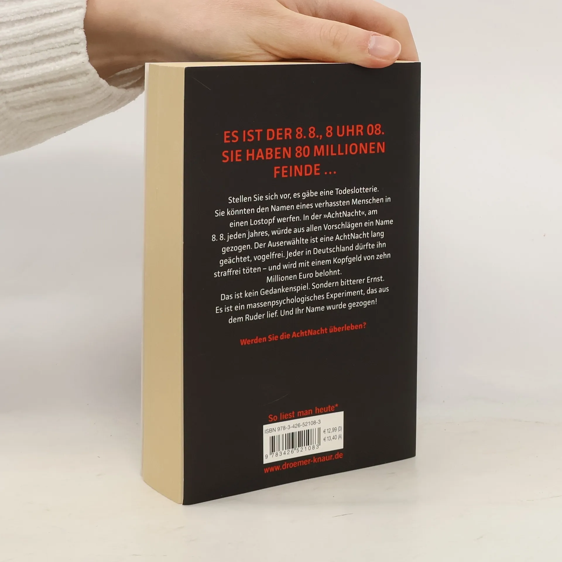 Ein furioser Thriller von Sebastian Fitzek, basierend auf einer großartigen Wahn-Idee: Was wäre, wenn du einen Menschen deiner Wahl straflos töten darfst? Es ist der 8. 8., acht Uhr acht. Du hast 80 Millionen Feinde. Wirst du die AchtNacht überleben? Stell dir vor, es gibt eine Todeslotterie. Du kannst den Namen eines verhassten Menschen in einen Lostopf werfen. In der „AchtNacht“, am 8. 8. jedes Jahres, wird aus allen Vorschlägen ein Name gezogen. Der Auserwählte ist eine AchtNacht lang geächtet, vogelfrei. Jeder in Deutschland darf ihn straffrei töten - und wird mit einem Kopfgeld von zehn Millionen Euro belohnt. Das ist kein Gedankenspiel. Sondern bitterer Ernst. Es ist ein massen-psychologisches Experiment, das aus dem Ruder lief. Und dein Name wurde gezogen! Ein rasanter Action-Thriller und Bestseller von Sebastian Fitzek, dem „Meister des Wahns“ – exklusiv im Taschenbuch.