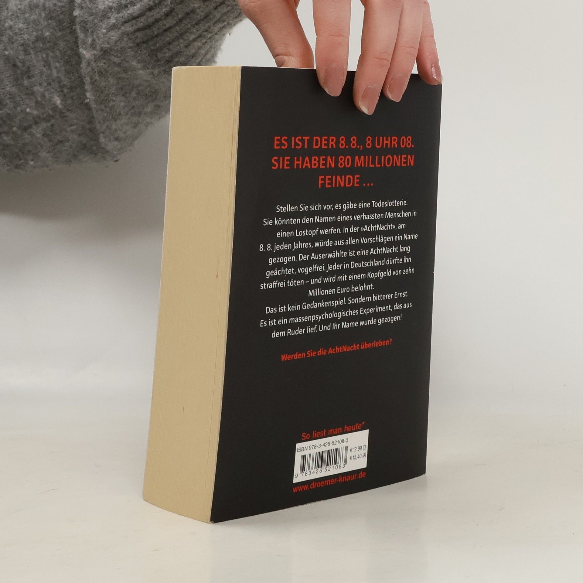 Ein furioser Thriller von Sebastian Fitzek, basierend auf einer großartigen Wahn-Idee: Was wäre, wenn du einen Menschen deiner Wahl straflos töten darfst? Es ist der 8. 8., acht Uhr acht. Du hast 80 Millionen Feinde. Wirst du die AchtNacht überleben? Stell dir vor, es gibt eine Todeslotterie. Du kannst den Namen eines verhassten Menschen in einen Lostopf werfen. In der „AchtNacht“, am 8. 8. jedes Jahres, wird aus allen Vorschlägen ein Name gezogen. Der Auserwählte ist eine AchtNacht lang geächtet, vogelfrei. Jeder in Deutschland darf ihn straffrei töten - und wird mit einem Kopfgeld von zehn Millionen Euro belohnt. Das ist kein Gedankenspiel. Sondern bitterer Ernst. Es ist ein massen-psychologisches Experiment, das aus dem Ruder lief. Und dein Name wurde gezogen! Ein rasanter Action-Thriller und Bestseller von Sebastian Fitzek, dem „Meister des Wahns“ – exklusiv im Taschenbuch.