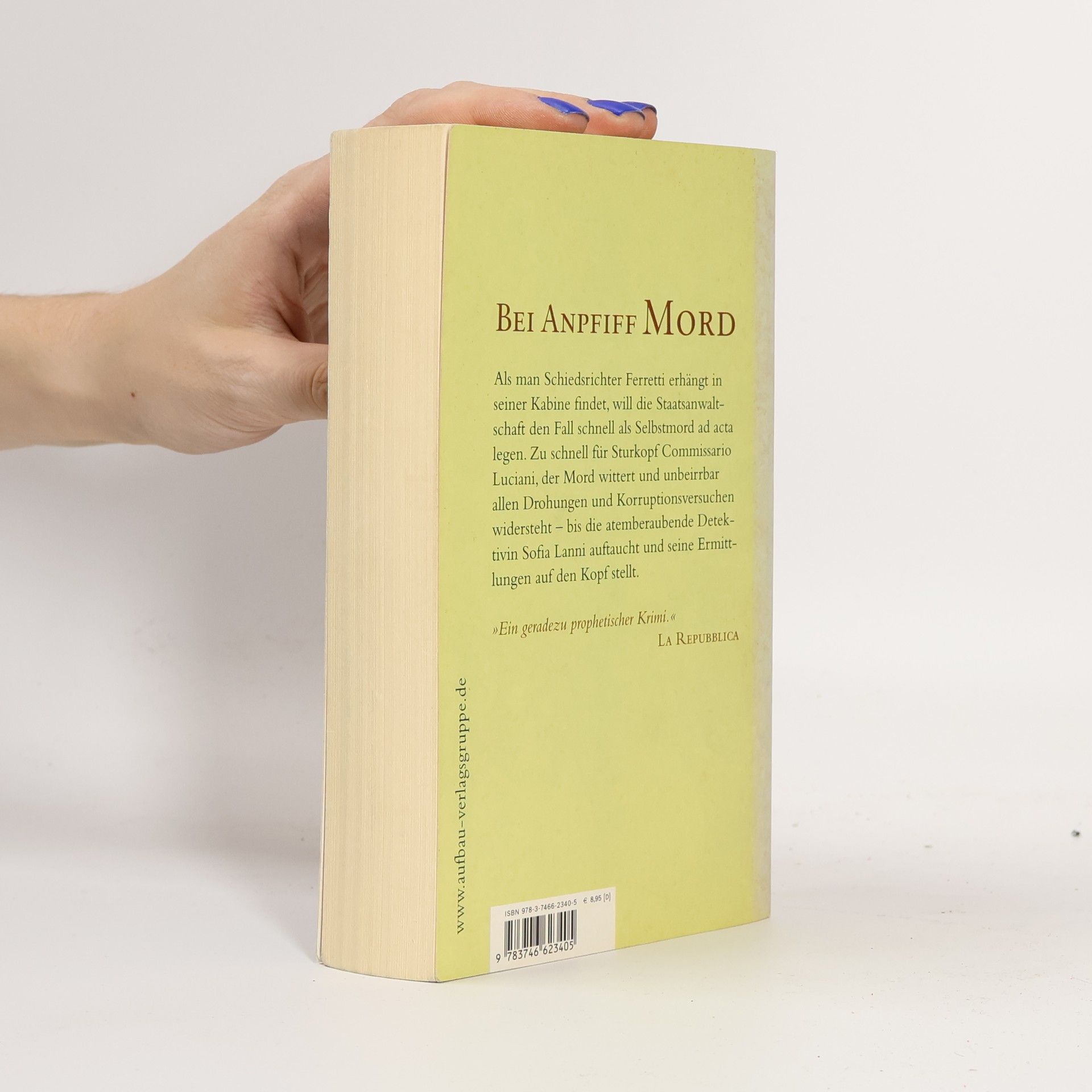 Bei Anpfiff Mord Als man Schiedsrichter Ferretti erhängt in seiner Kabine findet, will die Staatsanwaltschaft den Fall schnell als Selbstmord ad acta legen. Zu schnell für Sturkopf Commissario Luciani, der Mord wittert und unbeirrbar allen Drohungen und Korruptionsversuchen widersteht - bis die atemberaubende Detektivin Sofia Lanni auftaucht und seine Ermittlungen auf den Kopf stellt. „Ein geradezu prophetischer Krimi.“ La Repubblica