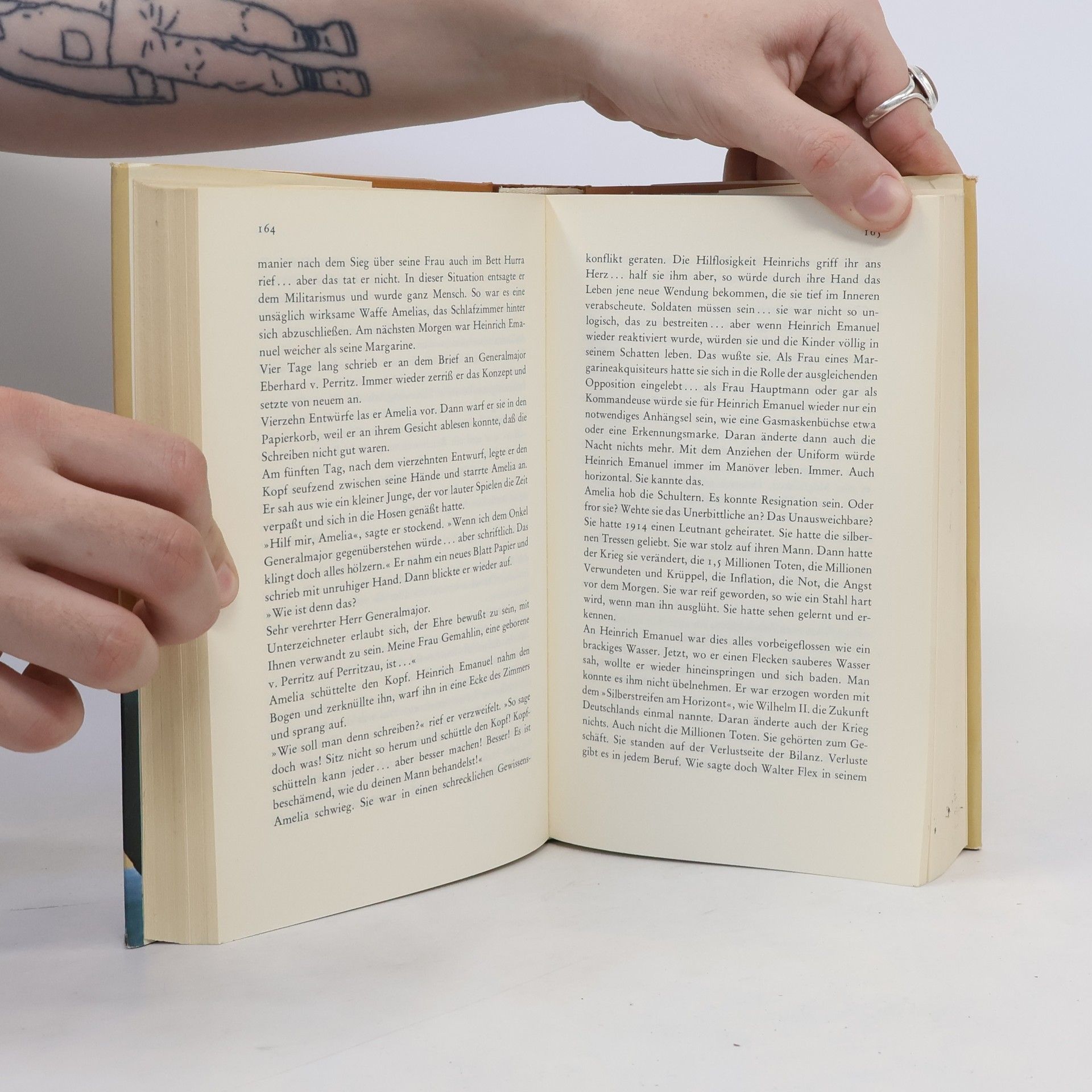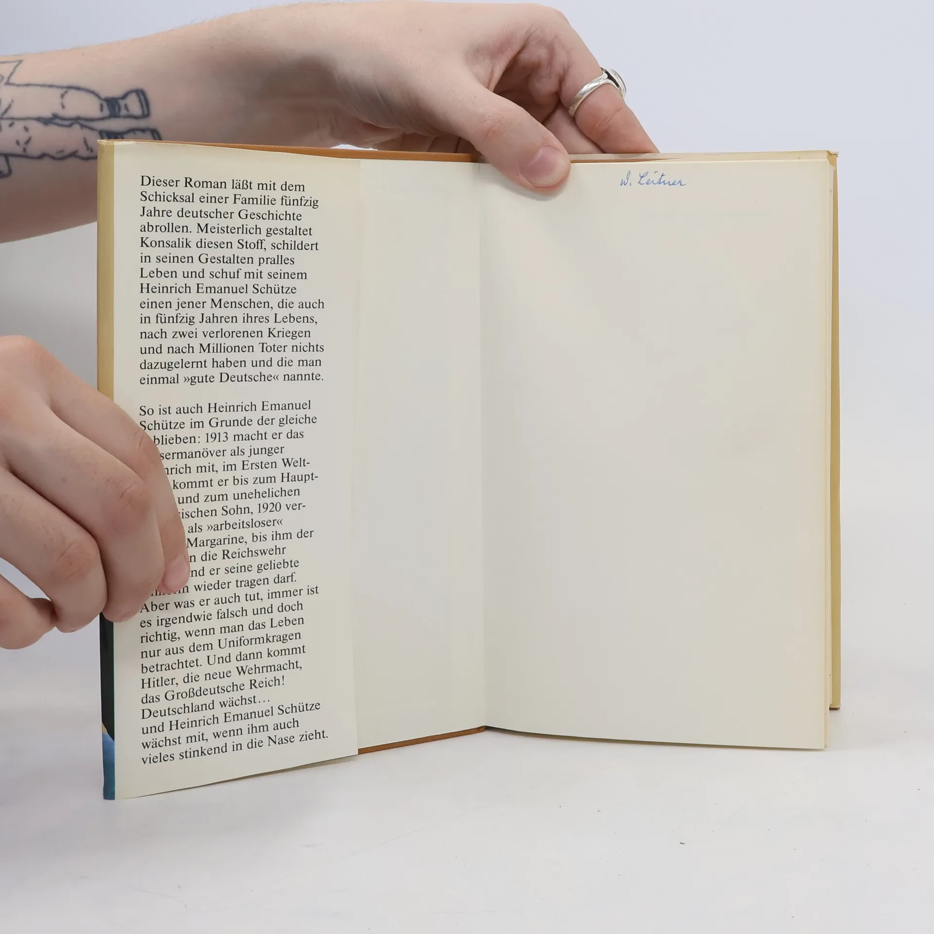 Dieser Roman ist vom Autor “allen Deutschen, die aus zwei Weltkriegen, zwei Geldentwertungen, zwei totalen Zusammenbrüchen und über 50 Millionen Kriegstoten noch nichts gelernt haben, mit Beklemmung gewidmet”. Er erzählt das Leben des “guten” Deutschen Heinrich Emanuel Schütze, den Lebenslauf eines Berufssoldaten, vom Fähnrich der kaiserlichen Armee 1913, bis zum Oberstleutnant a. D. der großdeutschen Wehrmacht und zum Textillieferanten der neuen Bundeswehr. Die Geschichte eines Mannes, der im guten Glauben dem Vaterland dient und der in fünfzig Jahren nichts dazugelernt hat, weil seine Ideale und Ansichten sich nicht geändert haben.