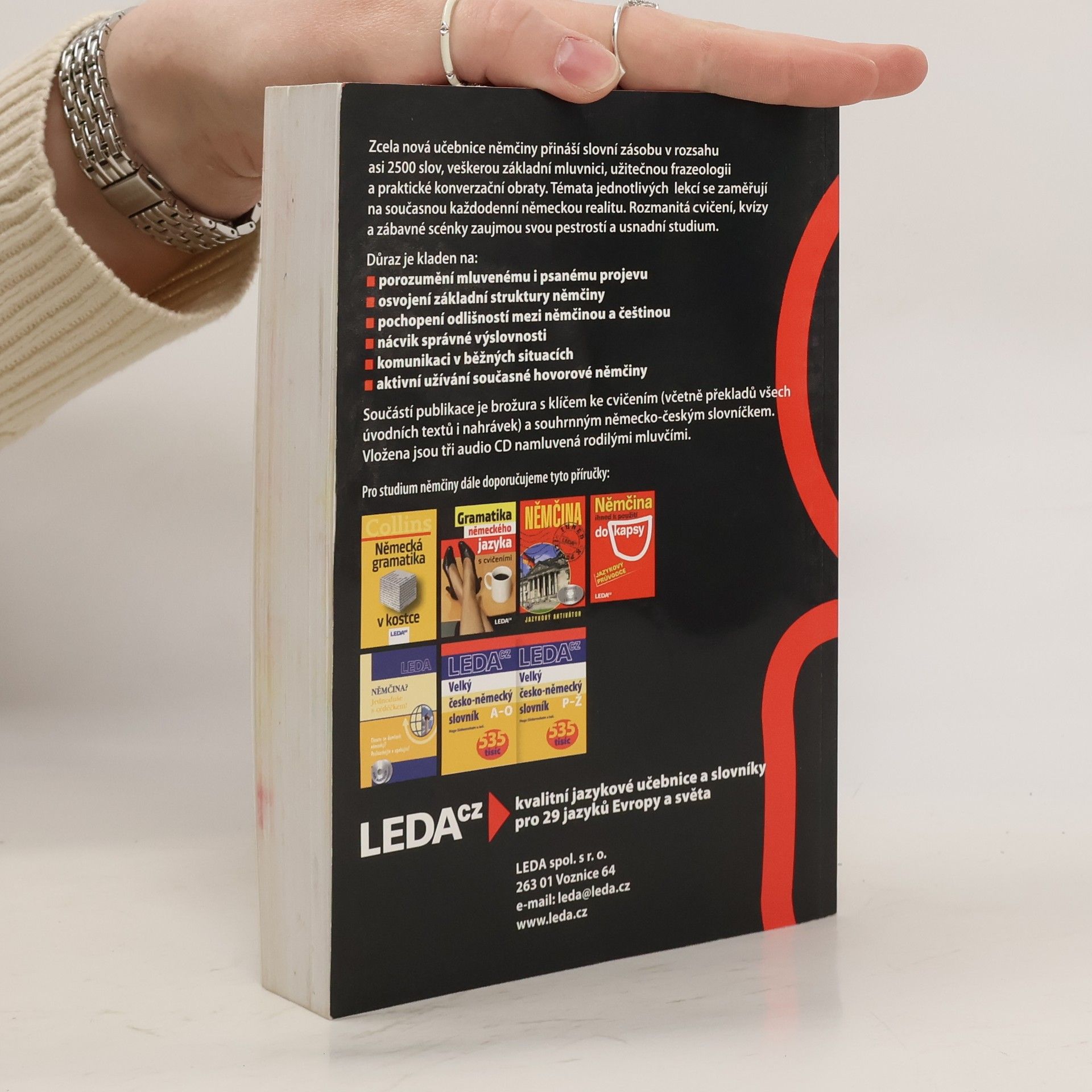 Zcela nová učebnice němčiny přináší slovní zásobu v rozsahu asi 2500 slov, veškerou základní mluvnici, užitečnou frazeologii a praktické konverzační obraty. Témata jednotlivých lekcí reflektují současný každodenní život se zaměřením na německou realitu. Rozmanitá cvičení, kvízy azábavné scénky zaujmou svou pestrostí a usnadní studium. Důraz je kladen na: - porozumění mluvenému i psanému projevu - osvojení základní struktury němčiny - pochopení odlišností mezi němčinou a češtinou - nácvik správné výslovnosti - zvládnutí komunikace v běžných situacích - aktivní užívání současné hovorové němčiny Součástí publikace je brožura s klíčem ke cvičením (včetně překladů všech úvodních textů i nahrávek) a souhrnným německo-českým slovníčkem. Vložena jsou tři audio CD namluvená rodilými mluvčími. ; Určena je pro uživatele se vstupní úrovní A1 až B1 (začátečník až mírně pokročilý), dosáhnout lze stupně pokročilosti B1 až C1 (mírně pokročilý až pokročilý).