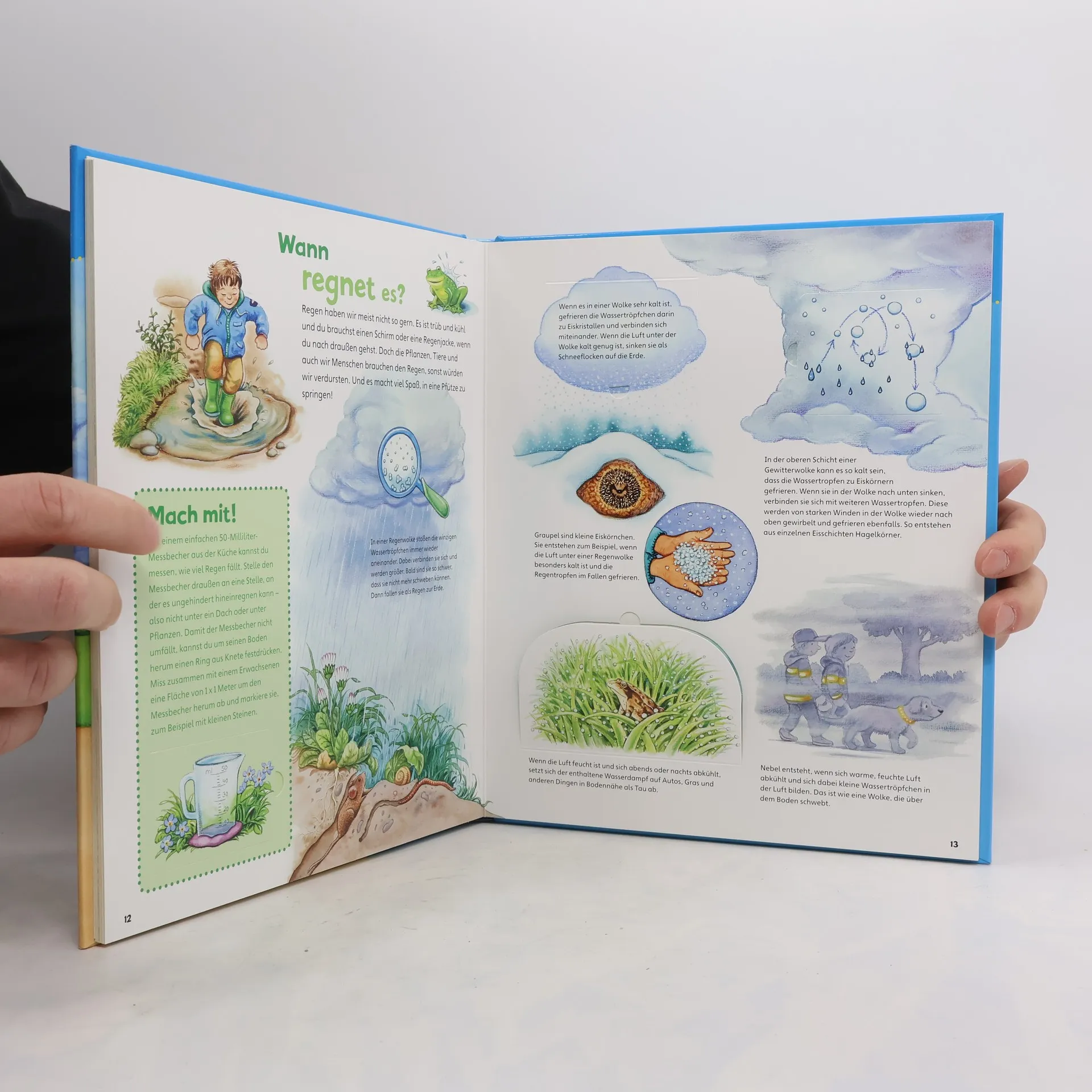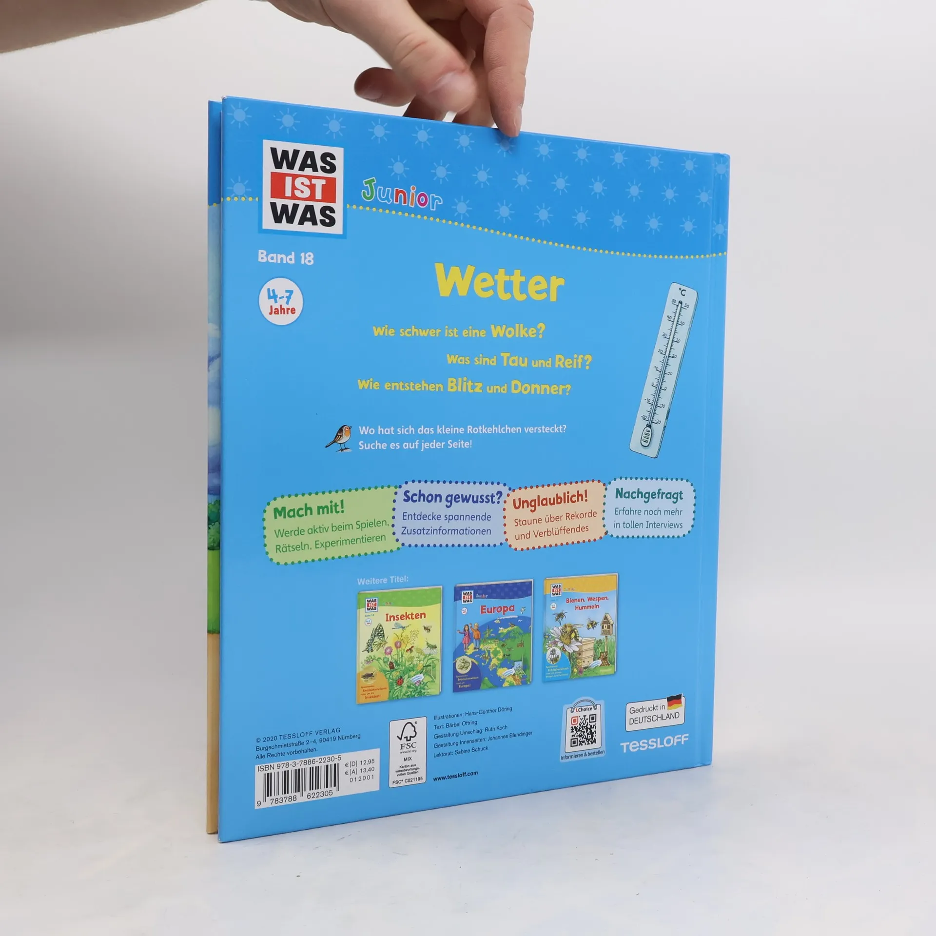 Wie schwer ist eine Wolke? Warum ist der Himmel blau? Wie entstehen Blitz und Donner? Die Antworten auf diese und viele weitere Fragen rund um das Wetter liefert das Buch aus der Reihe WAS IST WAS Junior. Kurze Texteinheiten und liebevolle Illustrationen erklären das Zusammenspiel von Sonne, Luft und Wasser altersgerecht und anschaulich. Zahlreiche Infokästen präsentieren überraschende Fakten, etwa, wie lange man mit einem Auto zur Sonne brauchen würde oder wie man sich bei einem Gewitter verhält. Außerdem gibt es viele Ideen zum Mit- und Nachmachen, zum Beispiel, wie man eine kleine Wetterstation baut oder einen Regenbogen erzeugt. Das Highlight des Buches sind die vielen Klappen, die Wetterphänomene wie das Innere einer Gewitterwolke oder den Aufbau einer Schneeflocke sichtbar machen. Für neugierige Wetterforscher ab 4 Jahren!
