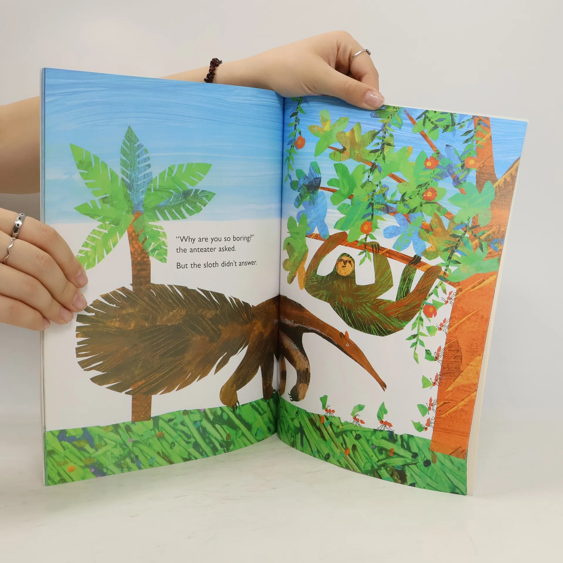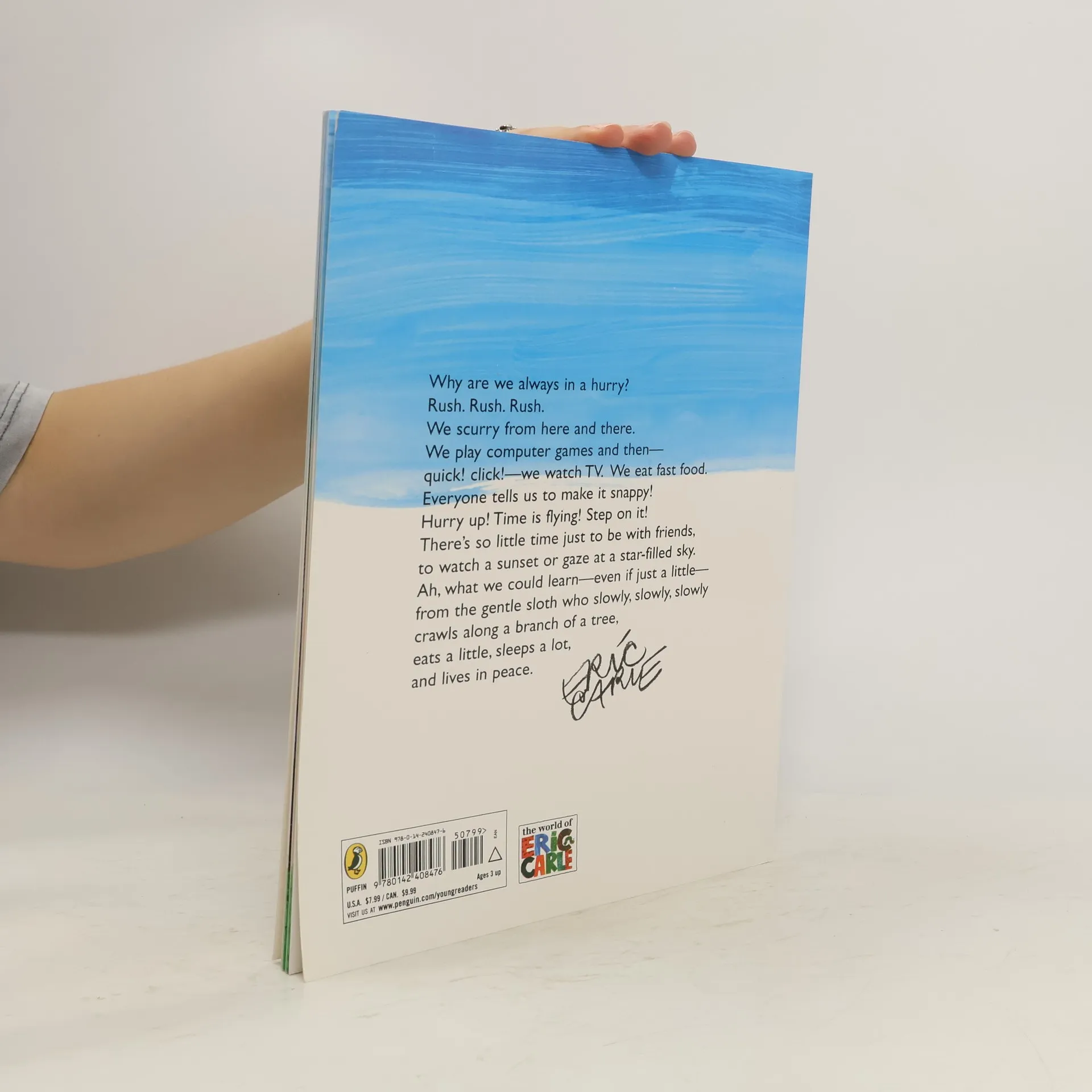 Slowly, slowly, slowly. That's the way the sloth moves. Slowly, it eats and then, slowly, it falls asleep. "What strange kind of creature is this?" the other animals wonder, "Why doesn't it run or fly or play or hunt like the rest of us?" "Why are you so slow??" the howler monkey inquires. But the sloth doesn't answer any questions until the jaguar asks, "Why are you so lazy??" Anyone who has ever felt too busy will appreciate the sloth's peaceful lifestyle and realize that it's okay to take time to enjoy life. Eric Carle's dazzling collage illustrations introduce readers to the exotic beauty of the Amazon rain forest and the many unusual animals living there.
