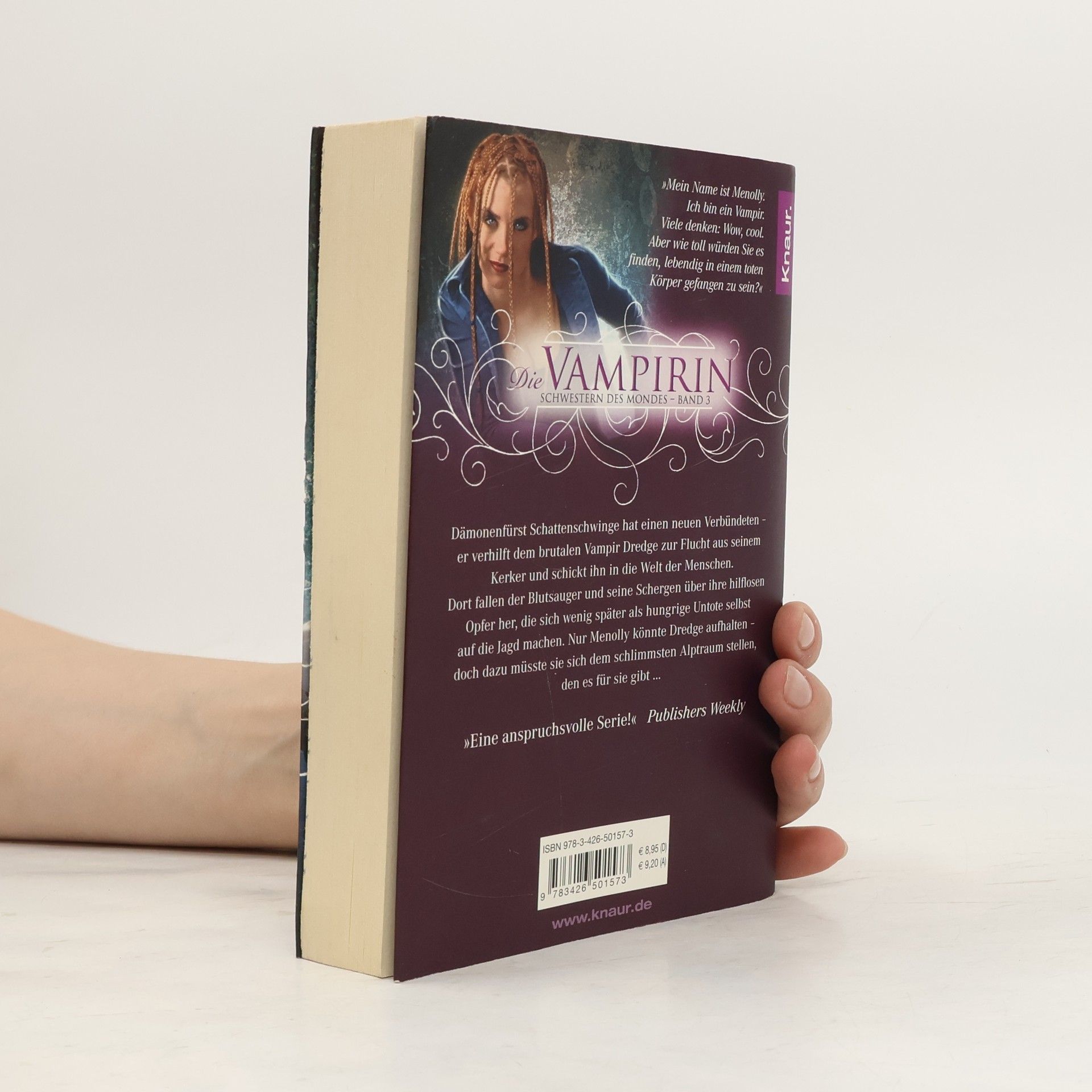 Schwestern des Mondes Band 3: Die Vampirin „Mein Name ist Menolly. Ich bin ein Vampir. Viele denken: Wow, cool. Aber wie toll würden Sie es finden, lebendig in einem toten Körper gefangen zu sein?“ Dämonenfürst Schattenschwinge hat einen neuen Verbündeten – er verhilft dem brutalen Vampir Dredge zur Flucht aus seinem Kerker und schickt ihn in die Welt der Menschen. Dort fallen der Blutsauger und seine Schergen über ihre hilflosen Opfer her, die sich wenig später als hungrige Untote selbst auf die Jagd machen. Nur Menolly könnte Dredge aufhalten – doch dazu müsste sie sich dem schlimmsten Alptraum stellen, den es für sie gibt … „Eine anspruchsvolle Serie!“ Publishers Weekly