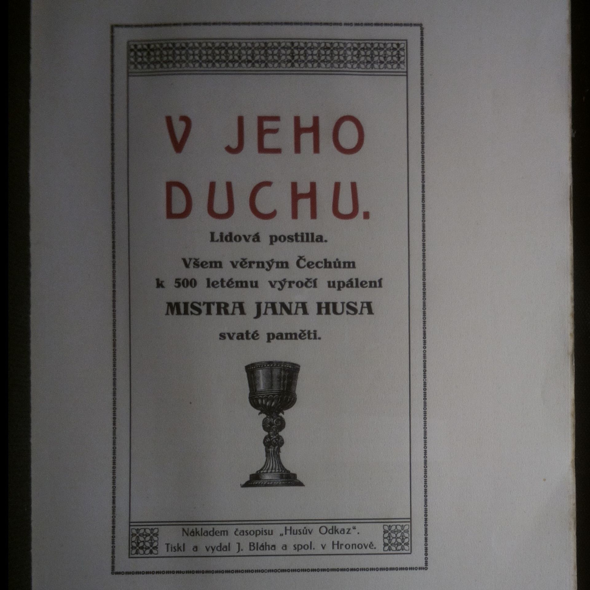 V jeho duchu. Lidová postilla. Všem věrným Čechům k 500 letému výročí upálení Mistra Jana Husa svaté paměti