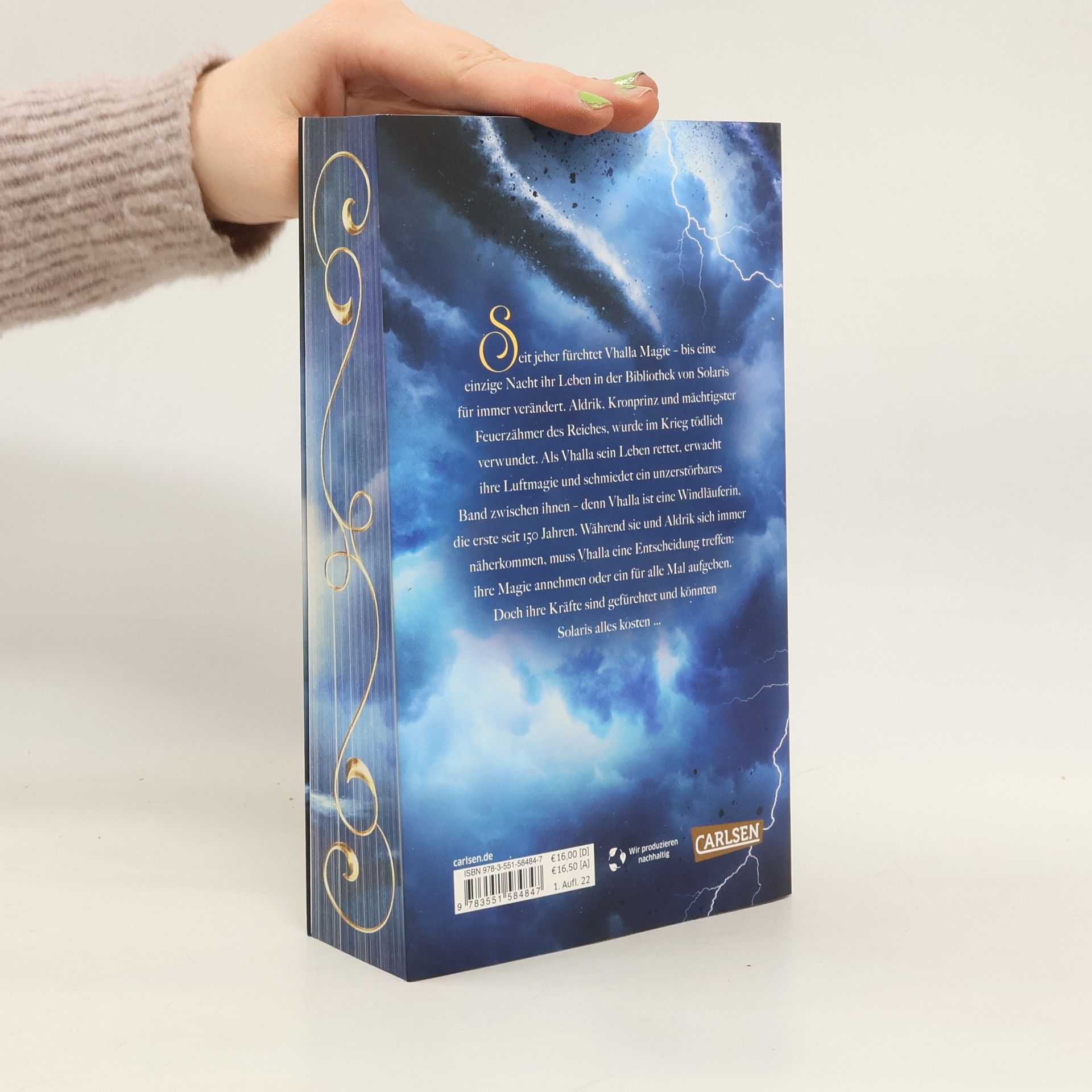Eine junge Frau entdeckt ihre verloren geglaubte Gabe, während ein Prinz mit der Macht über das Feuer in eine gefährliche Lage gerät. Vhalla führt ein glückliches Leben in ihrer Welt der Bücher, bis eine Nacht alles verändert. Aldrik, der Kronprinz und mächtigste Feuerzähmer, wird im Krieg schwer verletzt. Als Vhalla ihm das Leben rettet, erwacht ihre Magie und verbindet sie untrennbar mit Aldrik – sie ist die erste Windläuferin seit 150 Jahren. Doch ihre Luftmagie ist gefürchtet und darf niemandem, vor allem nicht dem Kaiser, bekannt werden. Während die Kämpfe im Norden toben, entwickelt sich eine tiefere Verbindung zwischen Aldrik und Vhalla. Ihre Liebe birgt jedoch das Risiko, ganz Solaris in Flammen aufgehen zu lassen. Diese magische Romantasy-Saga ist geprägt von Action, Drama und einer bittersüßen Liebe, die das Herz berührt. Leser*innen sind begeistert und schwärmen von der fesselnden Handlung und den emotionalen Wendungen, die sie bis zur letzten Seite in ihren Bann ziehen. Die Reihe umfasst fünf Bände, die die Abenteuer von Vhalla und Aldrik weiterverfolgen.